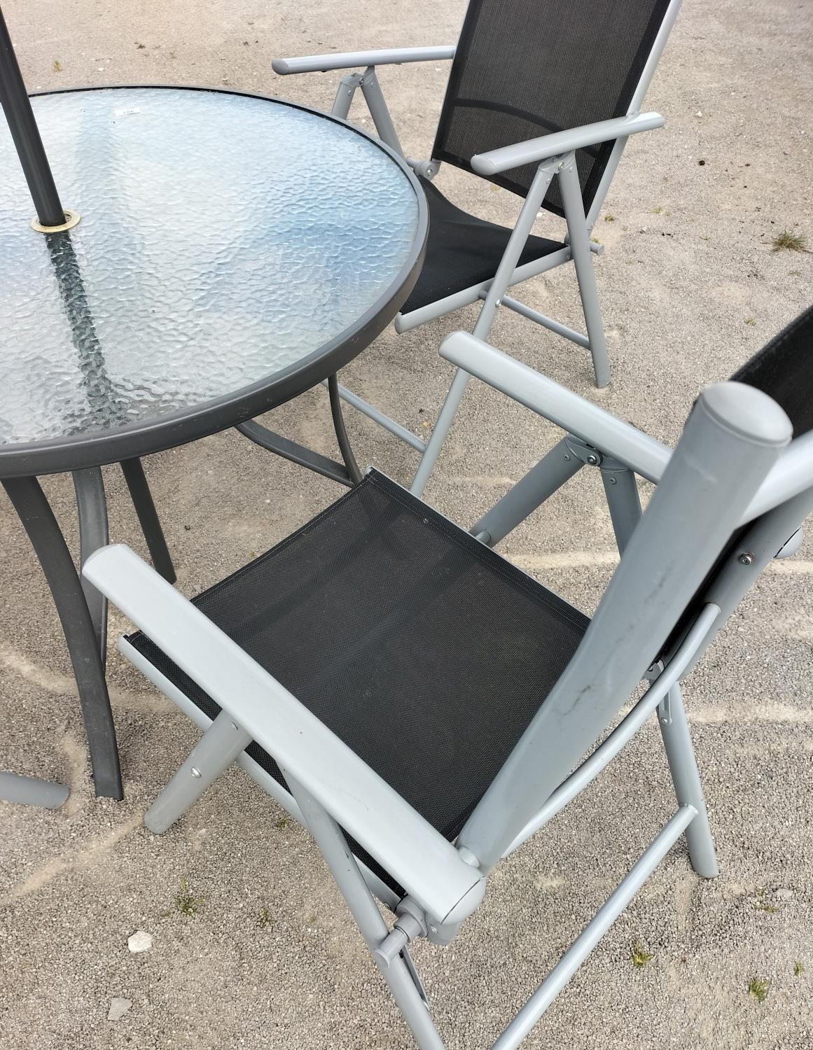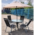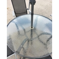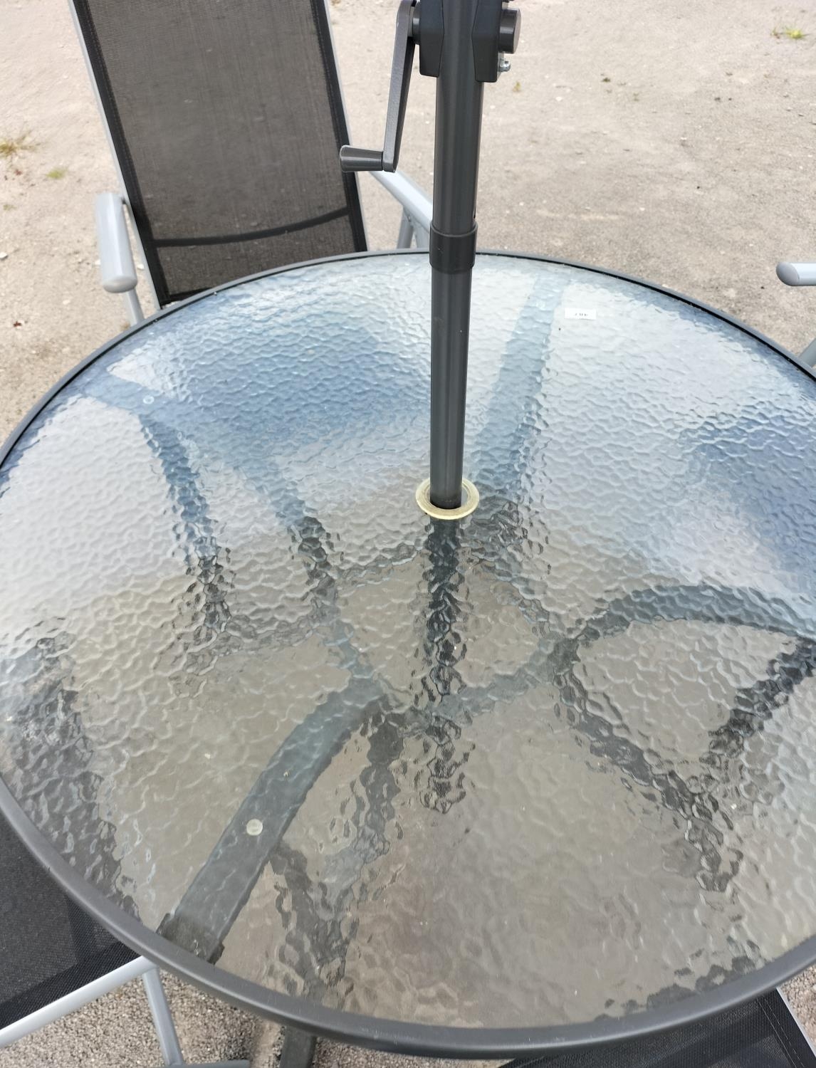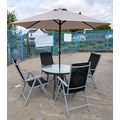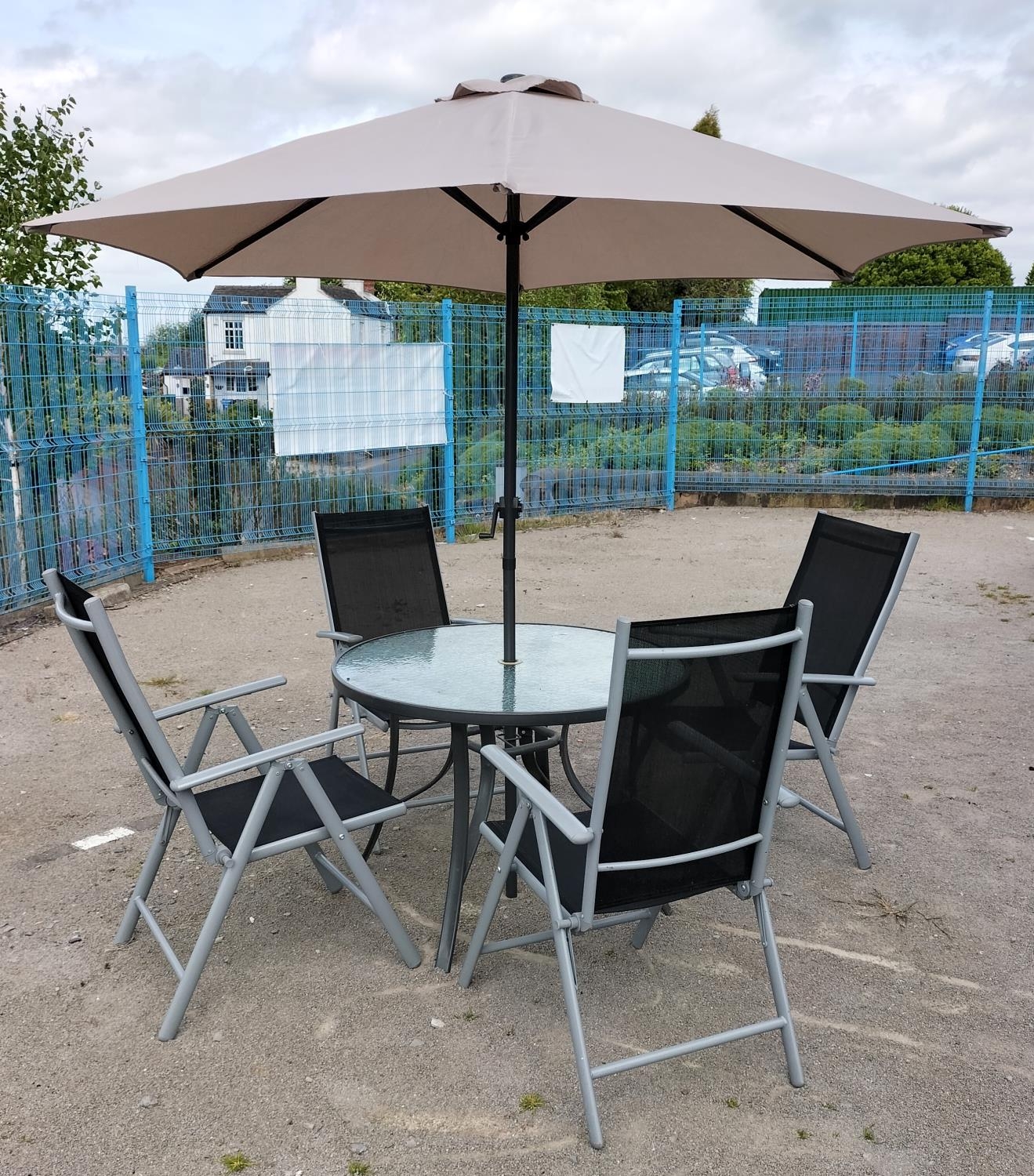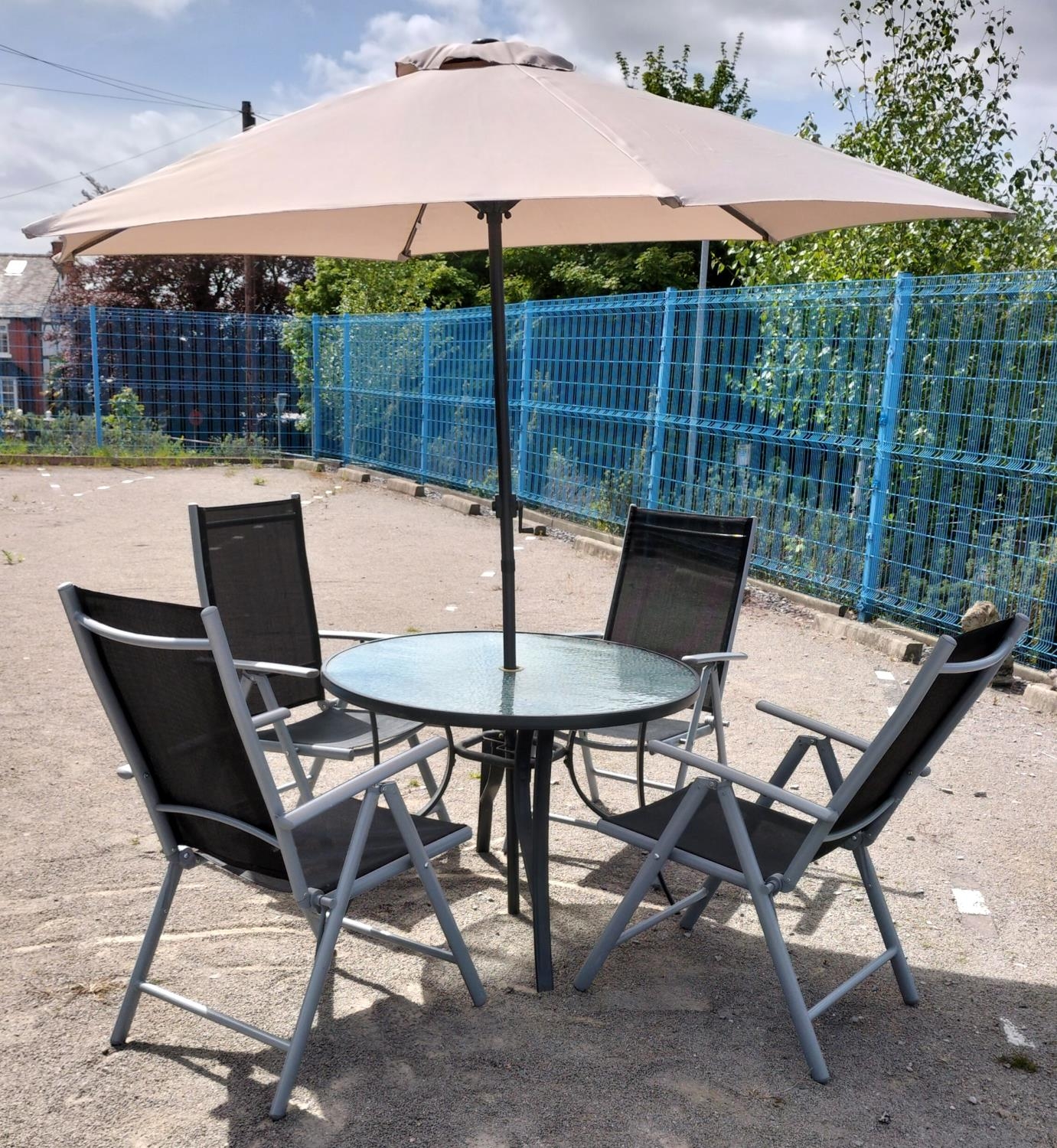 Four Seat Garden Table and Chairs with Wind Up Umbrella. This Lot is Collection Only.