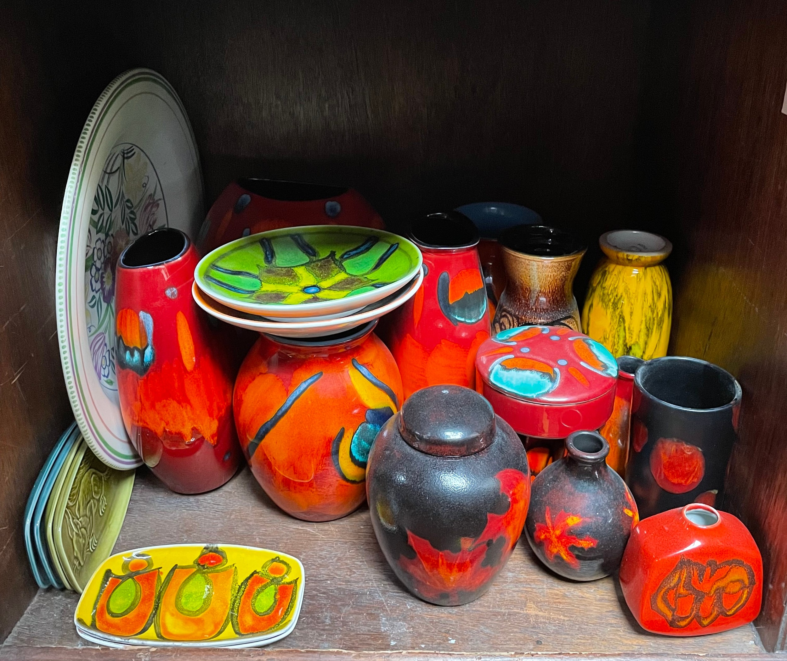 A collection of 23 assorted items of Poole pottery, comprising ginger jars, vases, chargers and smaller plates etc. some Volcano pattern wares (SECTION 48)