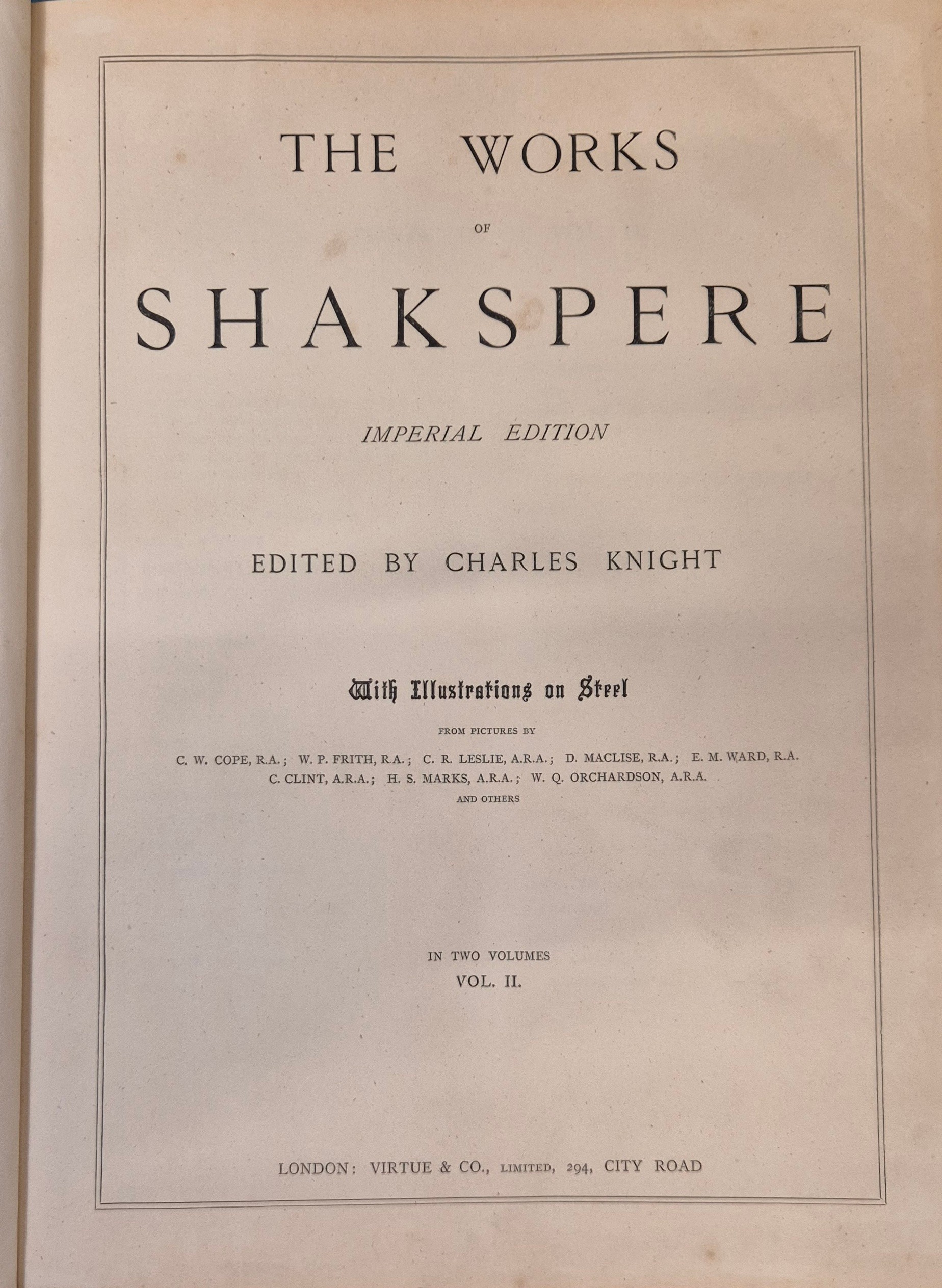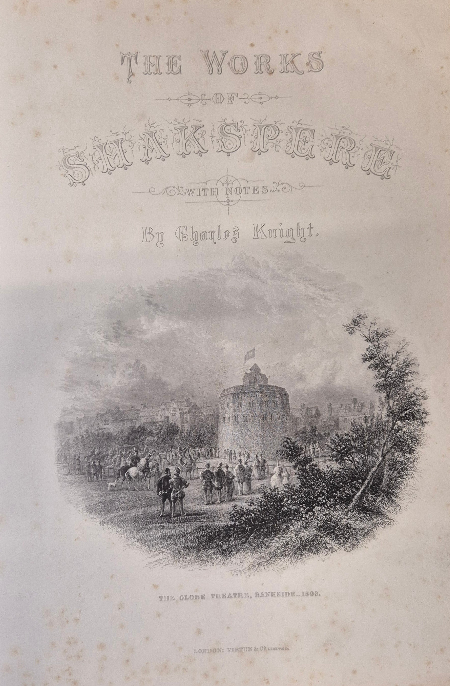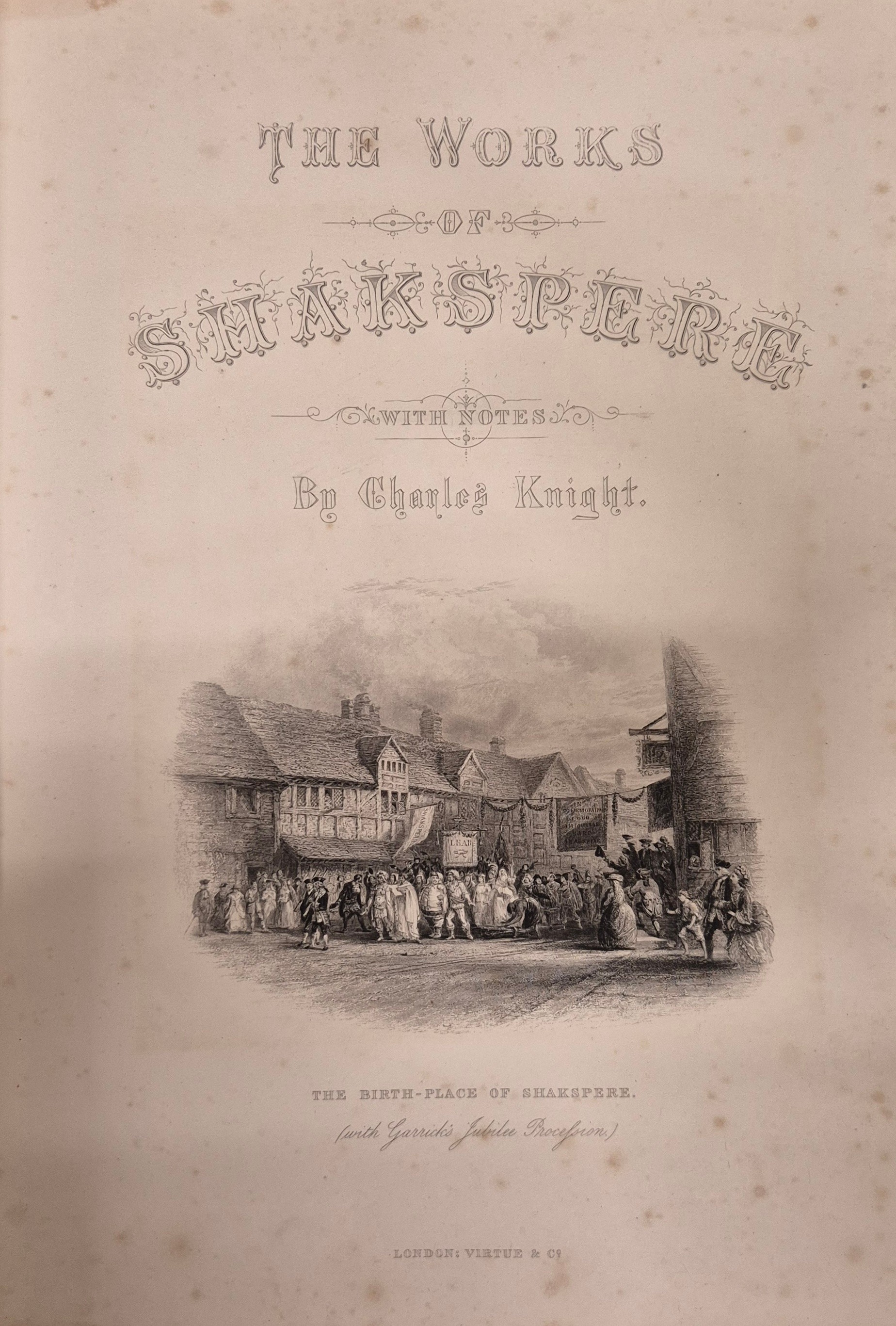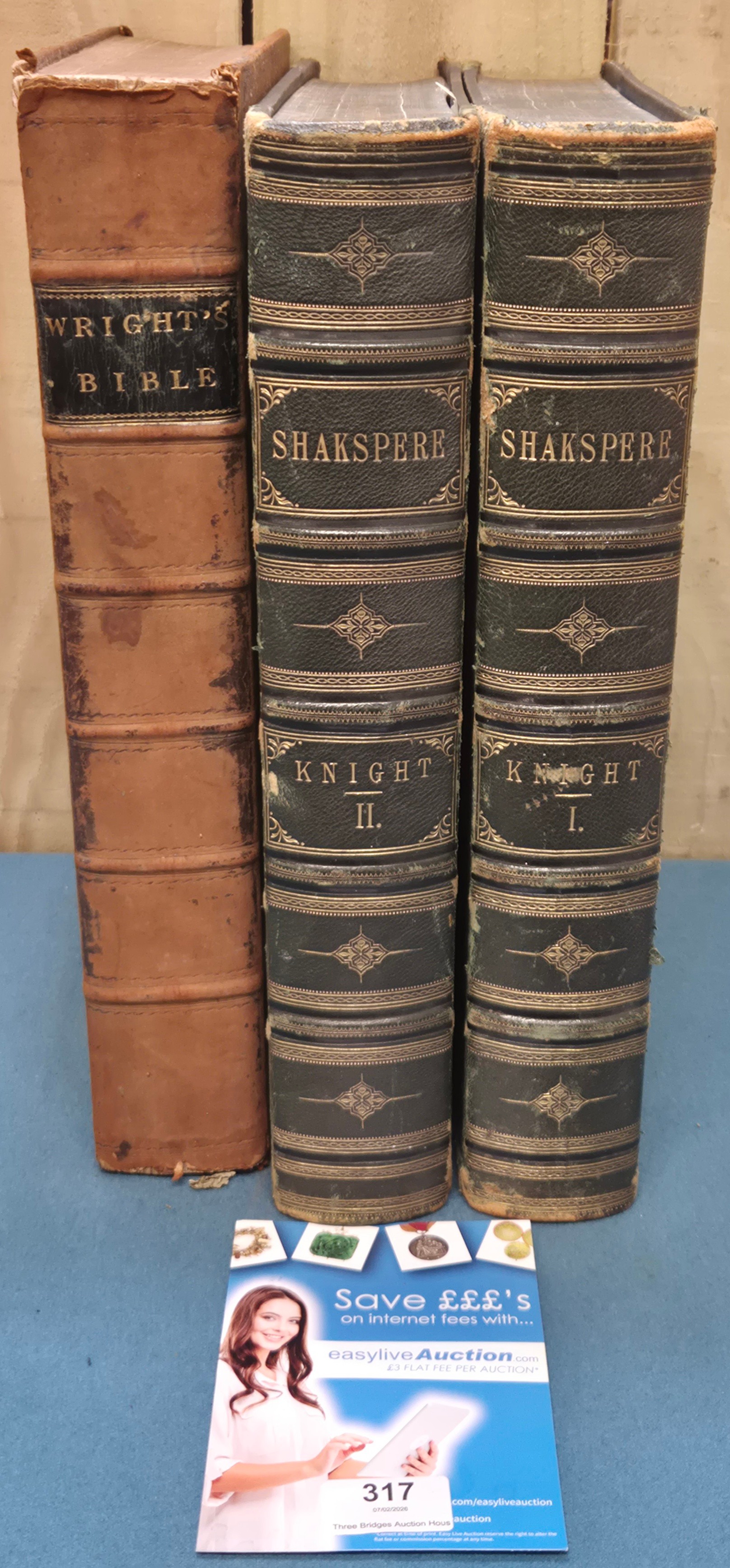 Knight, Charles. The Works of William Shakspere. Imperial edition. 2 vols., binding scuffed [with] The Christian's New and Complete British Family Bible, frontispiece chipped and creased.