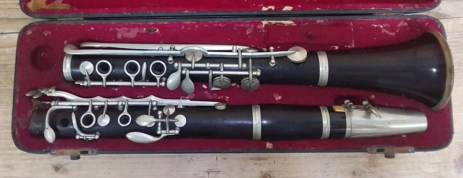 A nickel mounted clarinet marked 'ALP Croes Bruxelles'