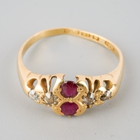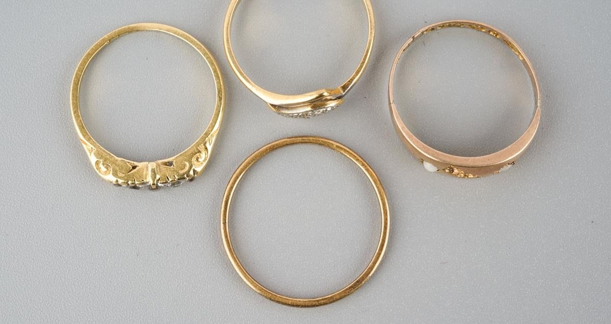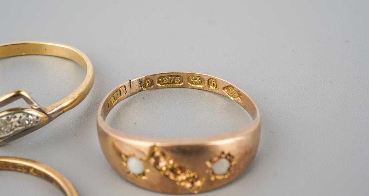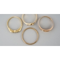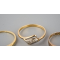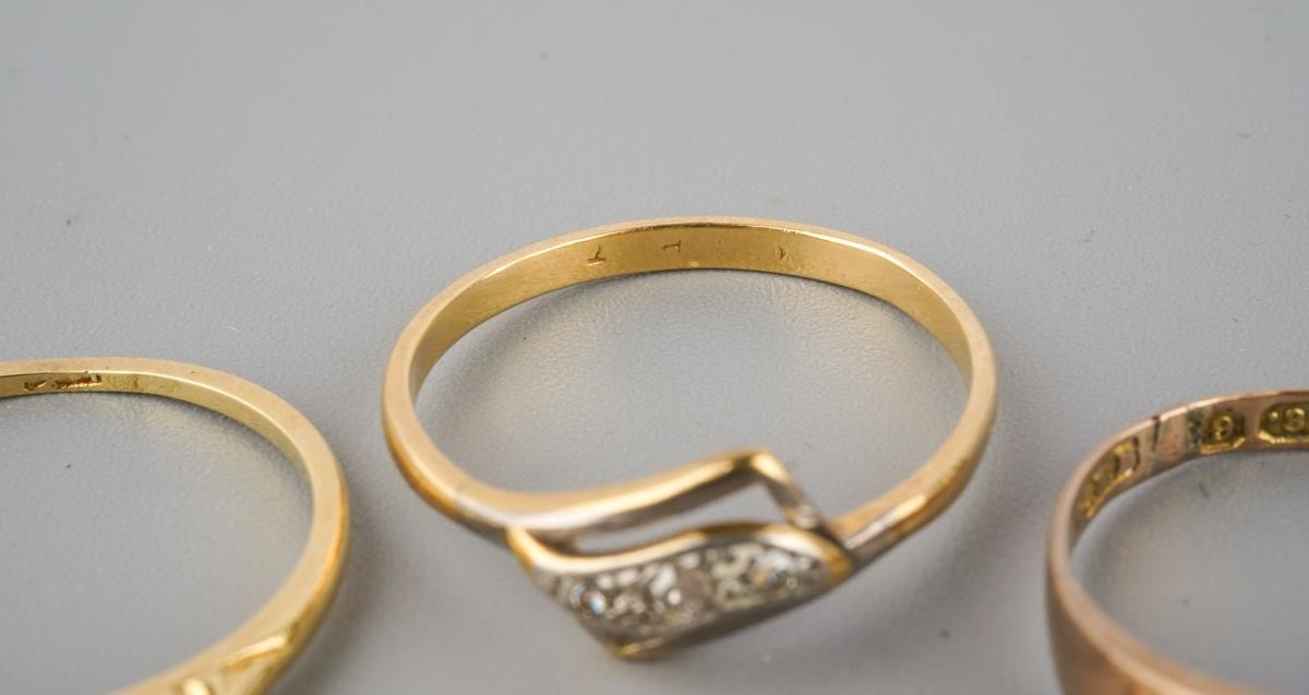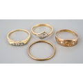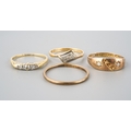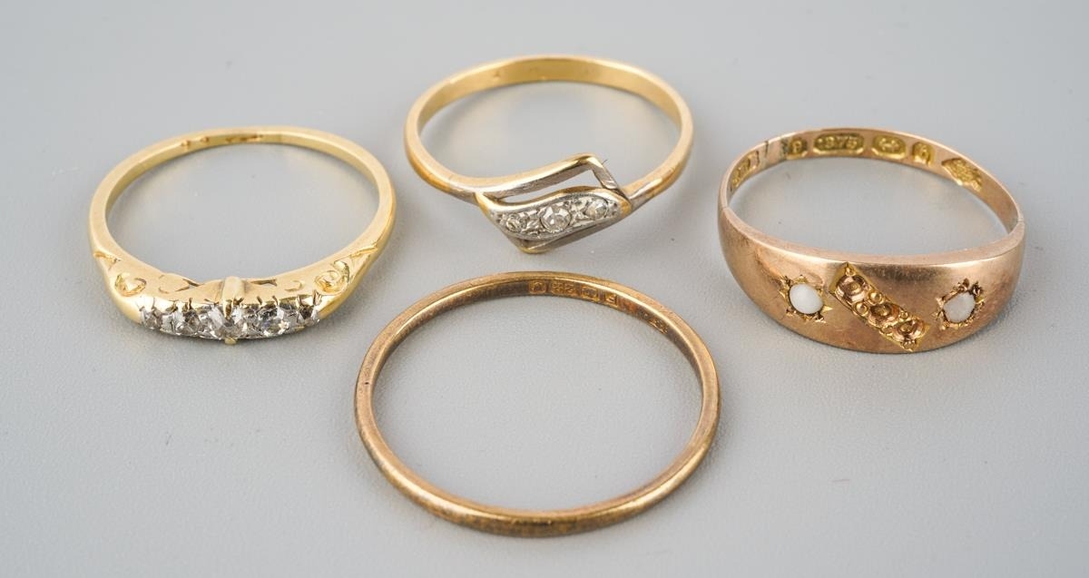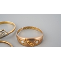 A selection of four gold and diamond set gold rings. To include a 22ct gold wedding band (hallmakred 22ct gold), an early 20th century diamond set 18ct gold ring (unmarked), an early 20th century diamond five stone ring (stamped 18ct) and a Victorian 9ct gold ring, hallmarked Birmingham 1876 (gemstones missing), approx ring sizes S 1/, O, N and O 1/2, approx gross weight 7.4 grams.