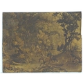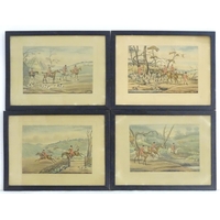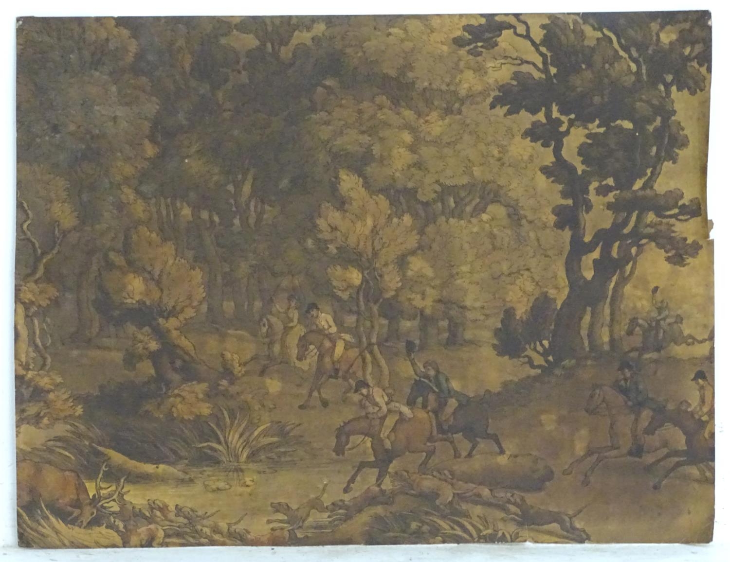 After Thomas Rowlandson (1757-1827), Hand coloured aquatint, Stag at Bay - Scene near Taplow, Berks. A hunting scene in a wooded landscape with men and women on horseback with hounds / dogs chasing a stag. Approx. 14 1/4" x 19"
