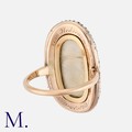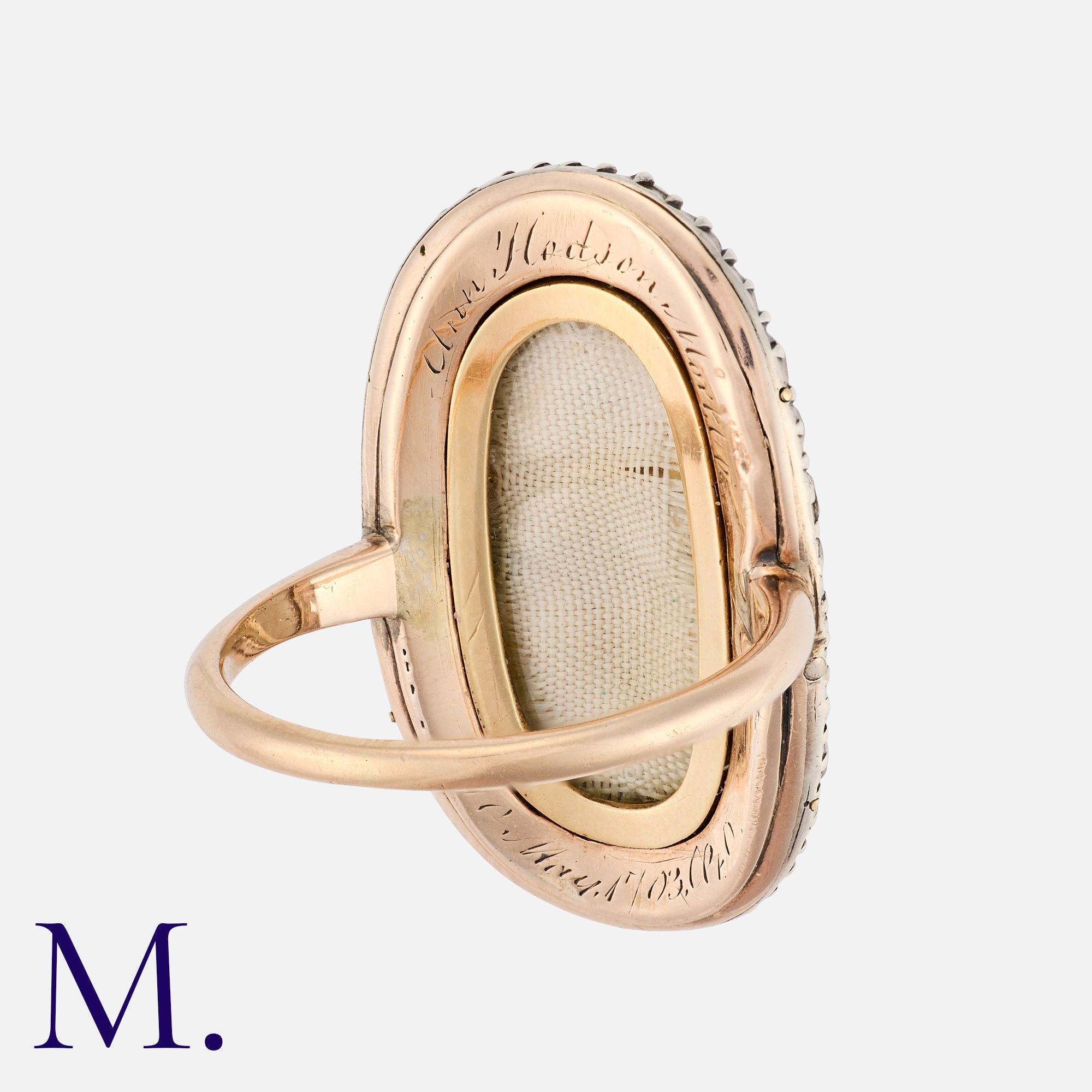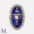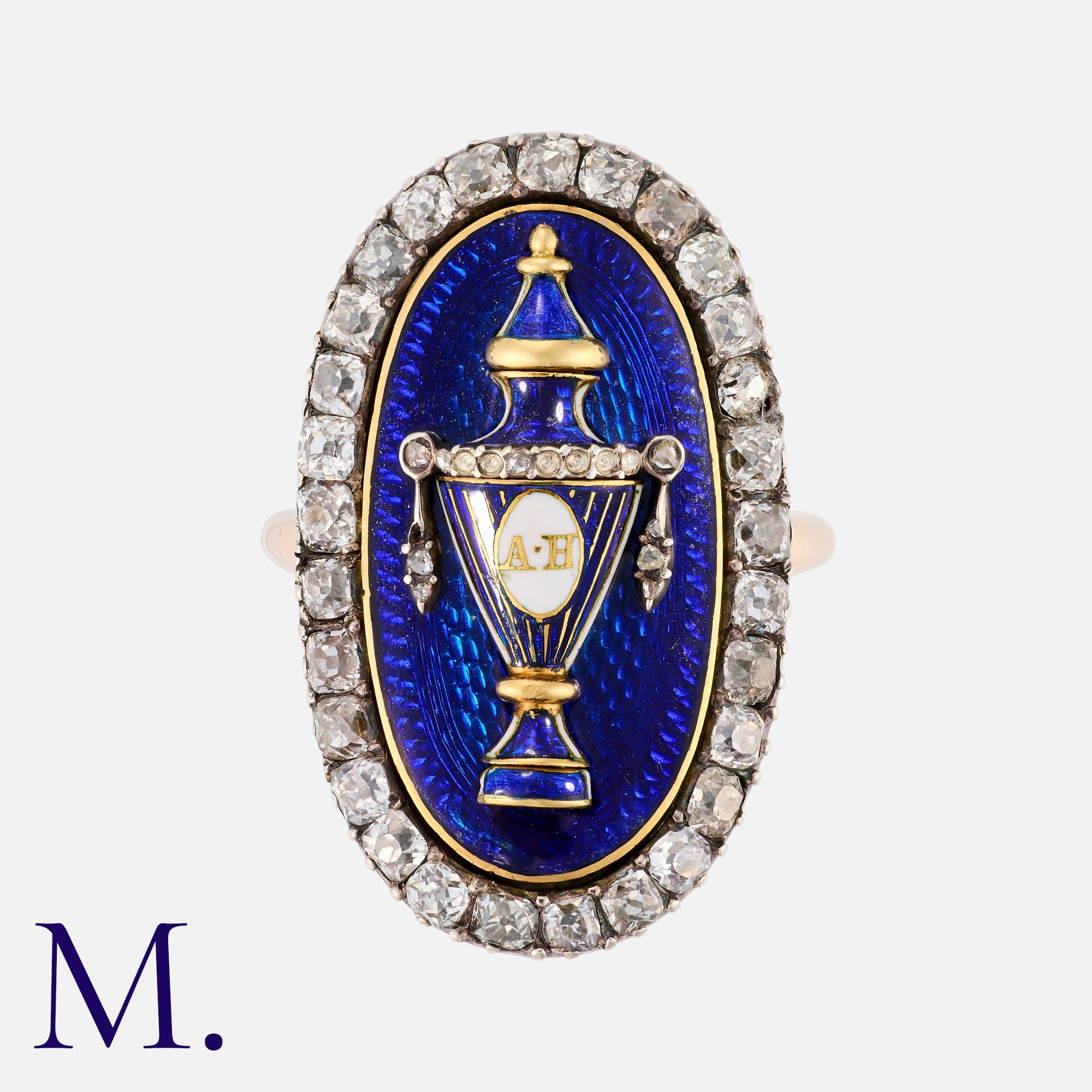 An Antique Enamel And Diamond Mourning Ring in yellow gold and silver, the oval shaped face decorated with a fine blue and white enamel initialed urn motif, to a blue guilloche enamel backdrop. Within a border of old cut diamonds totalling approximately 1.50cts. the reverse engraved 'Ann Hodson Mort Ob 10 May 1703...' with glass locket back. Unmarked but tests indicate 9 carat gold and silver.