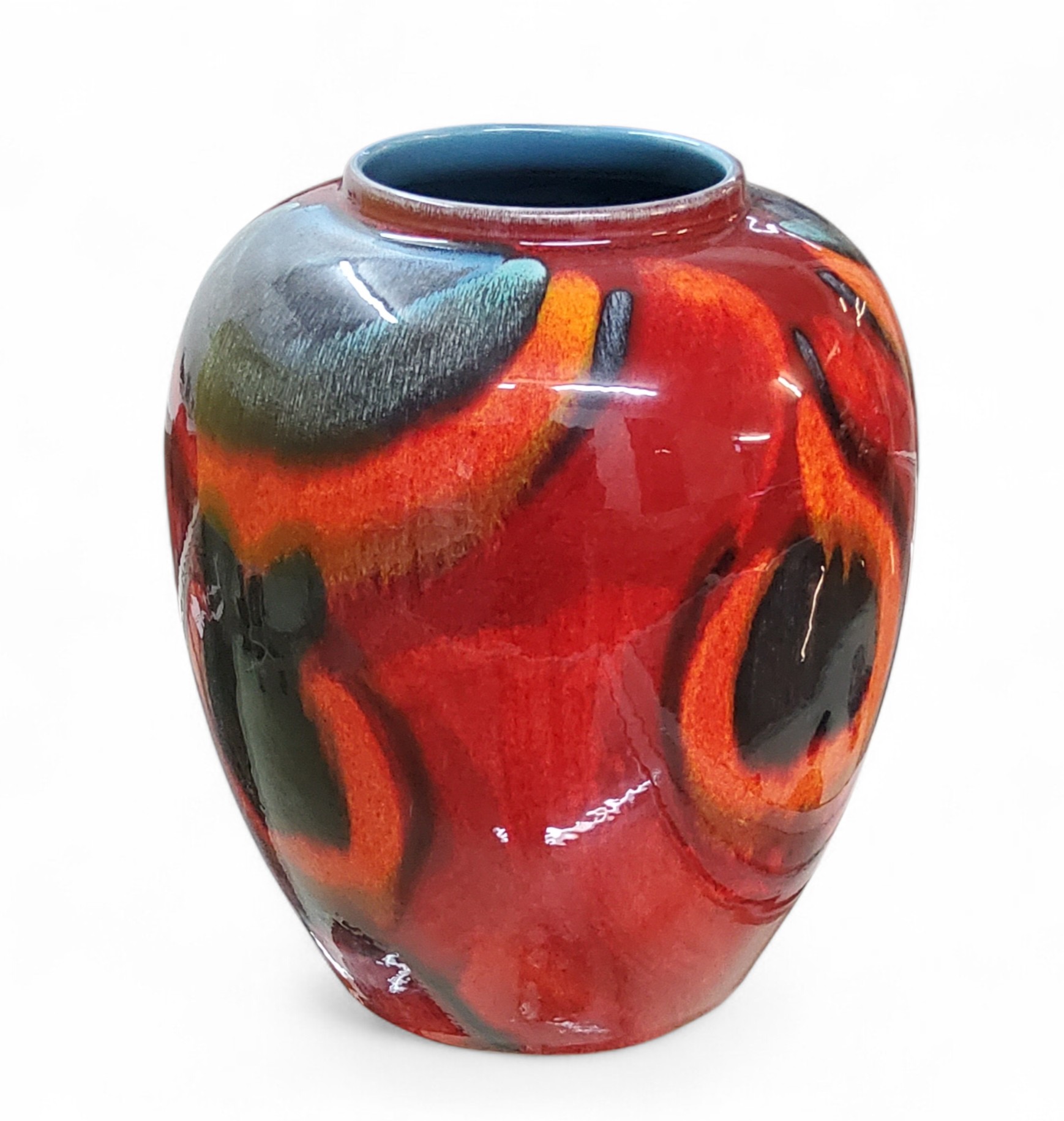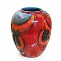 A Poole Peacock pattern ovoid vase, in tones of red, blue and black, 22.5cm high, printed mark