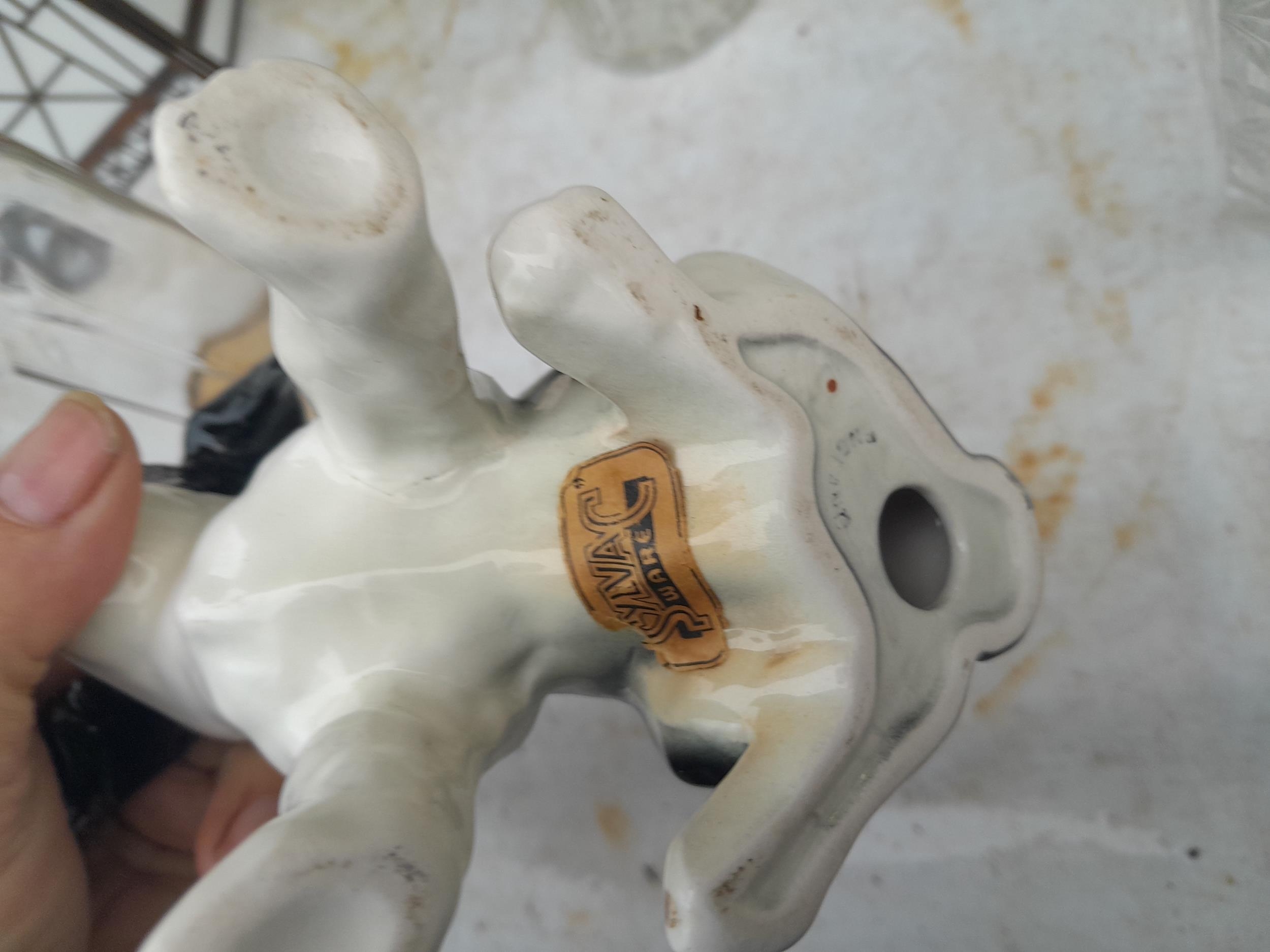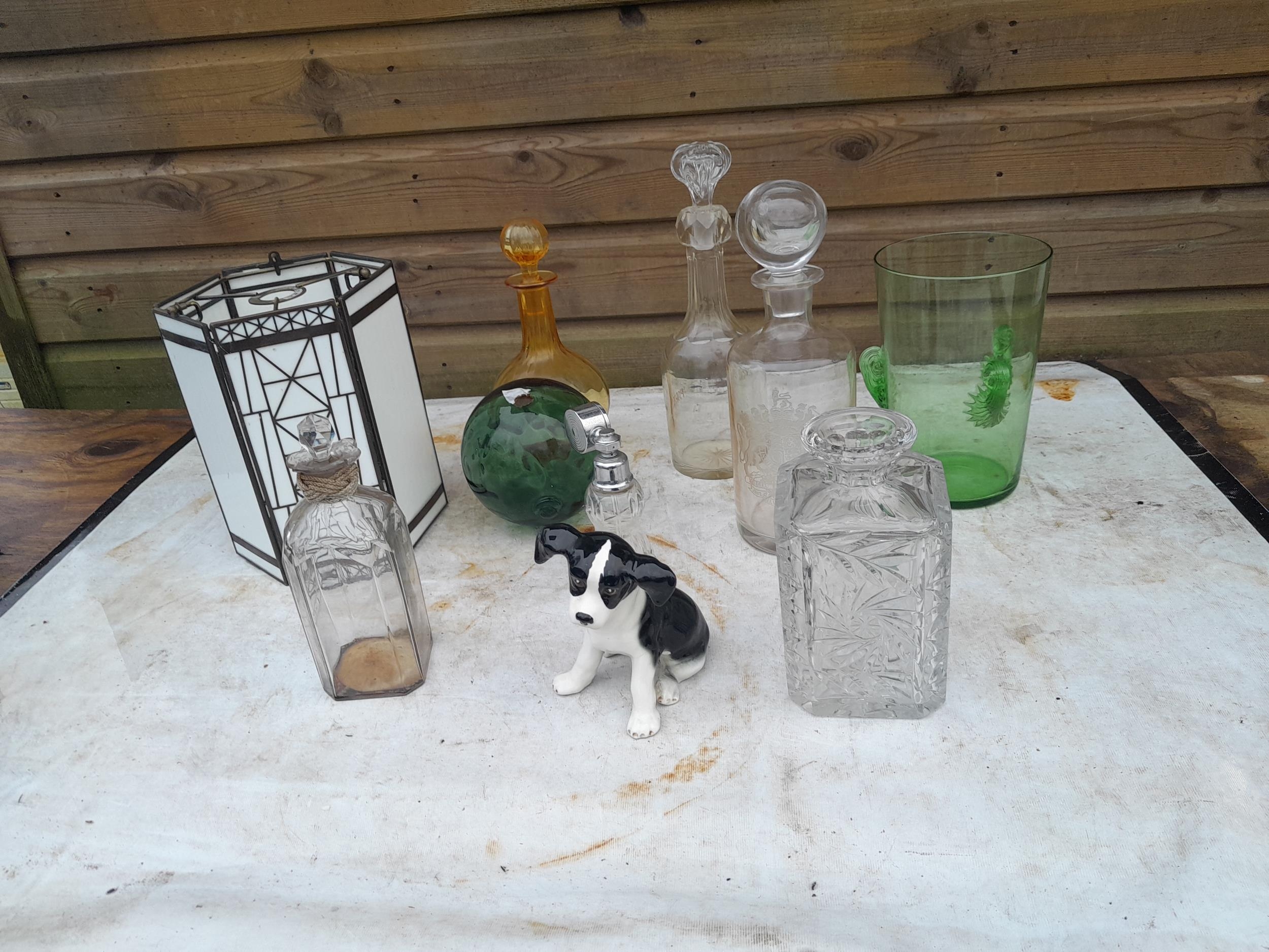 Decorative glassware, modern lamp shade, 19th century rum decanter, later decanters, restored Sylvac dog etc.