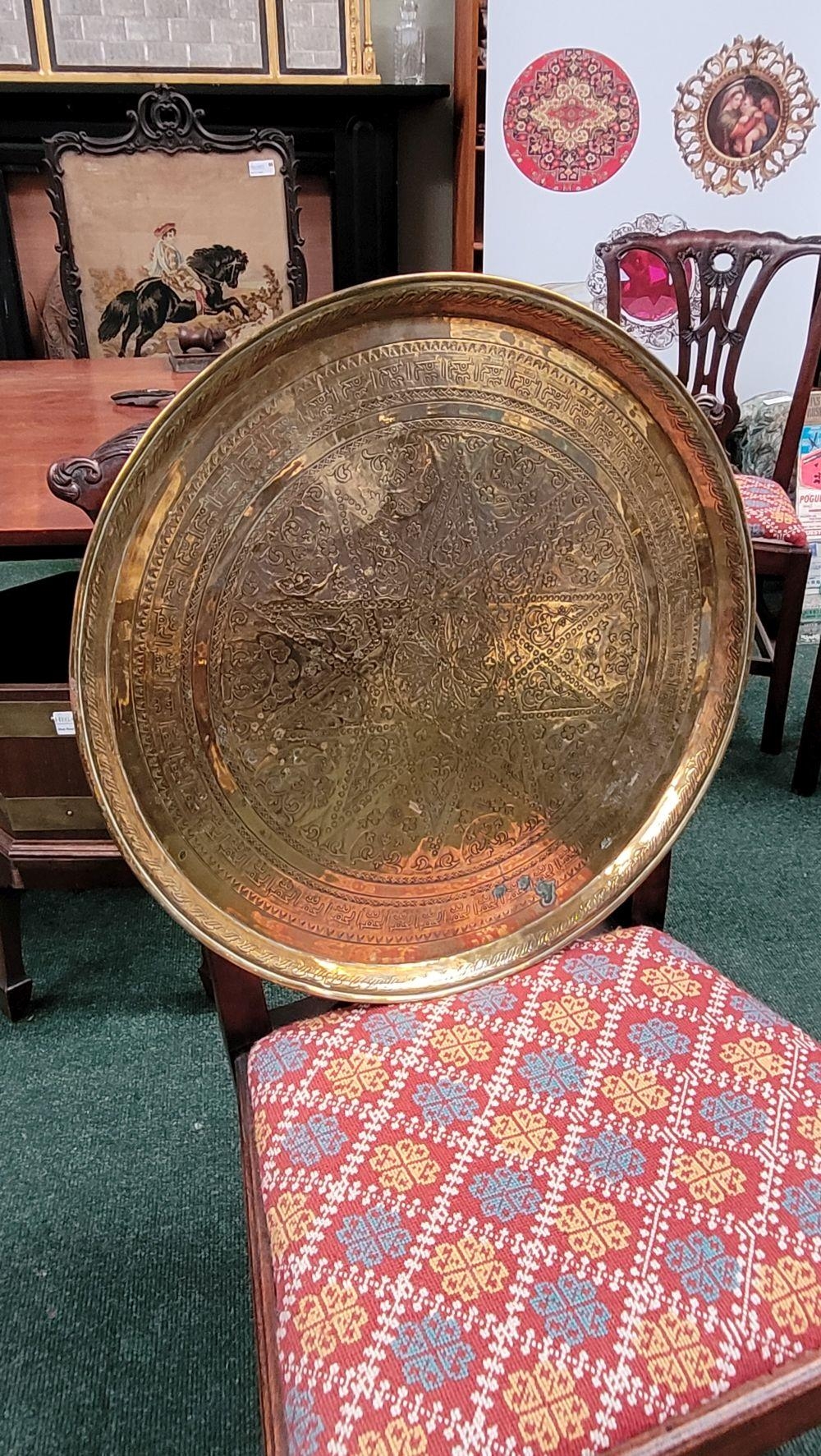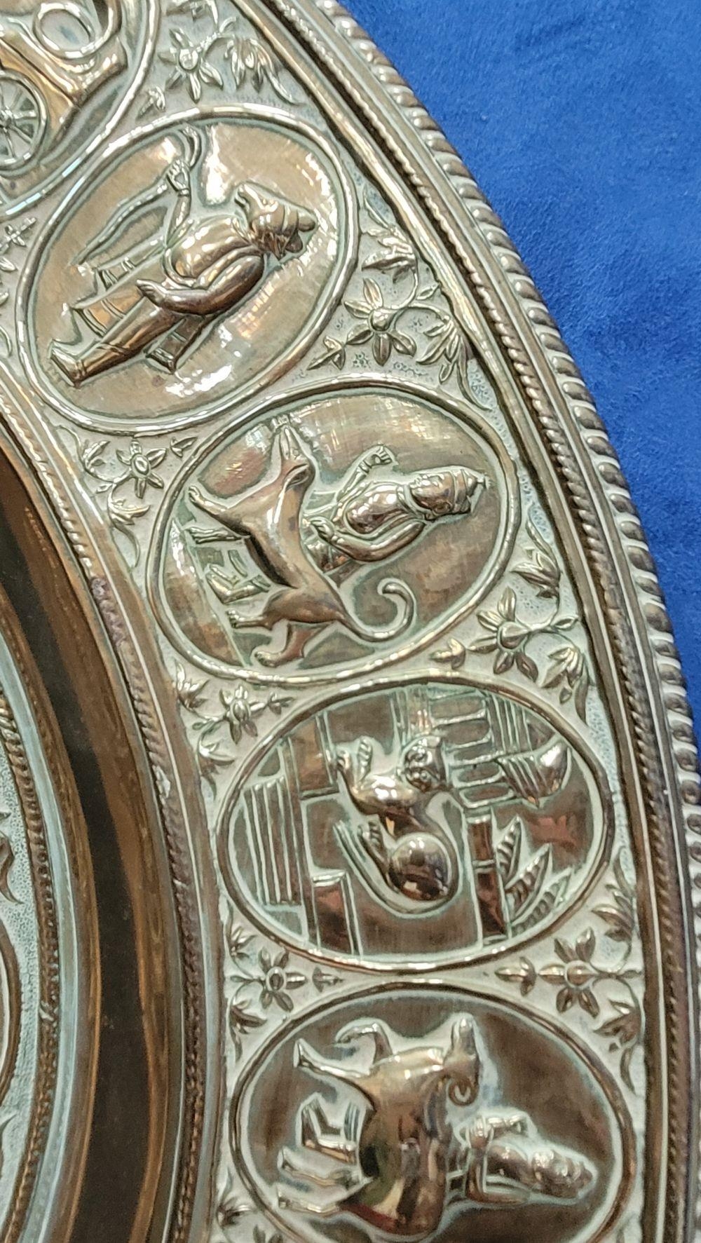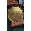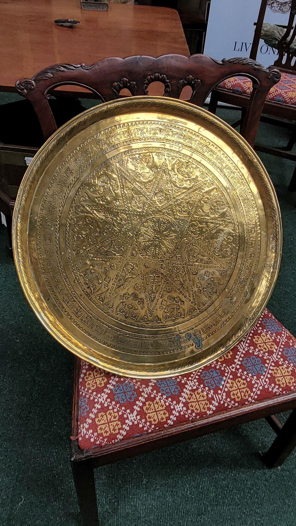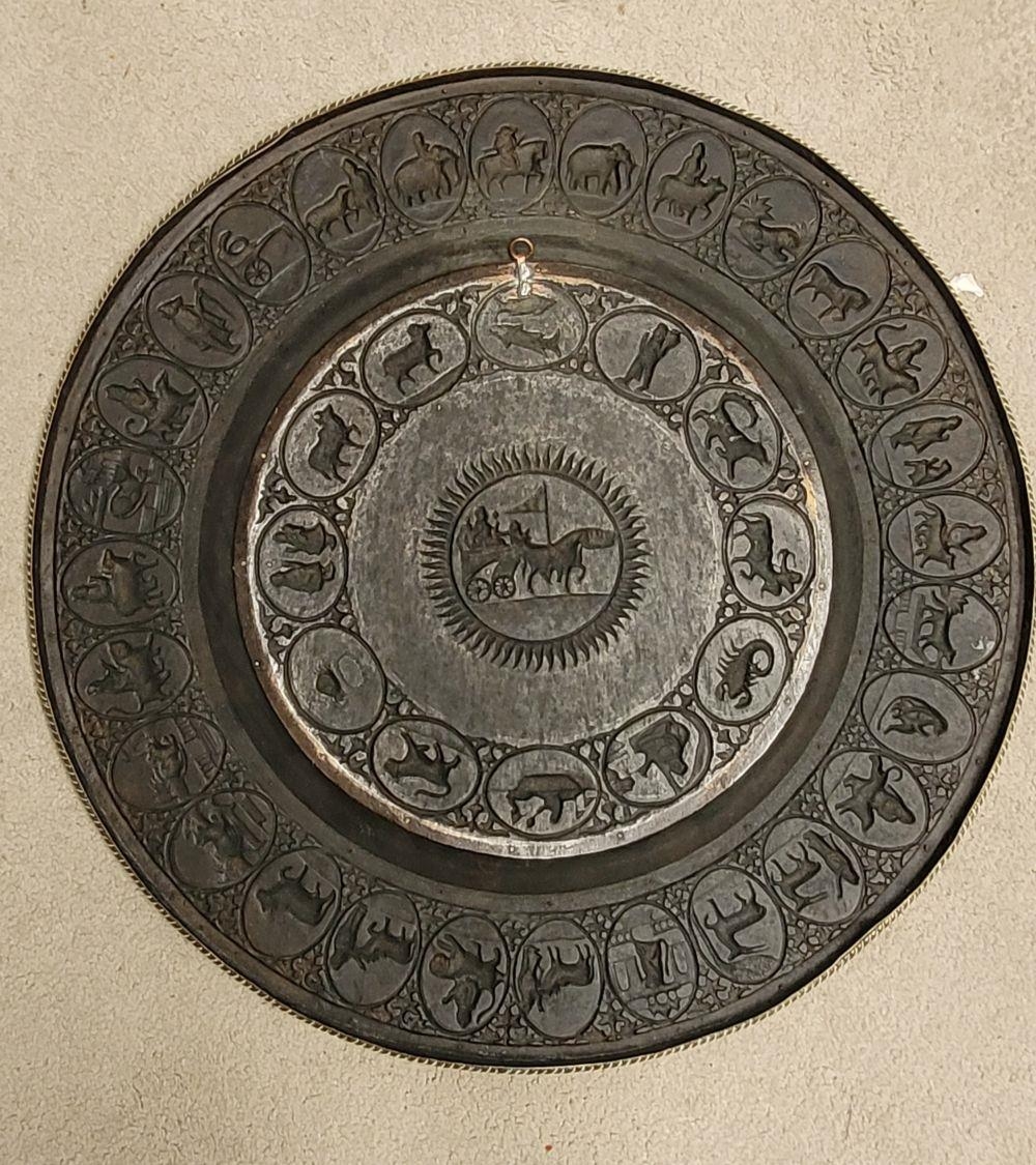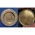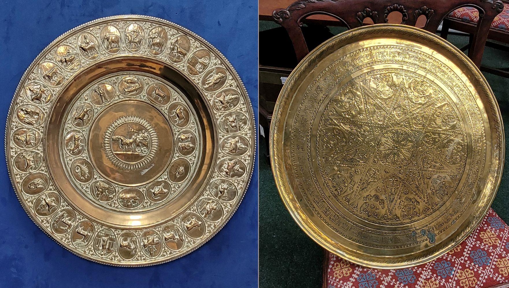 TWO POLISHED BRASS DECORATIVE TRAYS, (i) One a brass zodiac charger/tray; decorated with figures in a chariot to the centre surrounded by animals and figures representing the signs of the zodiac, and a further band of figures & animals to the outside edge; measuring 60cm wide, the (ii) decorated with a central star design surrounded by scrolling decoration, measuring 56cm wide. Both in excellent condition. The large with a hook to the back to allow it to be hung.