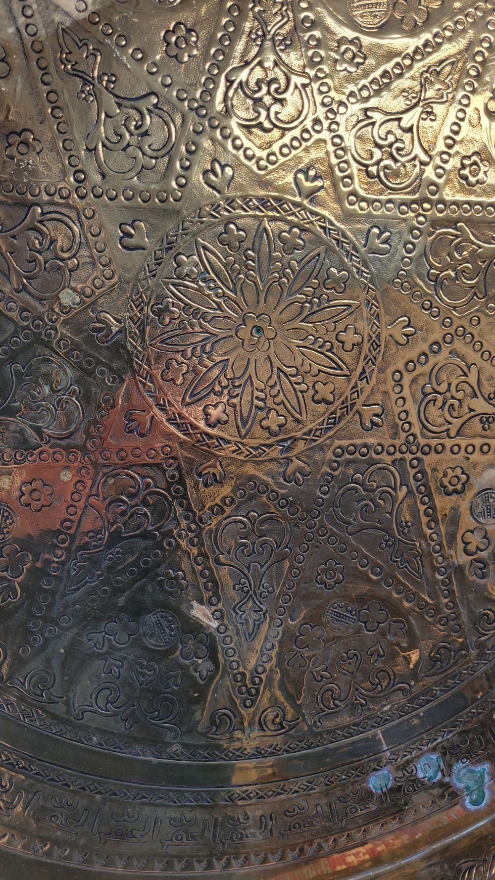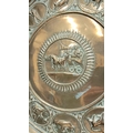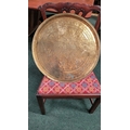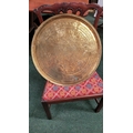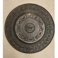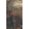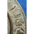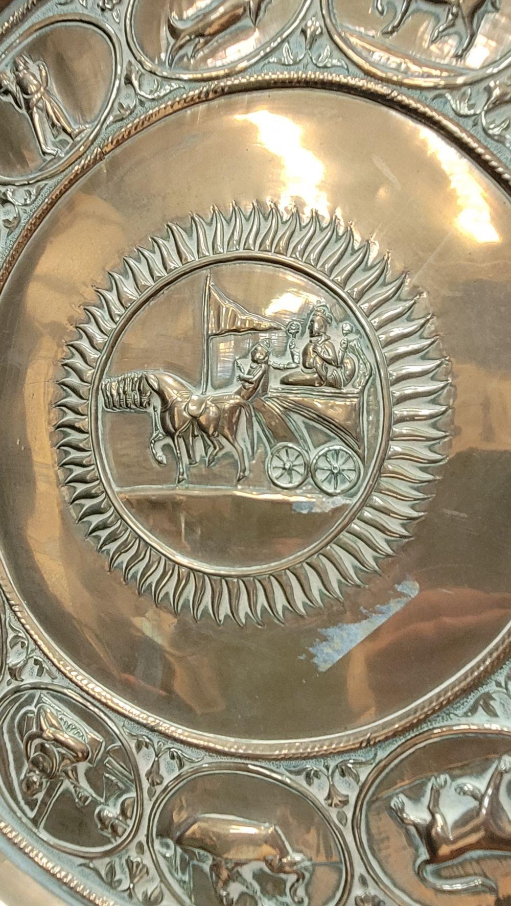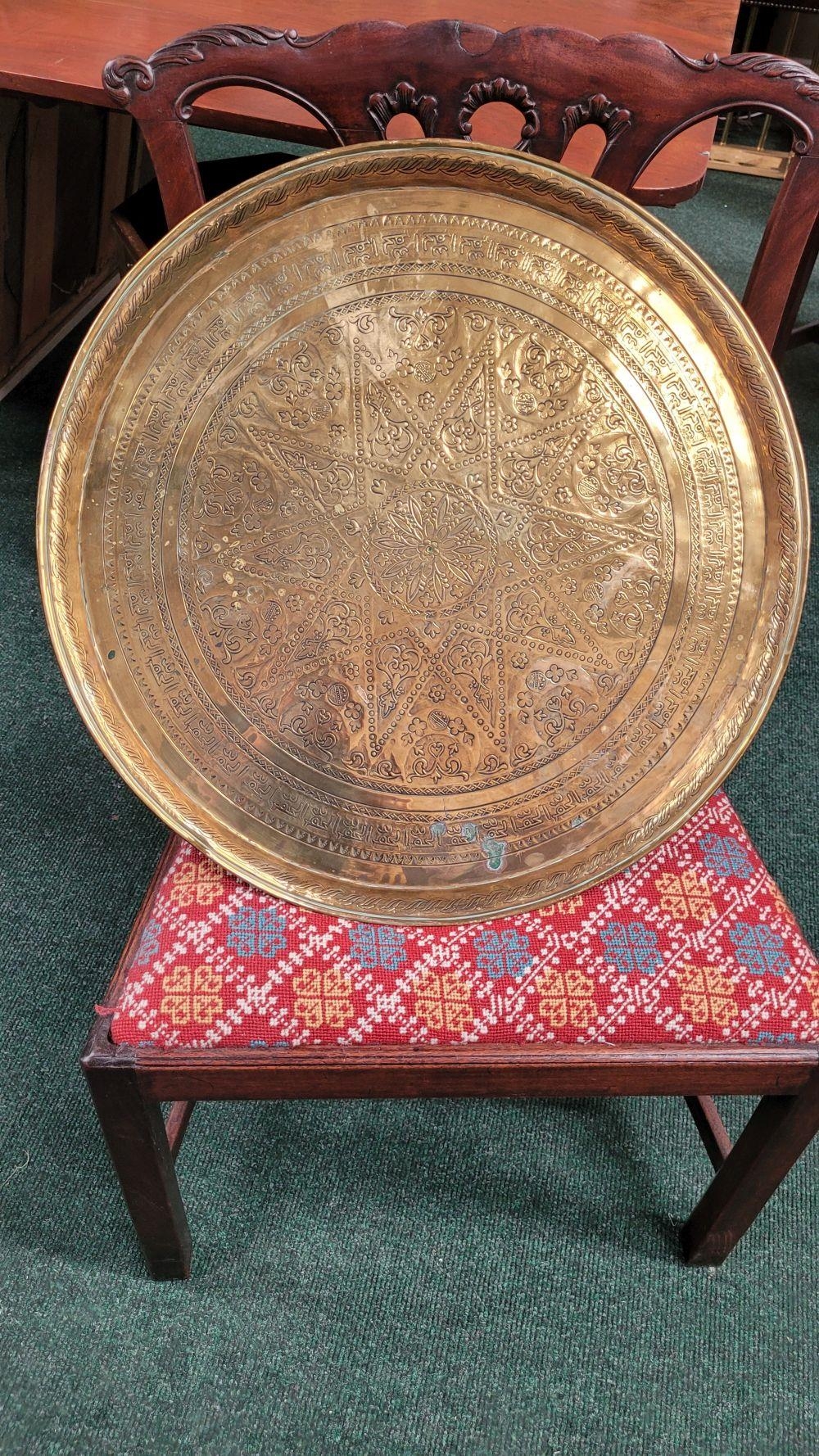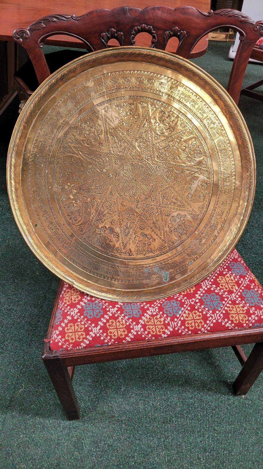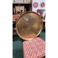 TWO POLISHED BRASS DECORATIVE TRAYS, (i) One a brass zodiac charger/tray; decorated with figures in a chariot to the centre surrounded by animals and figures representing the signs of the zodiac, and a further band of figures & animals to the outside edge; measuring 60cm wide, the (ii) decorated with a central star design surrounded by scrolling decoration, measuring 56cm wide. Both in excellent condition. The large with a hook to the back to allow it to be hung.