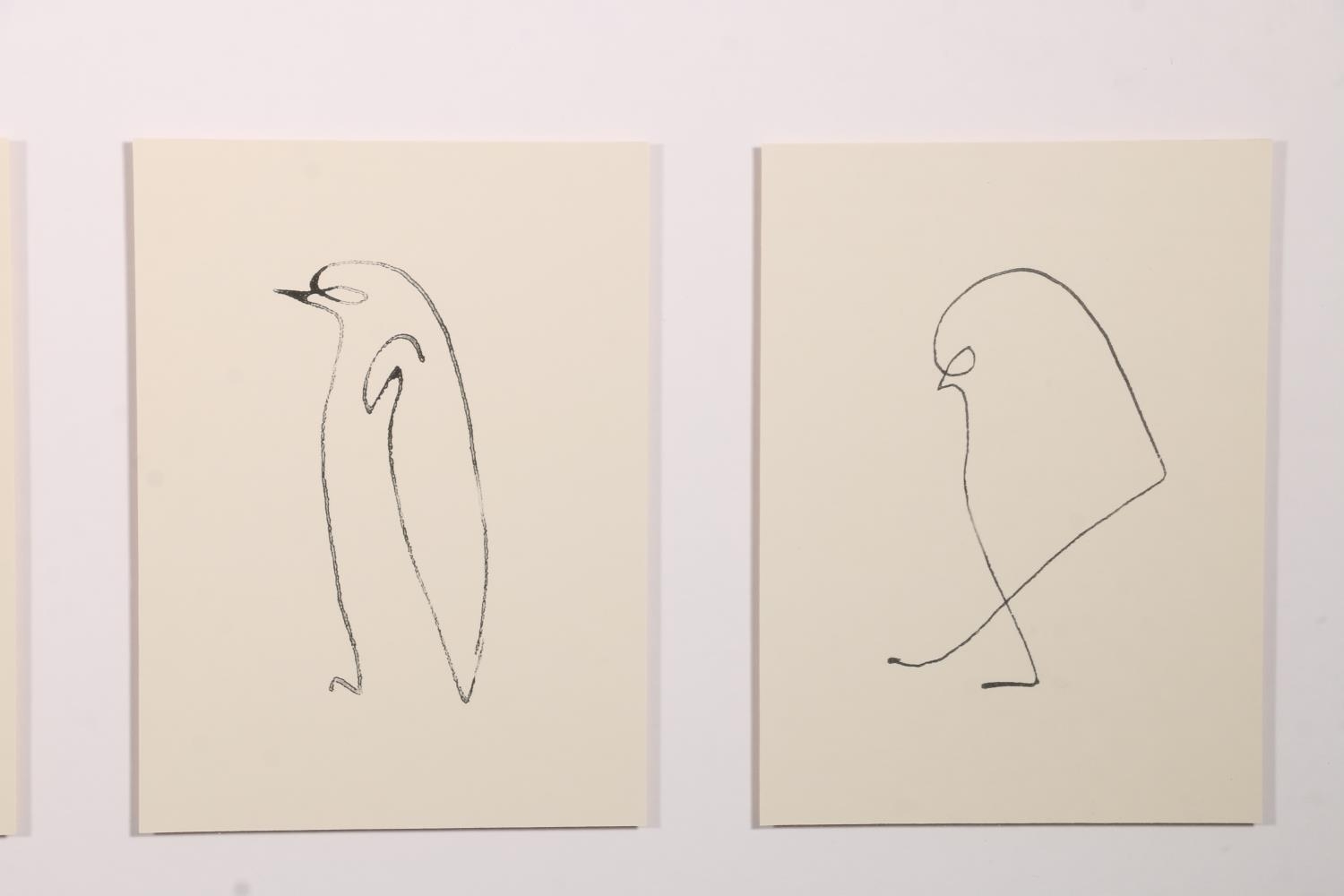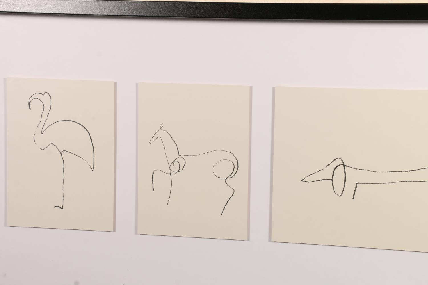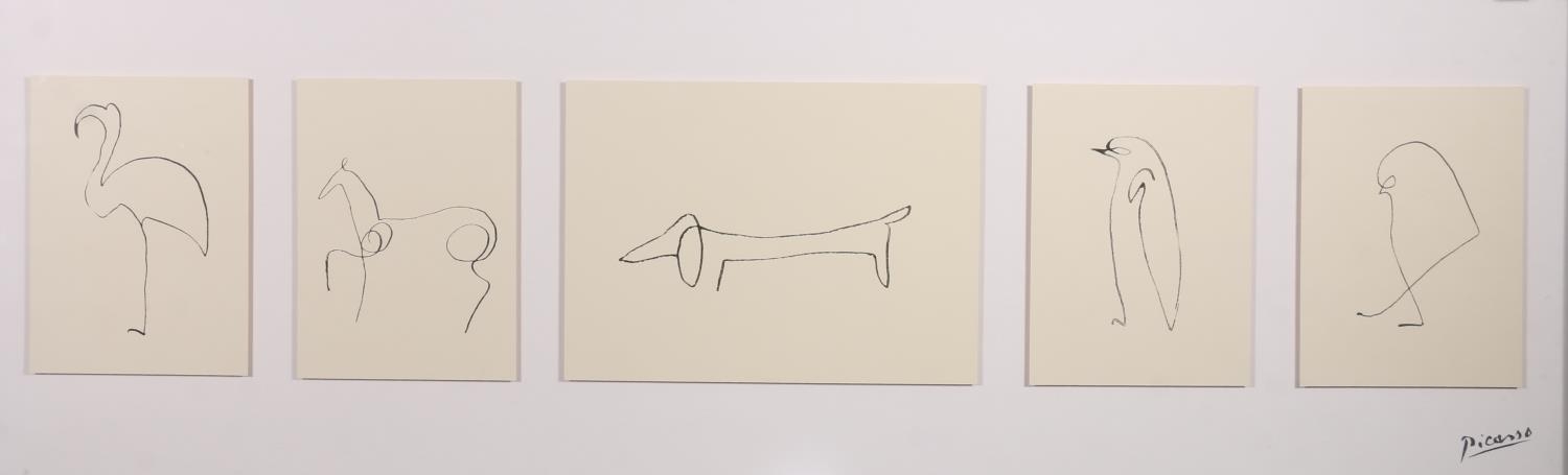 PICASSO, 'Flamingo, Penguin, Sausage Dog, Chick, Horse', five prints of animals framed as one, frame size 40cm x 104cm.