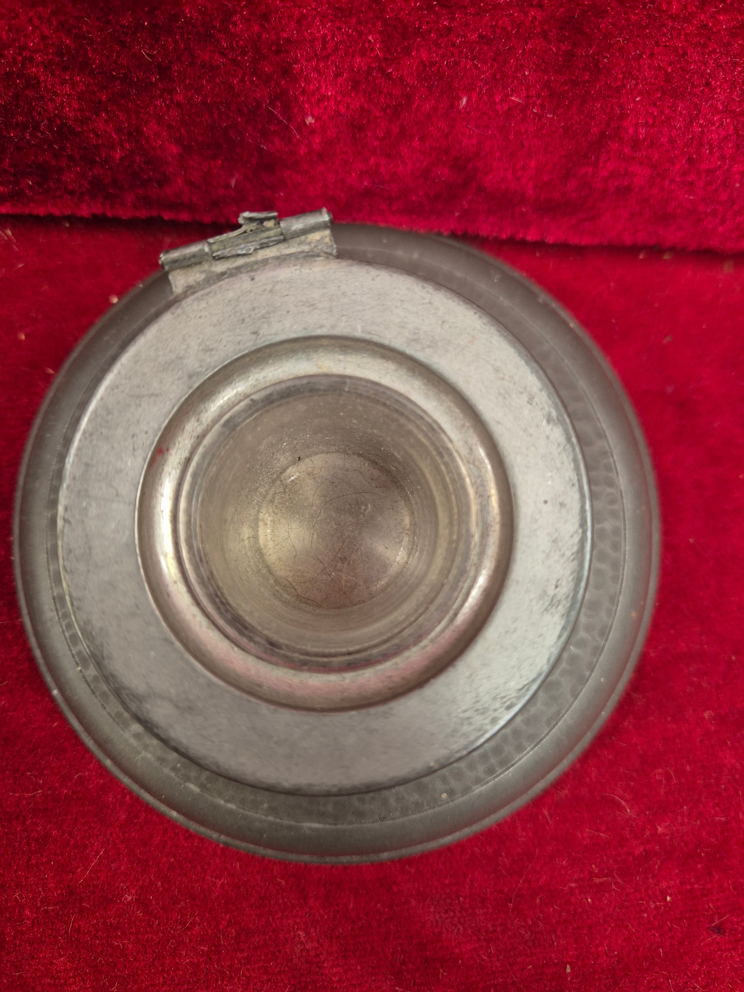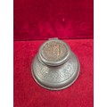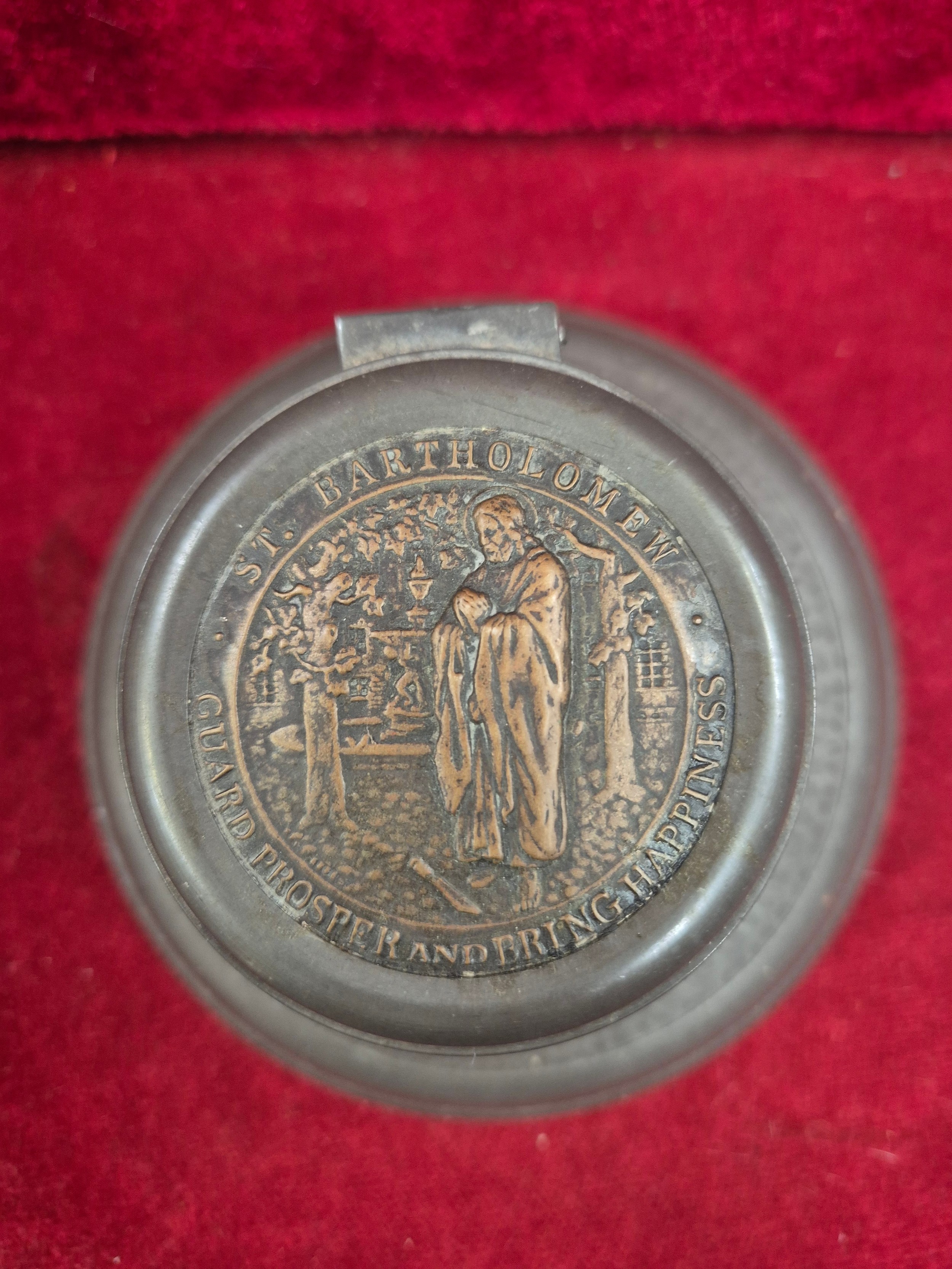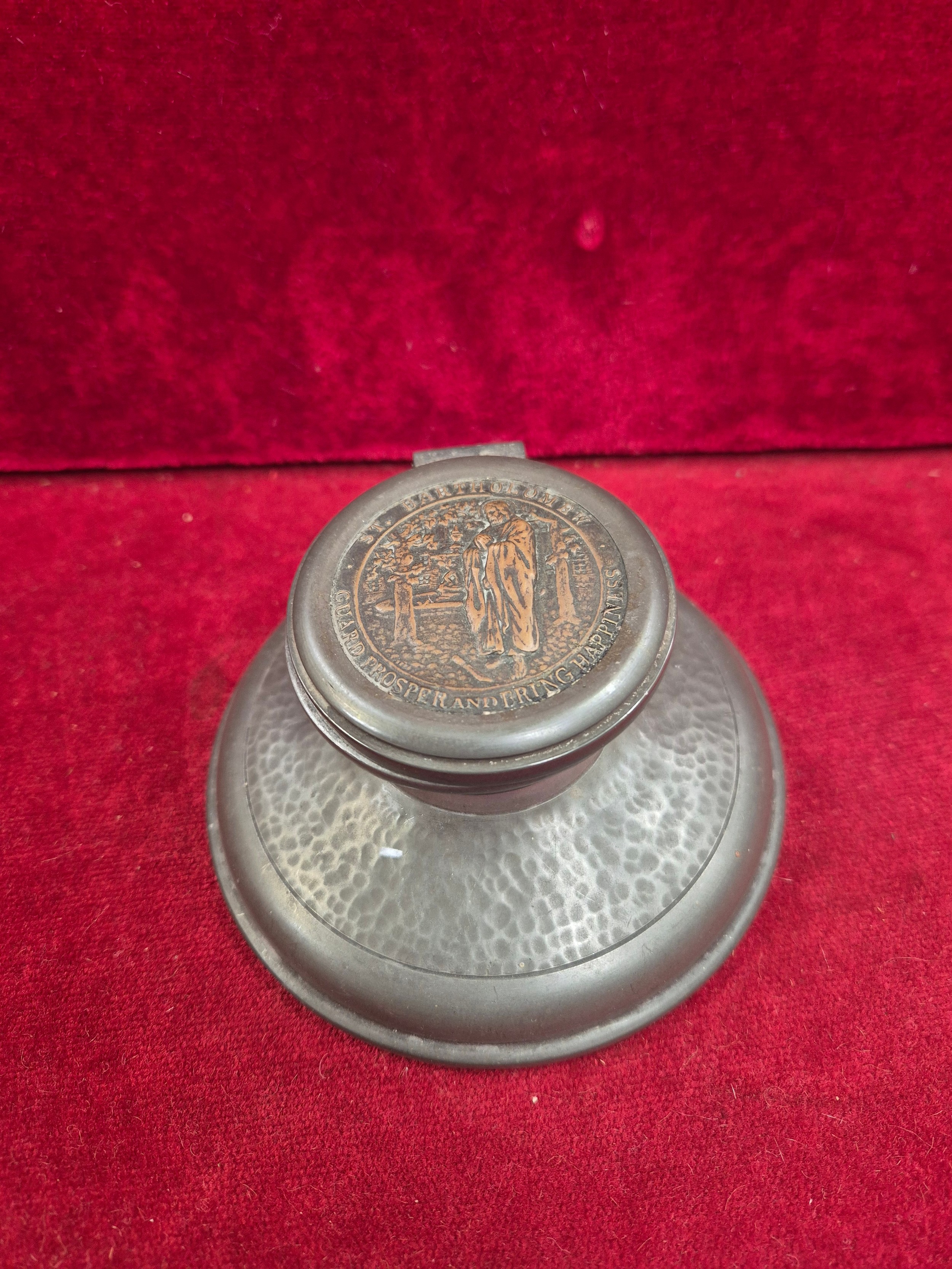 An unusual early 20th Century Pewter Inkwell, the lid set with a brass plaque of St Bartholomew with motto "Guard Prosper & Bring Happiness". Hinge damaged