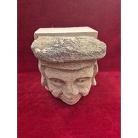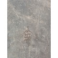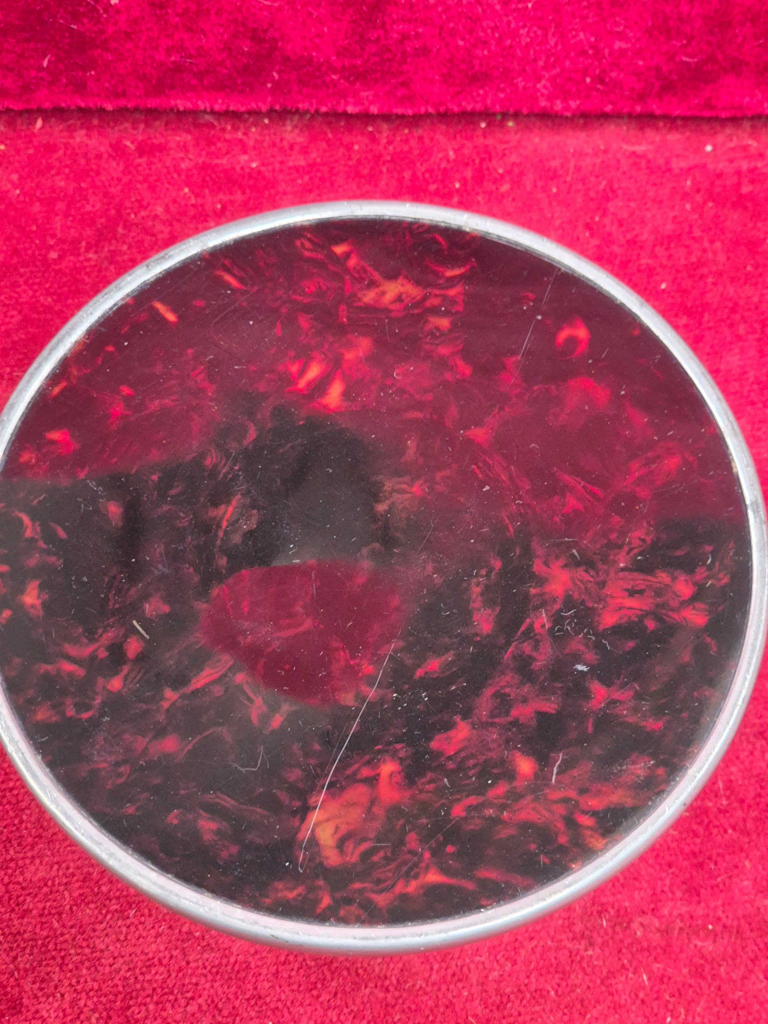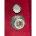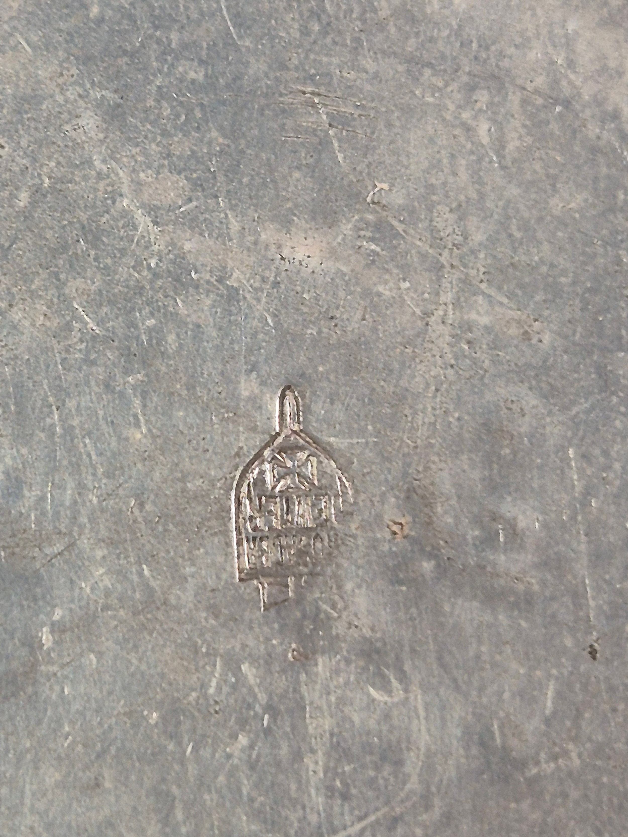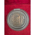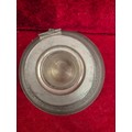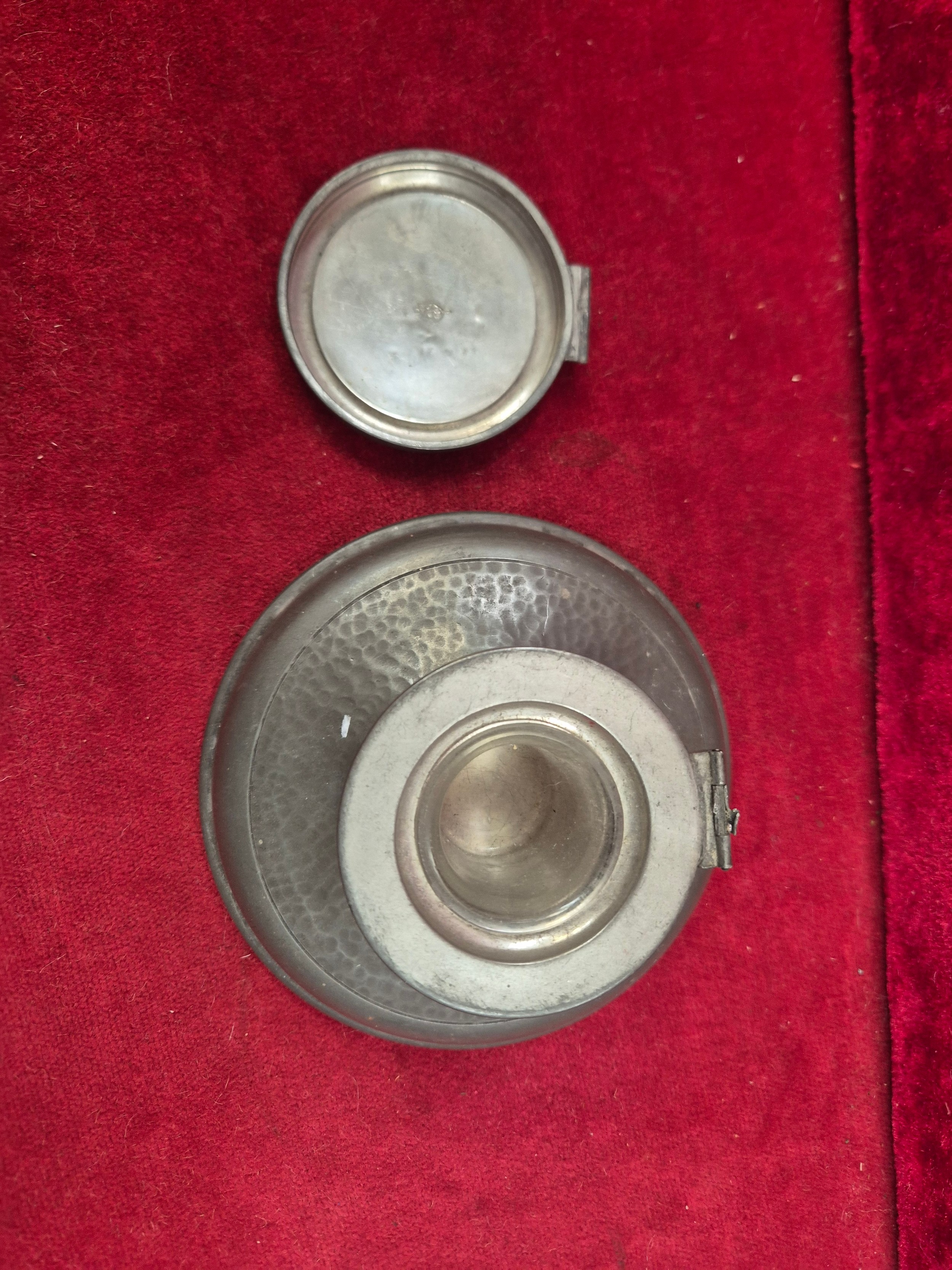 An unusual early 20th Century Pewter Inkwell, the lid set with a brass plaque of St Bartholomew with motto "Guard Prosper & Bring Happiness". Hinge damaged