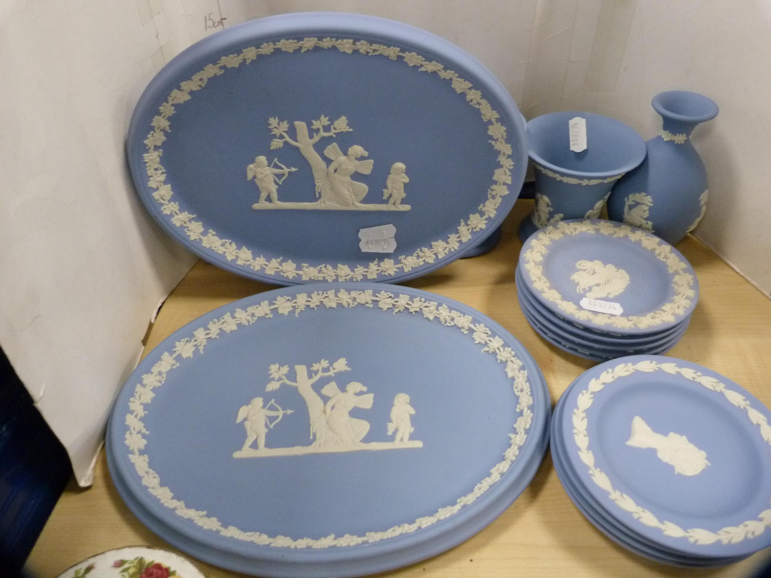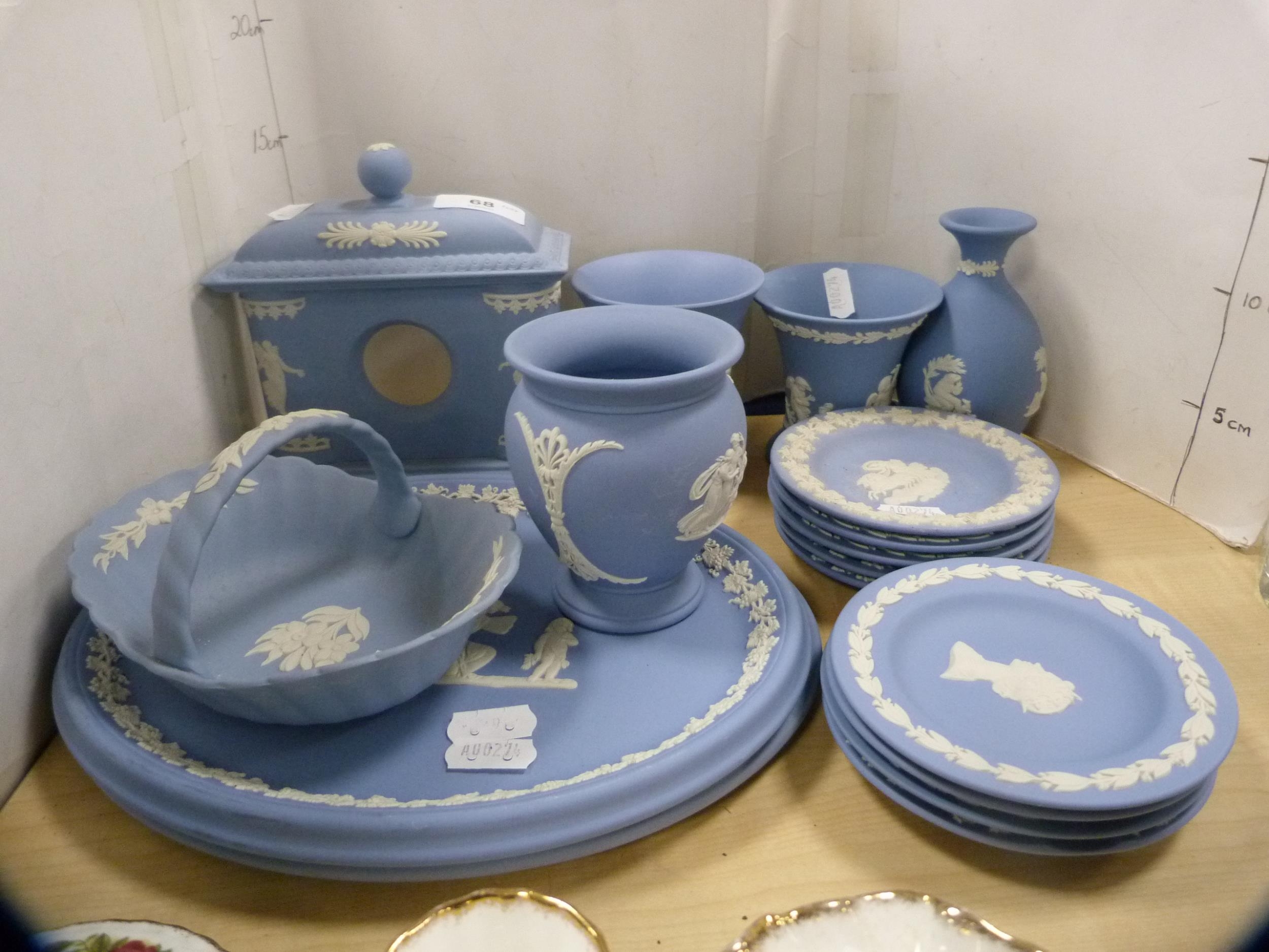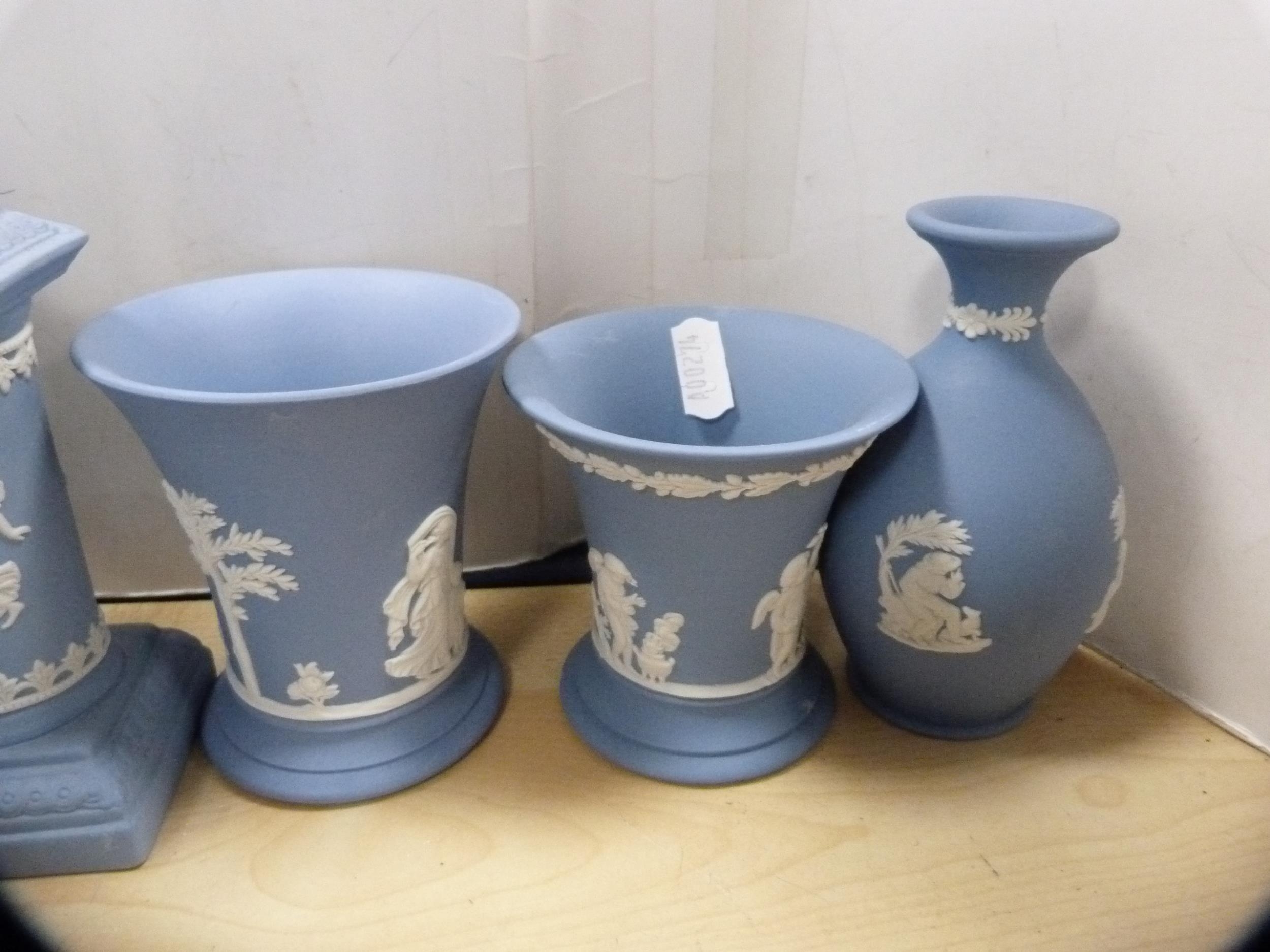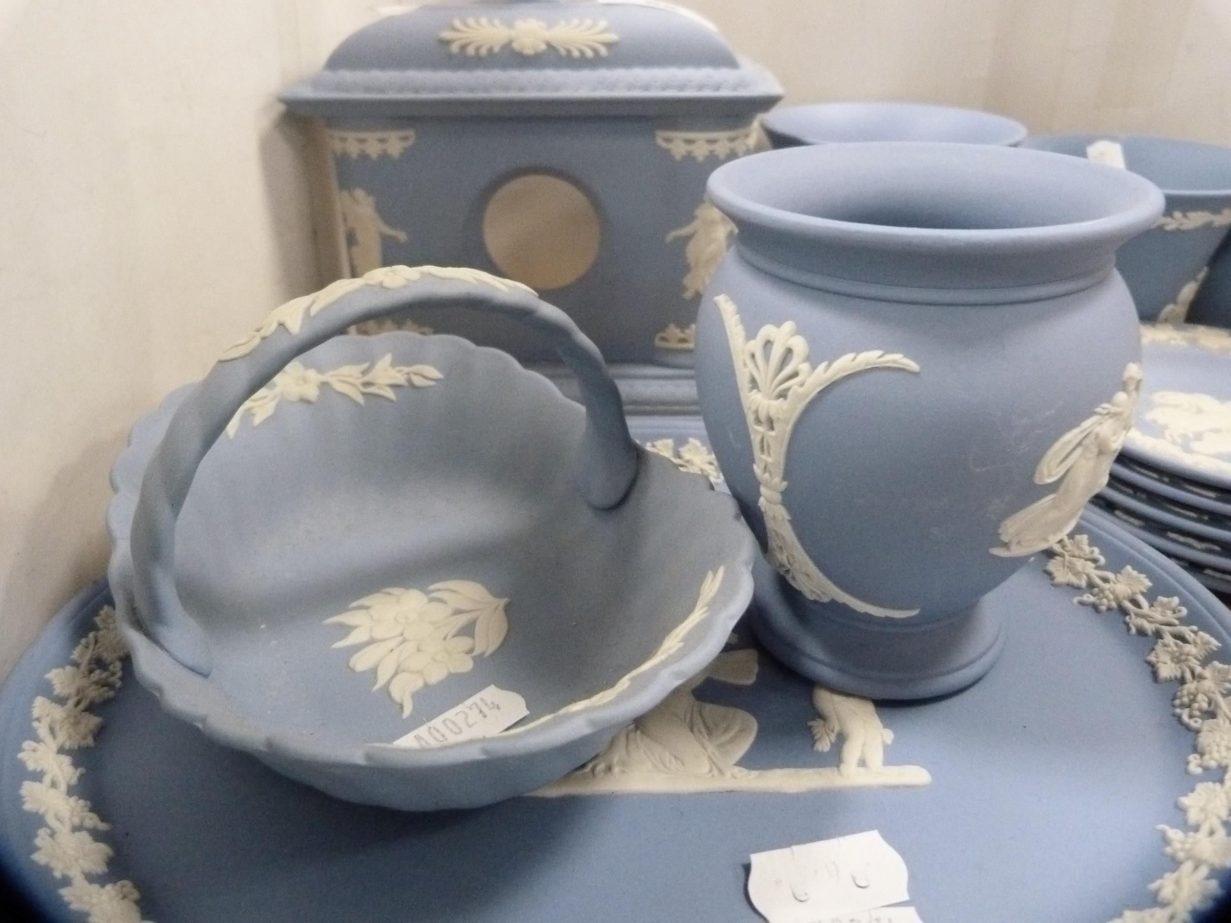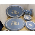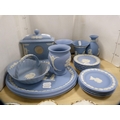 Group of Wedgwood blue Jasper ware to include a clock case, oval plaques, spill vases, pin dishes etc.