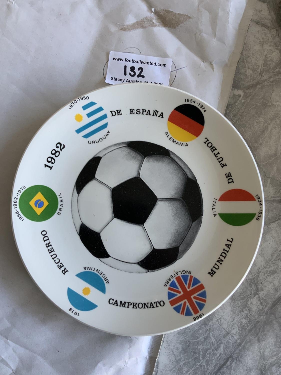 1982 Football World Cup Ceramic Plate: Attractive plate with football in the middle surrounded by previous winners flags and years they won the World Cup. Instructions to sell.