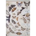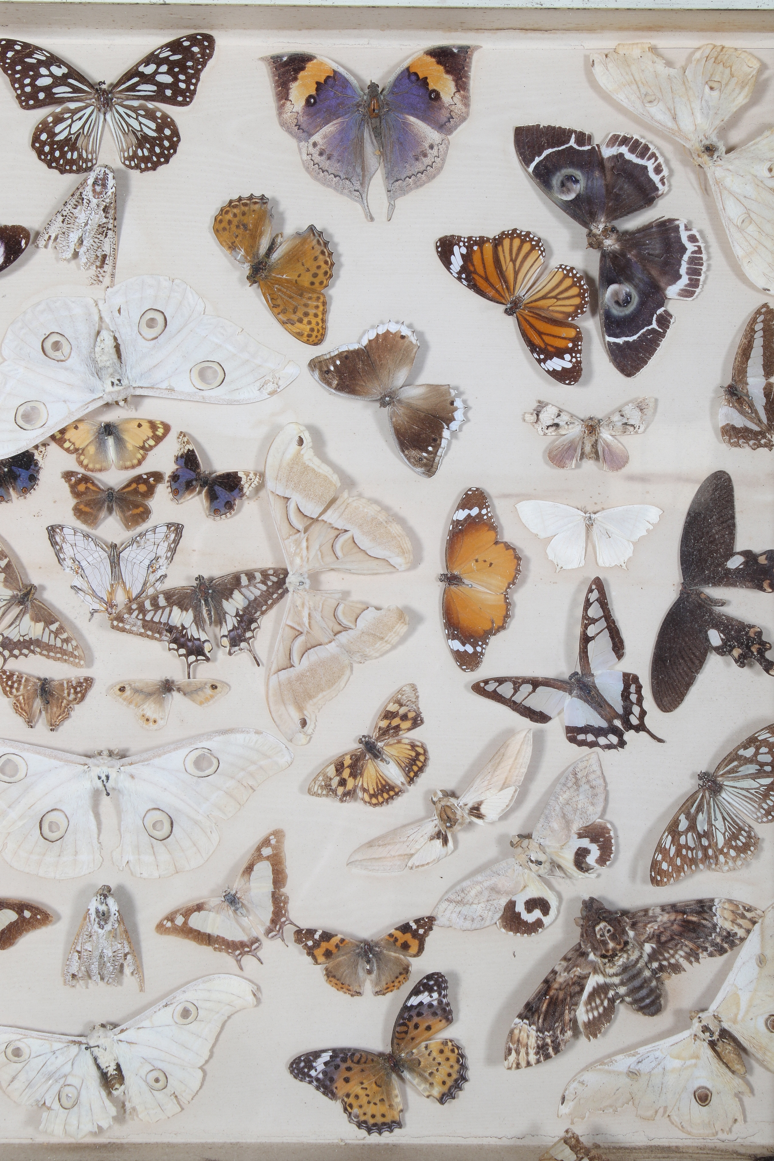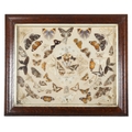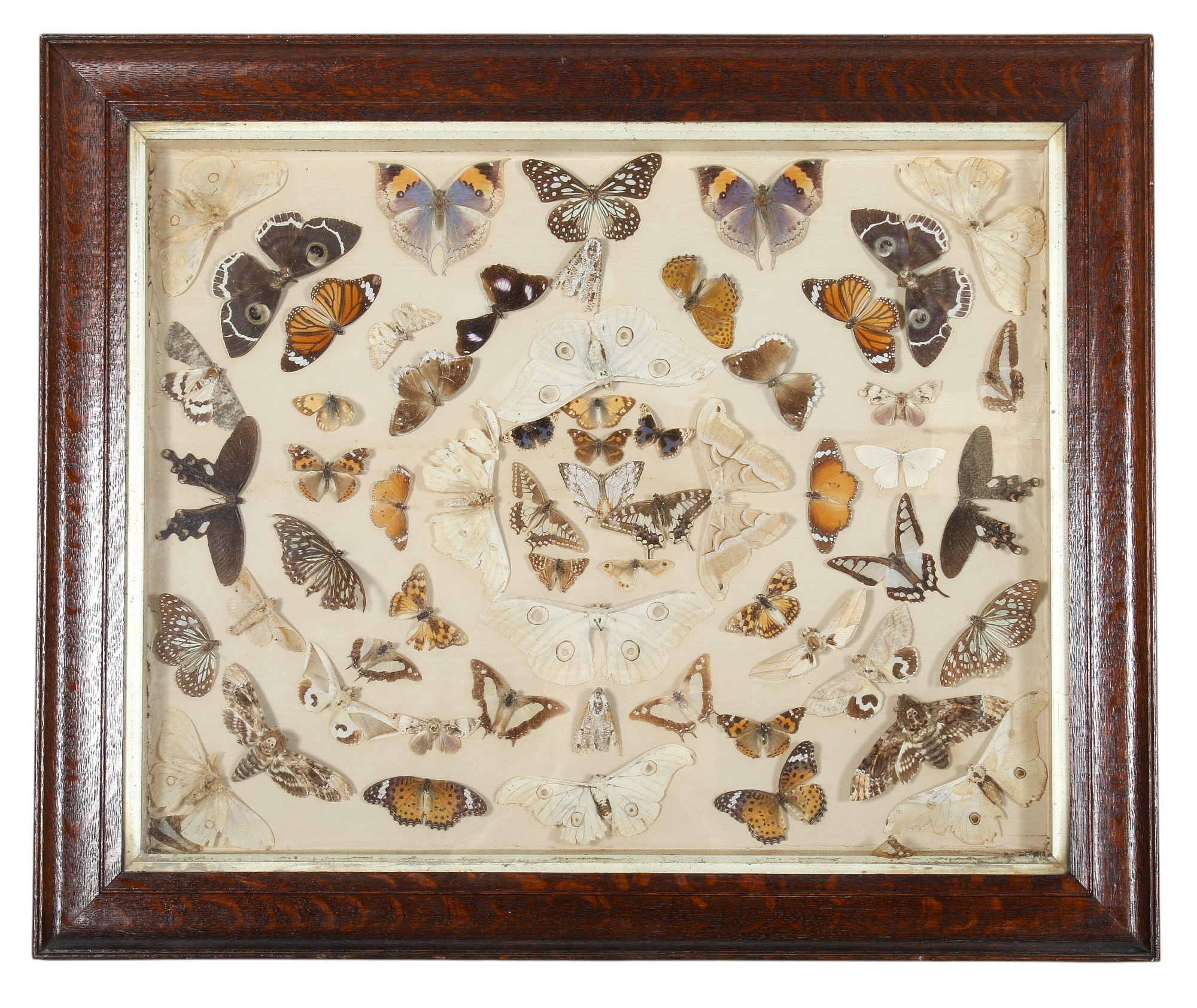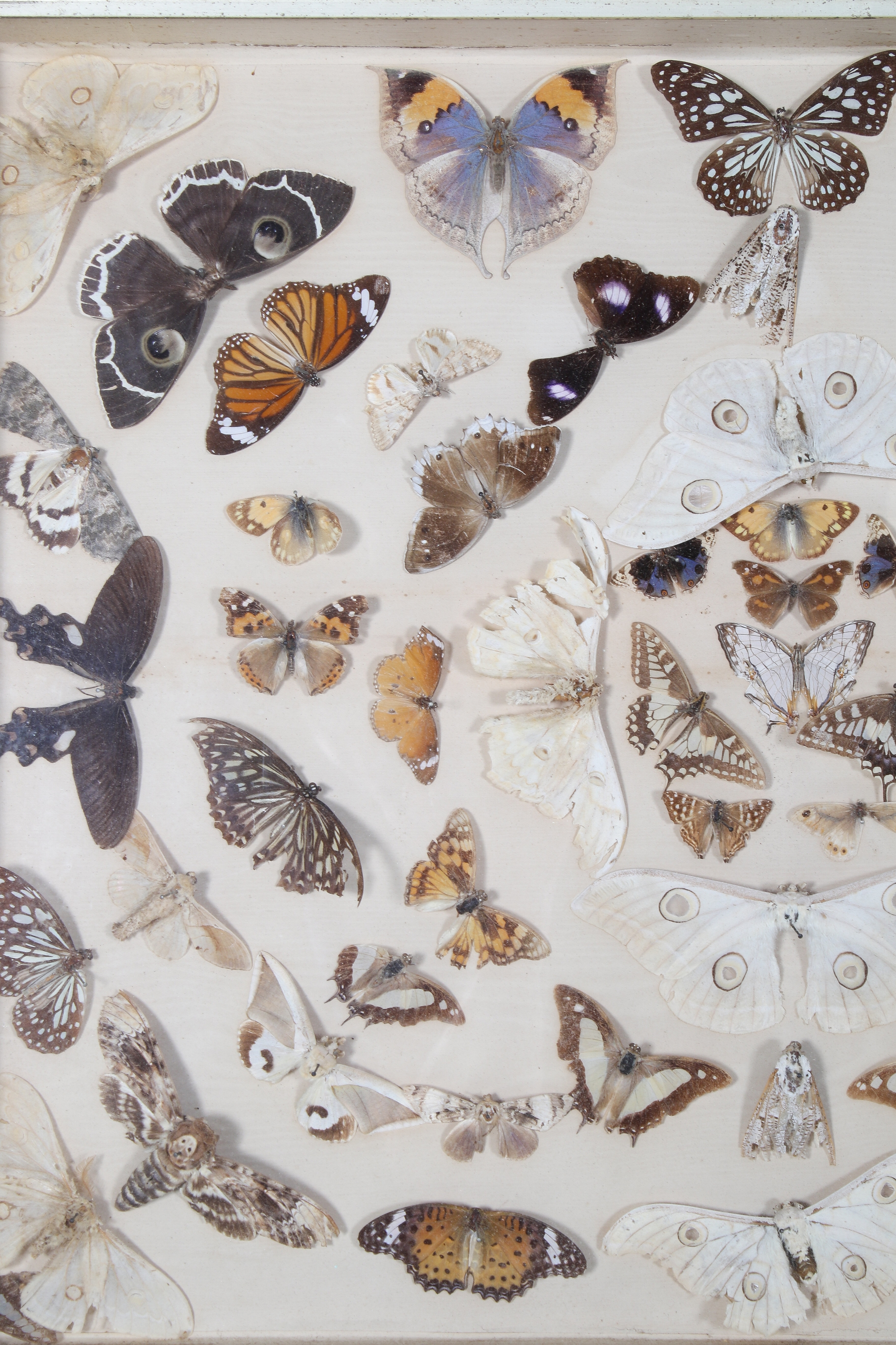 A glazed display cabinet containing a collection of moths and butterflies. The insects displayed in a circular pattern, case measures 63cm x 75cm
