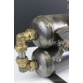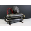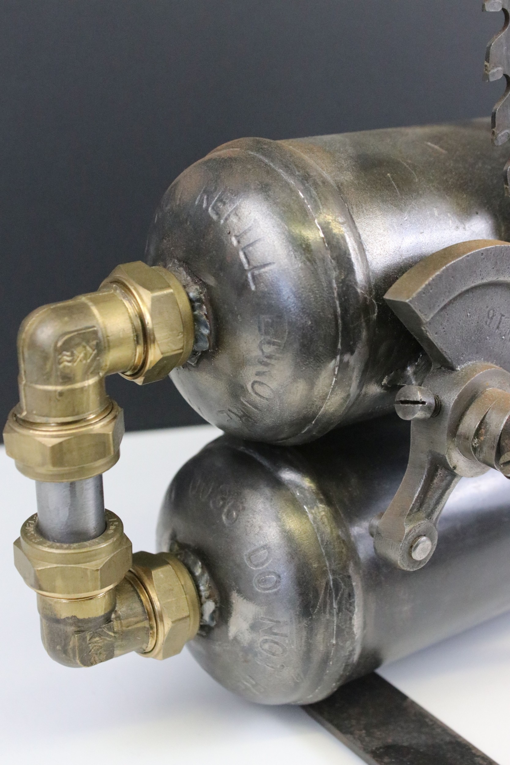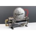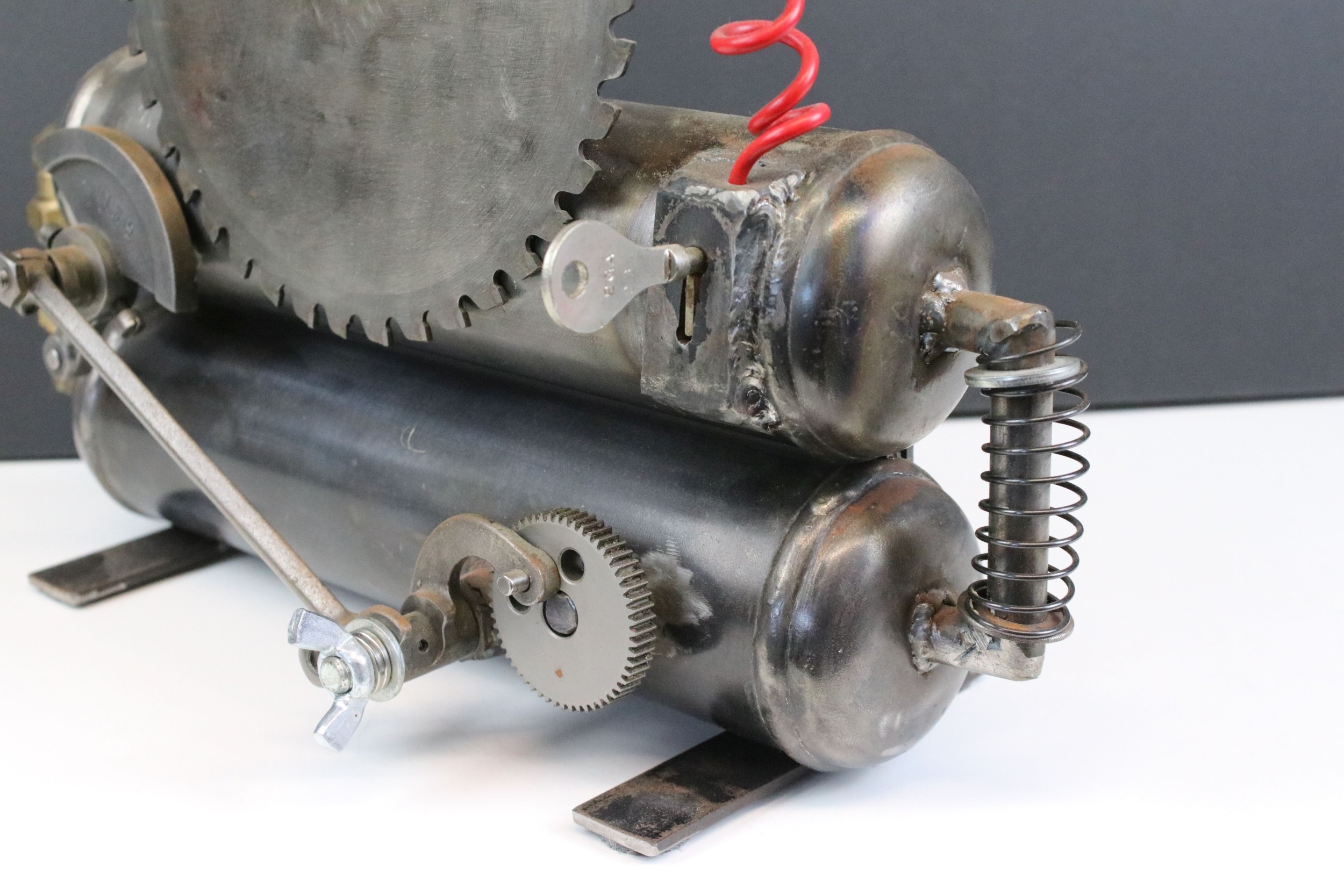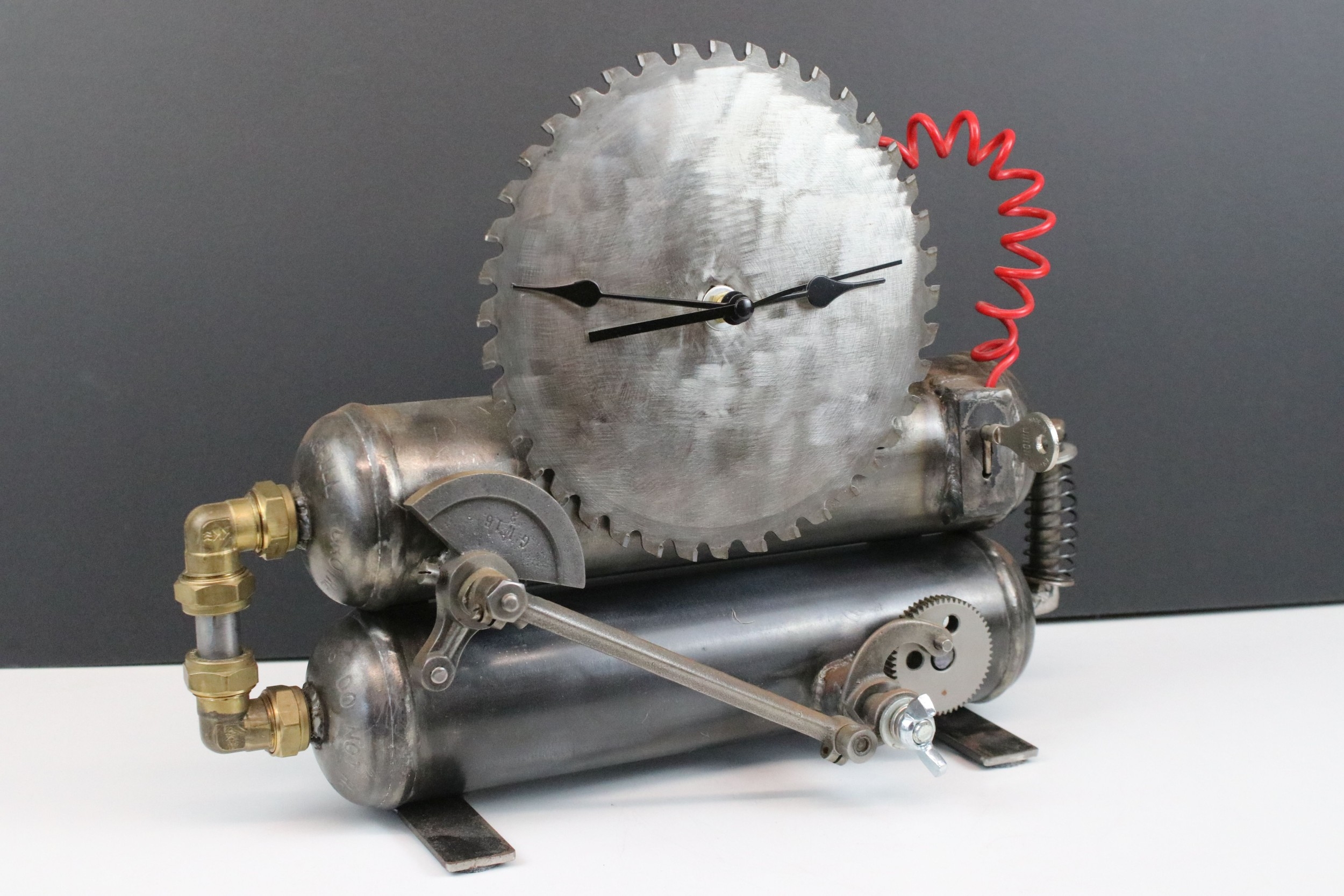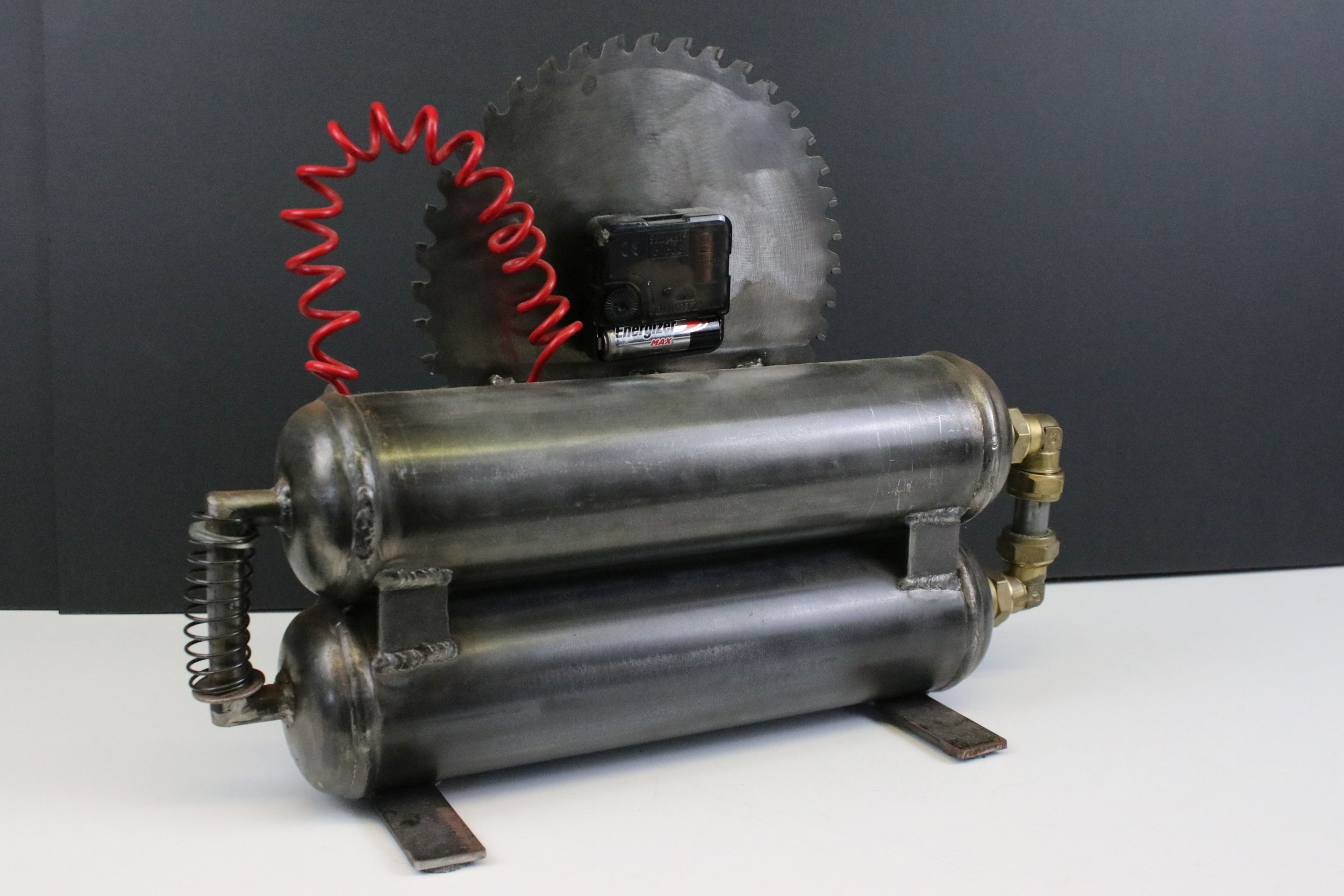 An upcycled decorative steam punk style wall clock, circular saw dial with gas cylinder body, quartz movement, measures approx 38cm in height