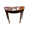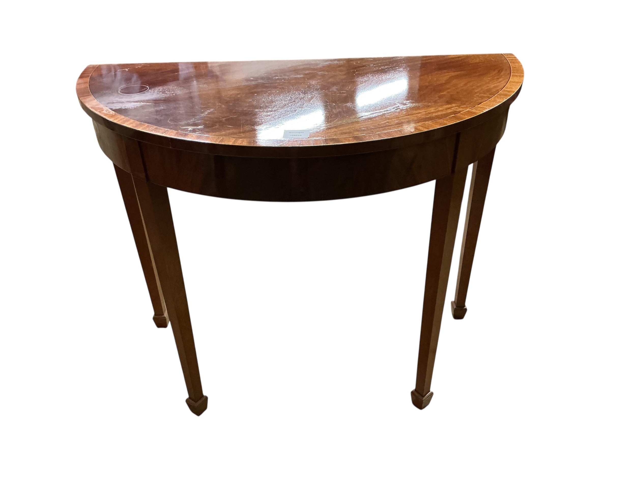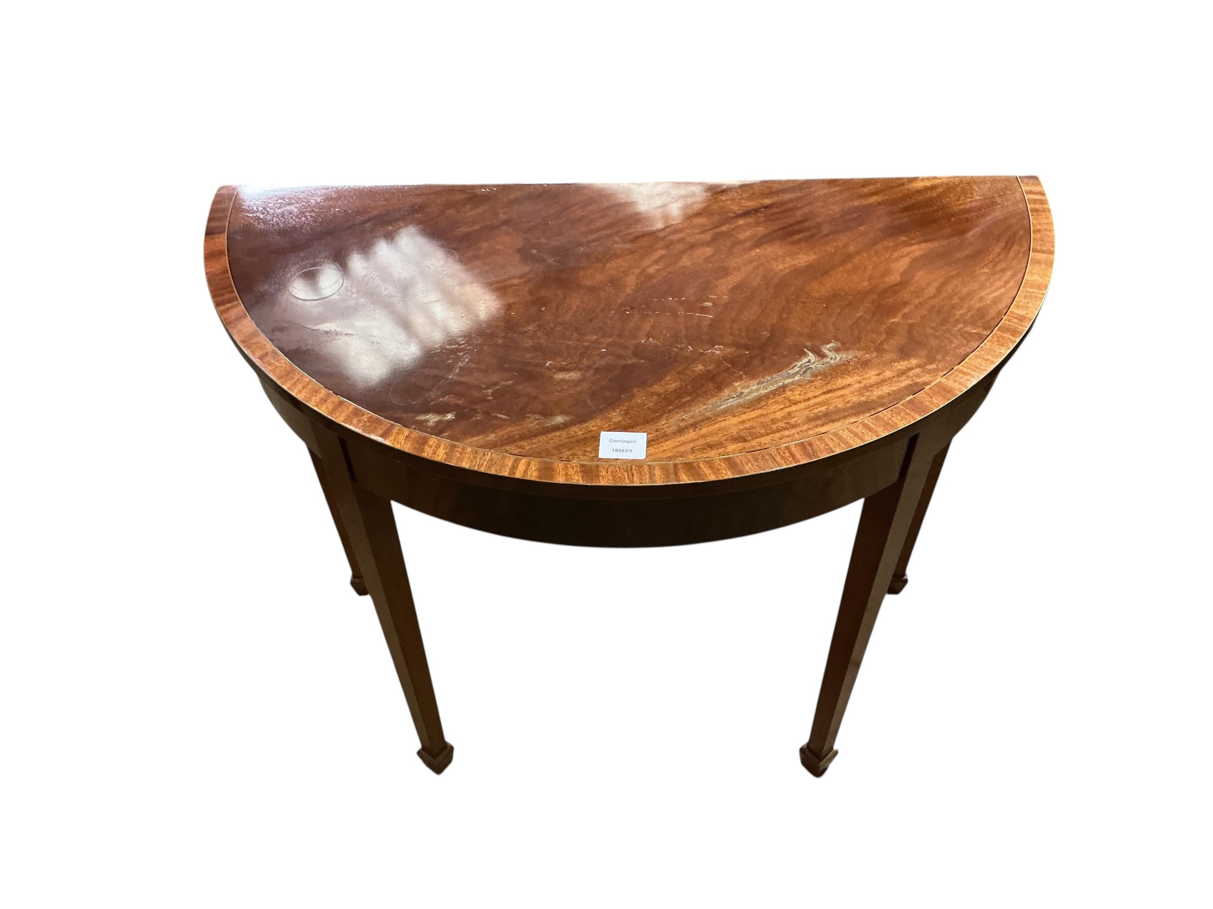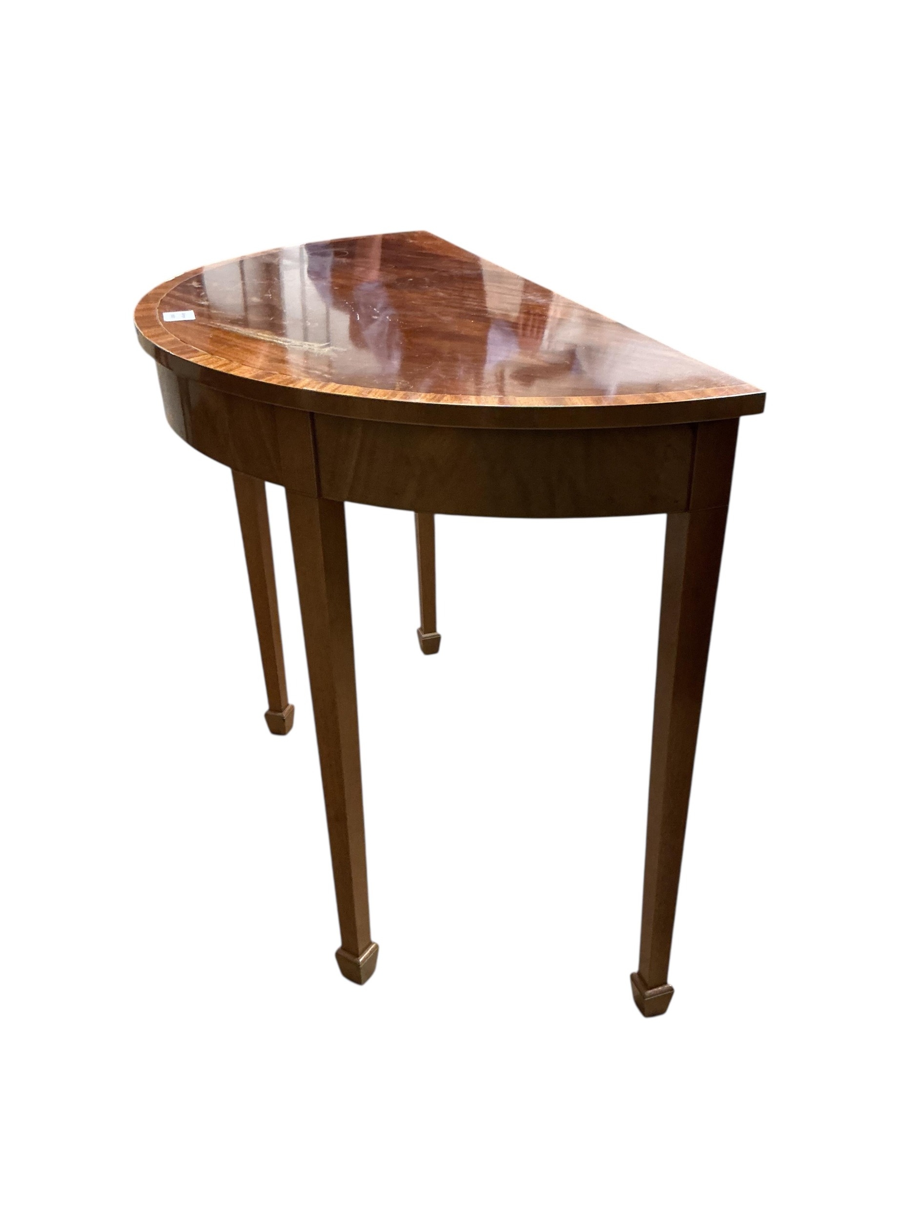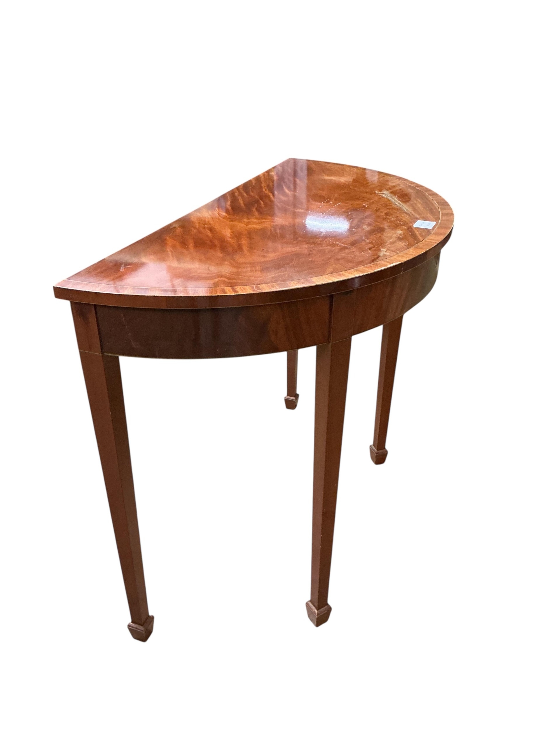 A George III style banded mahogany demi-lune side table, width 92cm, depth 46cm, height 74cm