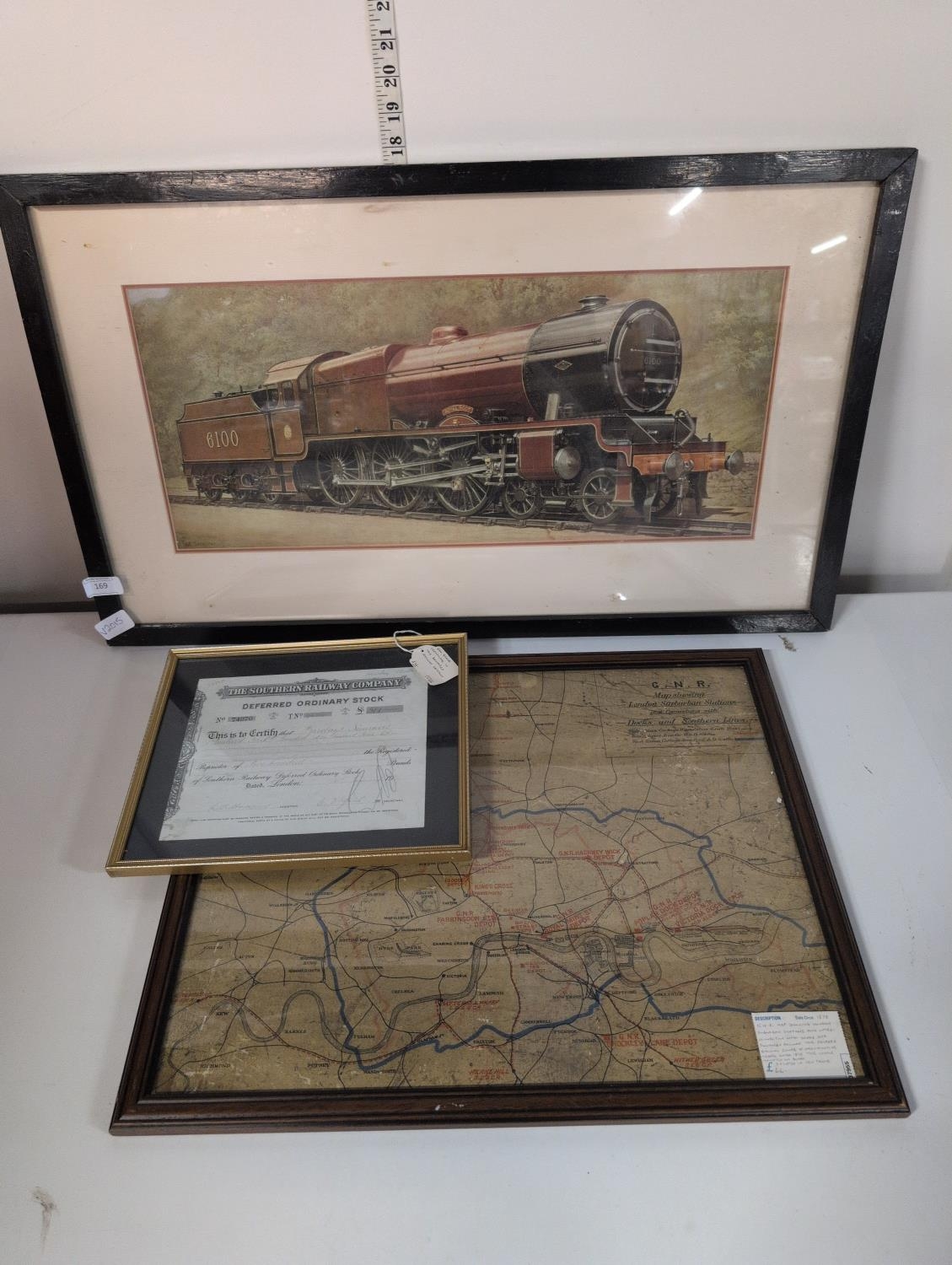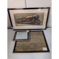 A Group of Three Framed Railway Items, including an LMS Steam Locomotive Print, Largest 75 x 49 CM, Shipping Unavailable