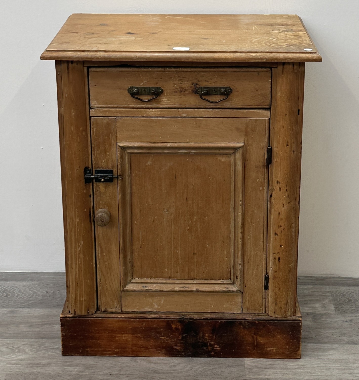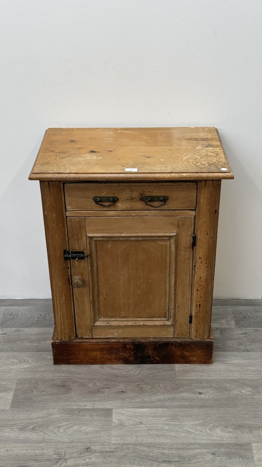 In need of restoration, the right hand side panel has various splitting, further splitting and losses are visible to the plinth and left hand side panel, extensive signs of water damage and later added handles and latch.