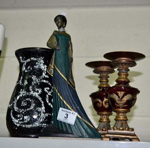 Figurine + Ornate Candle Holders + Crackle Glass Vase