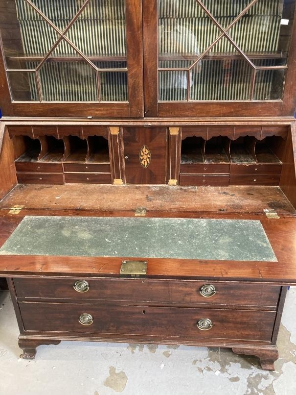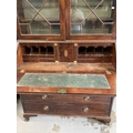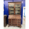 Late 18th cent. Mahogany bureau bookcase, the moulded cornice above two astragal glazed doors, three adjustable shelves inside, the bureau fall opening to reveal a fitted interior below two short over three long drawers, brass handles, standing on ogee bracket feet. 95ins. x 23ins. x 48ins.