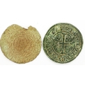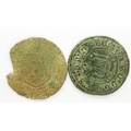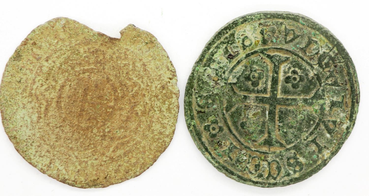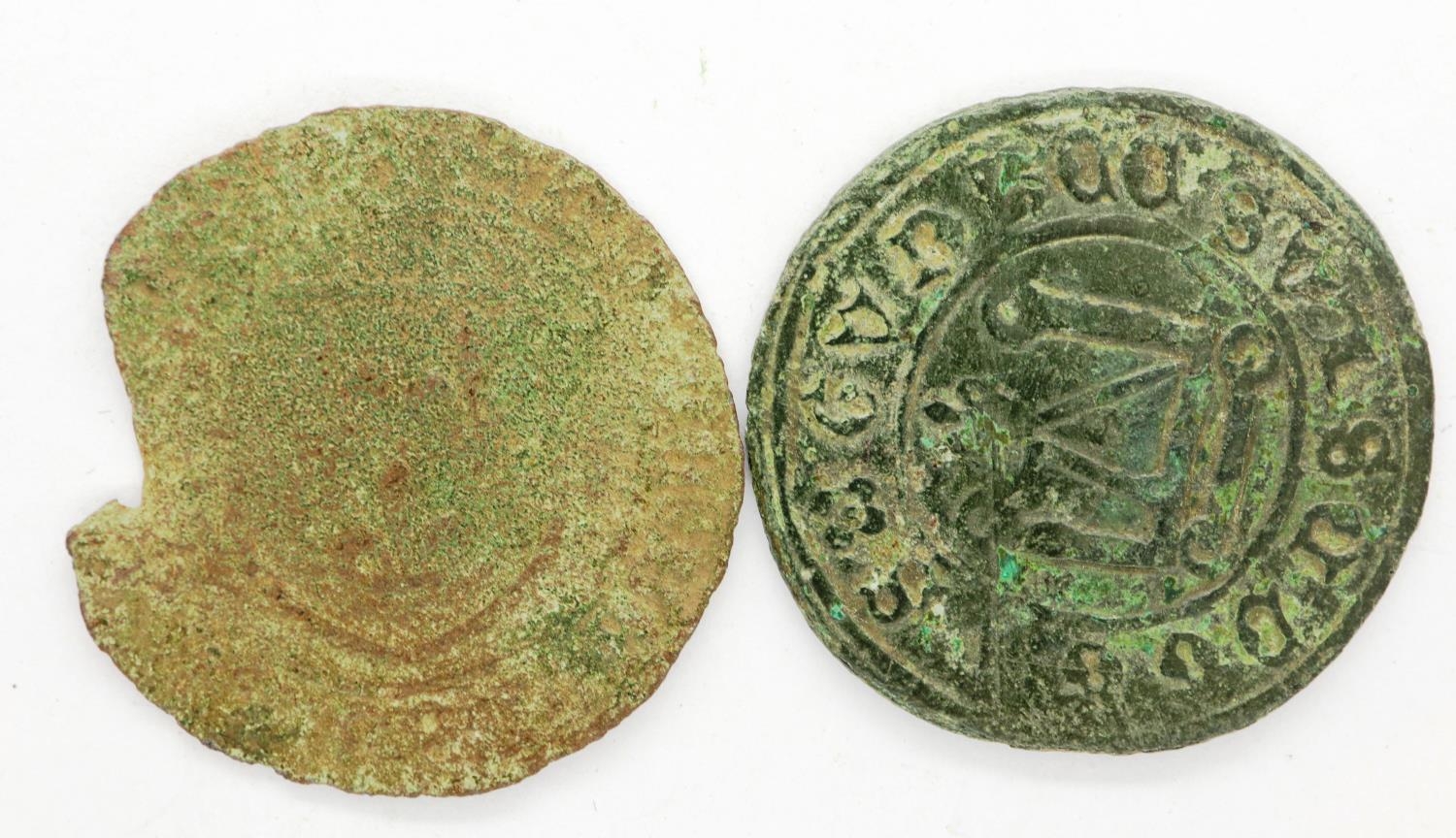 Two Medieval brass jettons, D: 25 mm. P&P Group 0 (£5+VAT for the first lot and £1+VAT for subsequent lots)