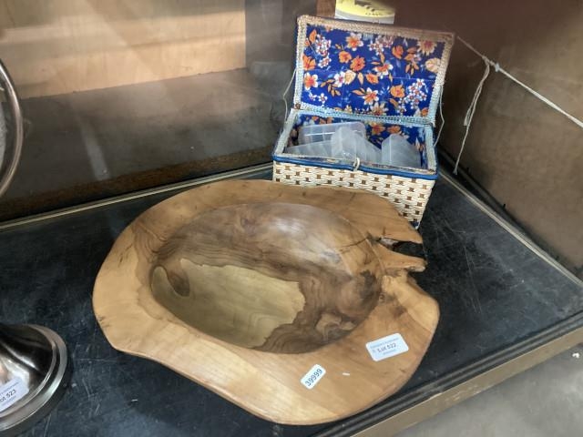 Treen carved bowl 40cm & vintage sewing case containing sewing requisites