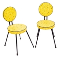 A pair of yellow vinyl covered side chairs, possibly by Willy van der Meeren, circa 1950s; the circular backs and seats on metal frames; 83cm high, 44cm wide