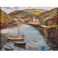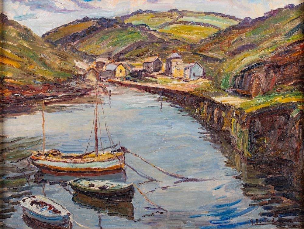 Guillermo Bestard i Canaves (Spanish, 1881-1969) View to a harbour town, moored boats in the foreground signed lower right oil on canvas 34 x 45cm