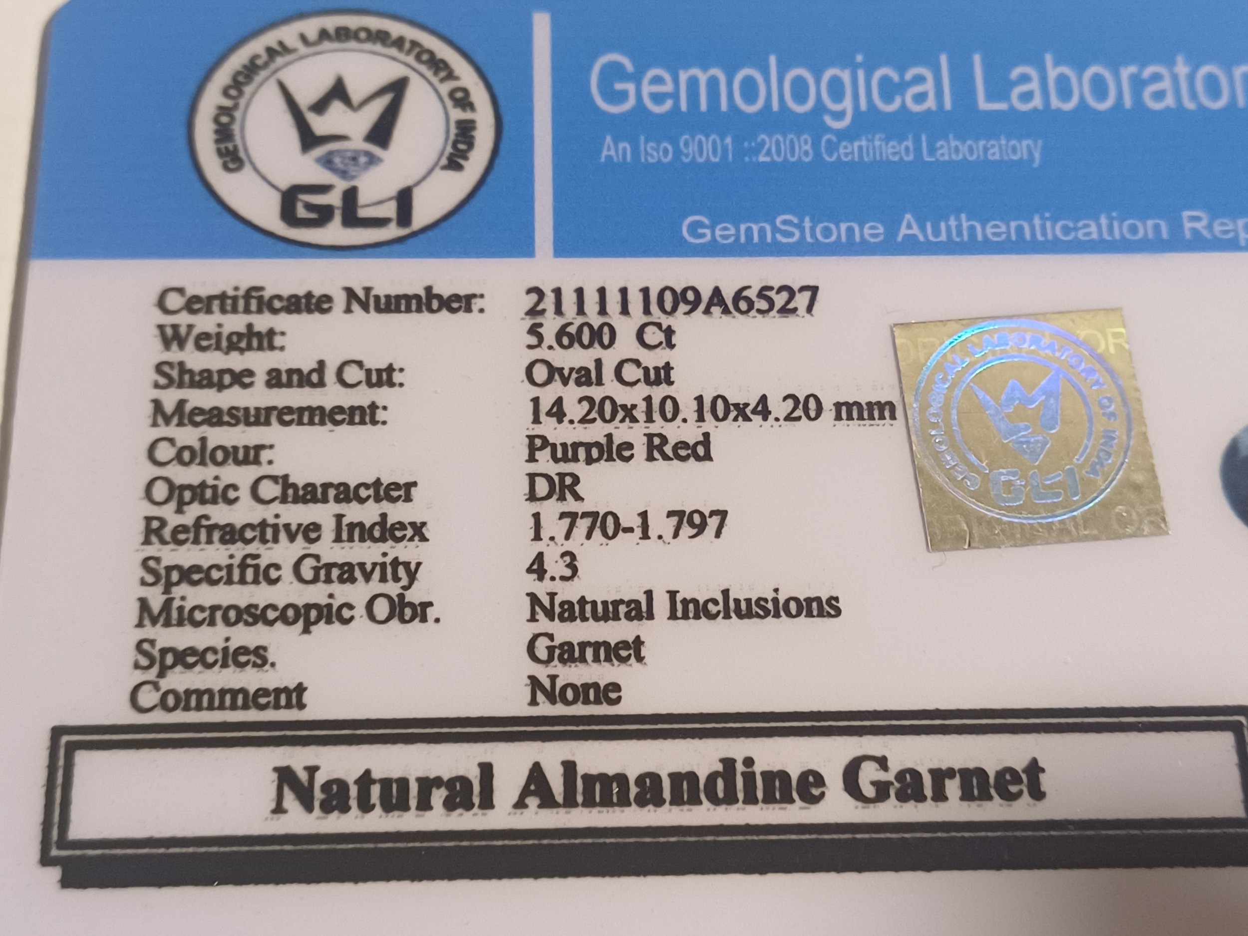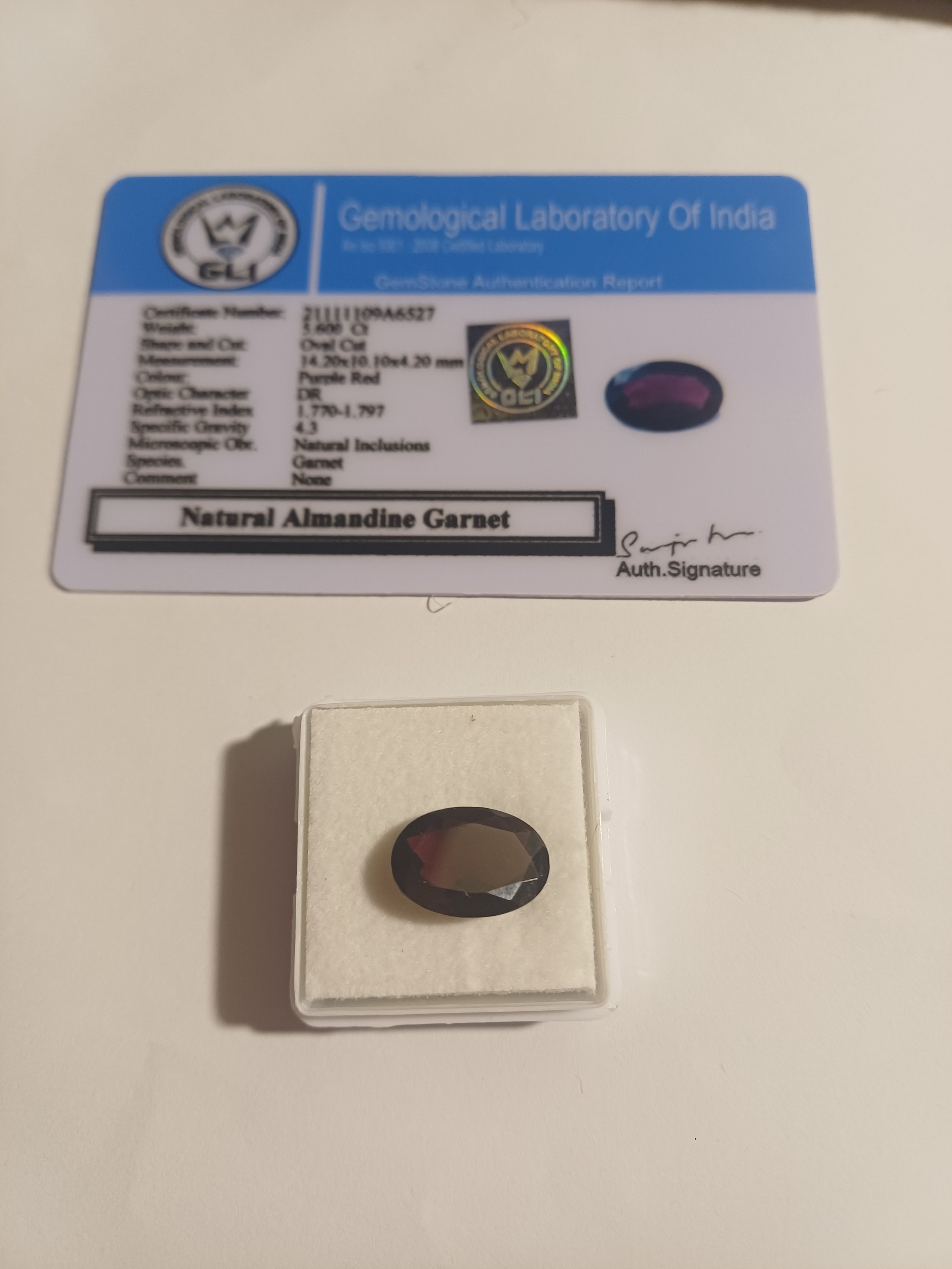 Natural Oval Cut Almadine Garnet, 5.6 ct with GLI Cert