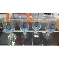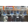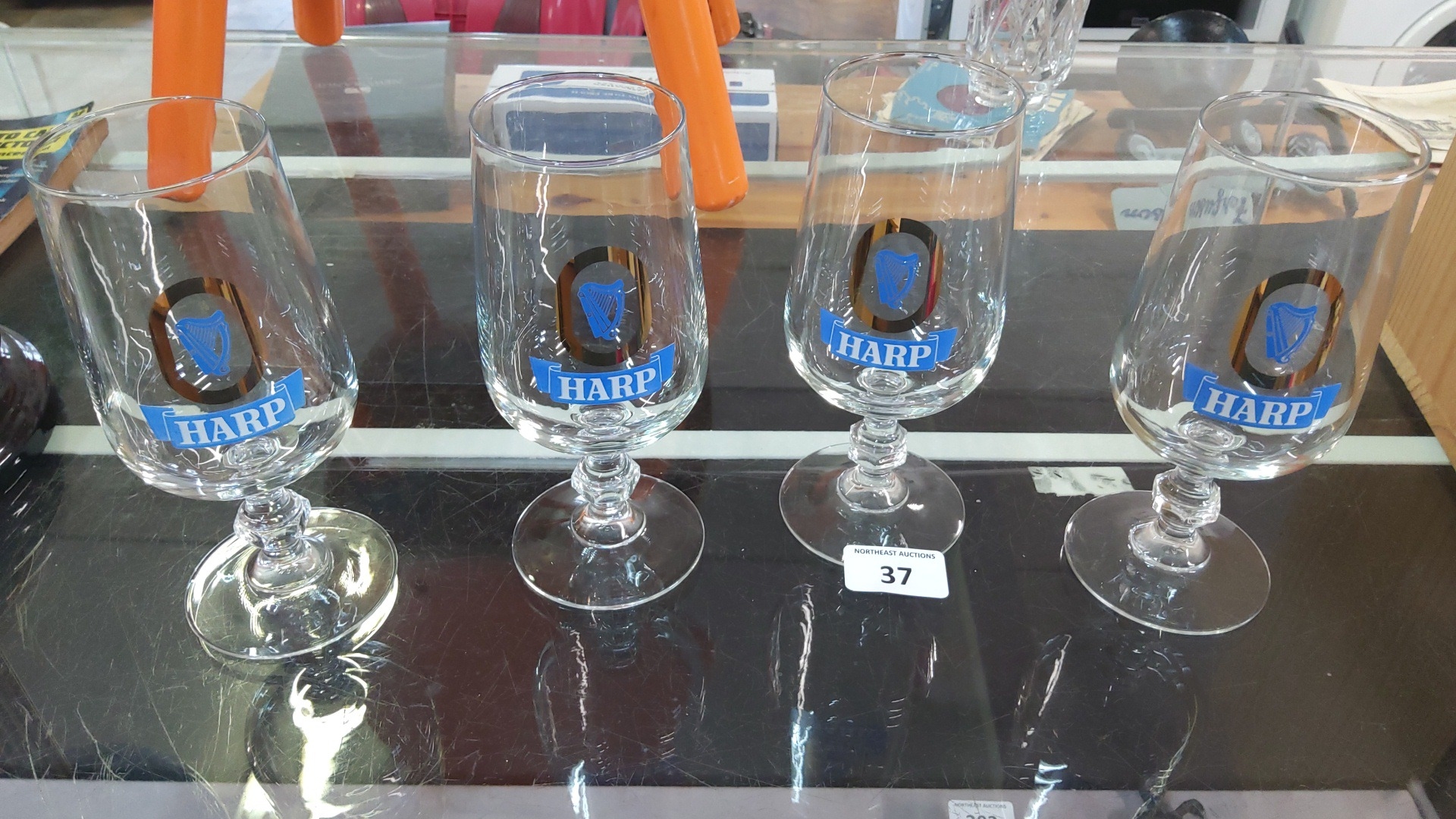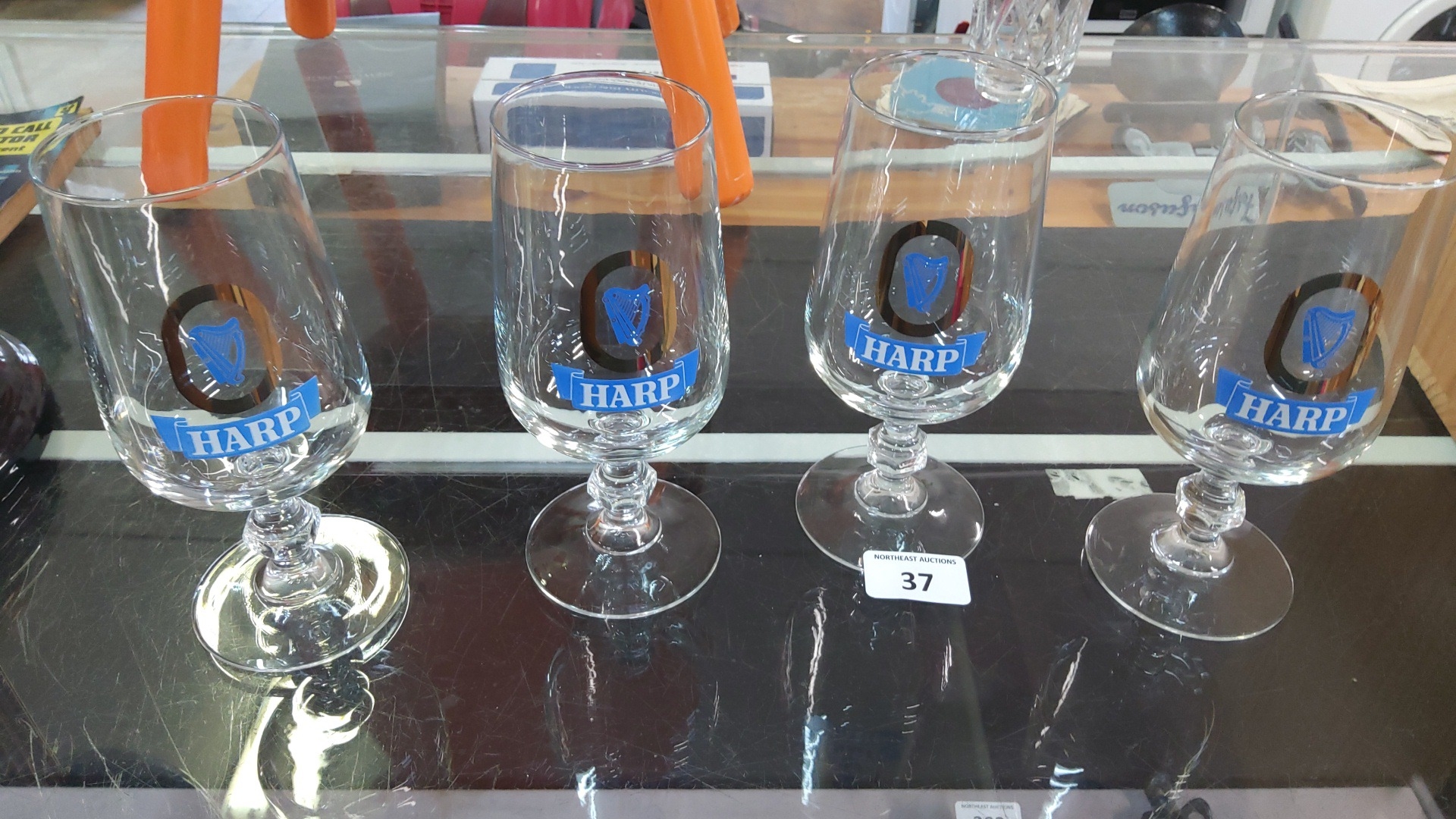 A group of Harp Lager branded stemmed beer goblets, each of tulip form with printed harp emblem and ribbon banner, on knop stems and circular feet.