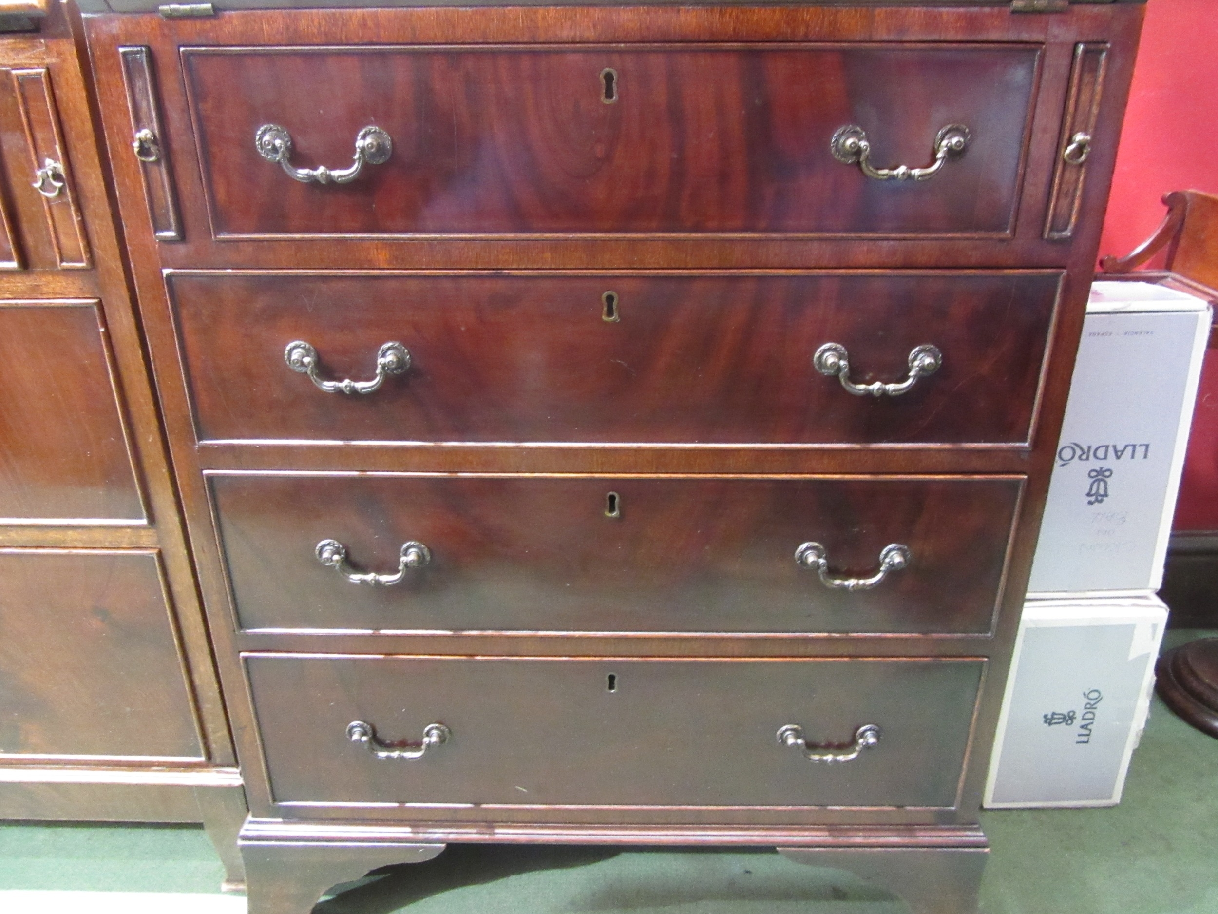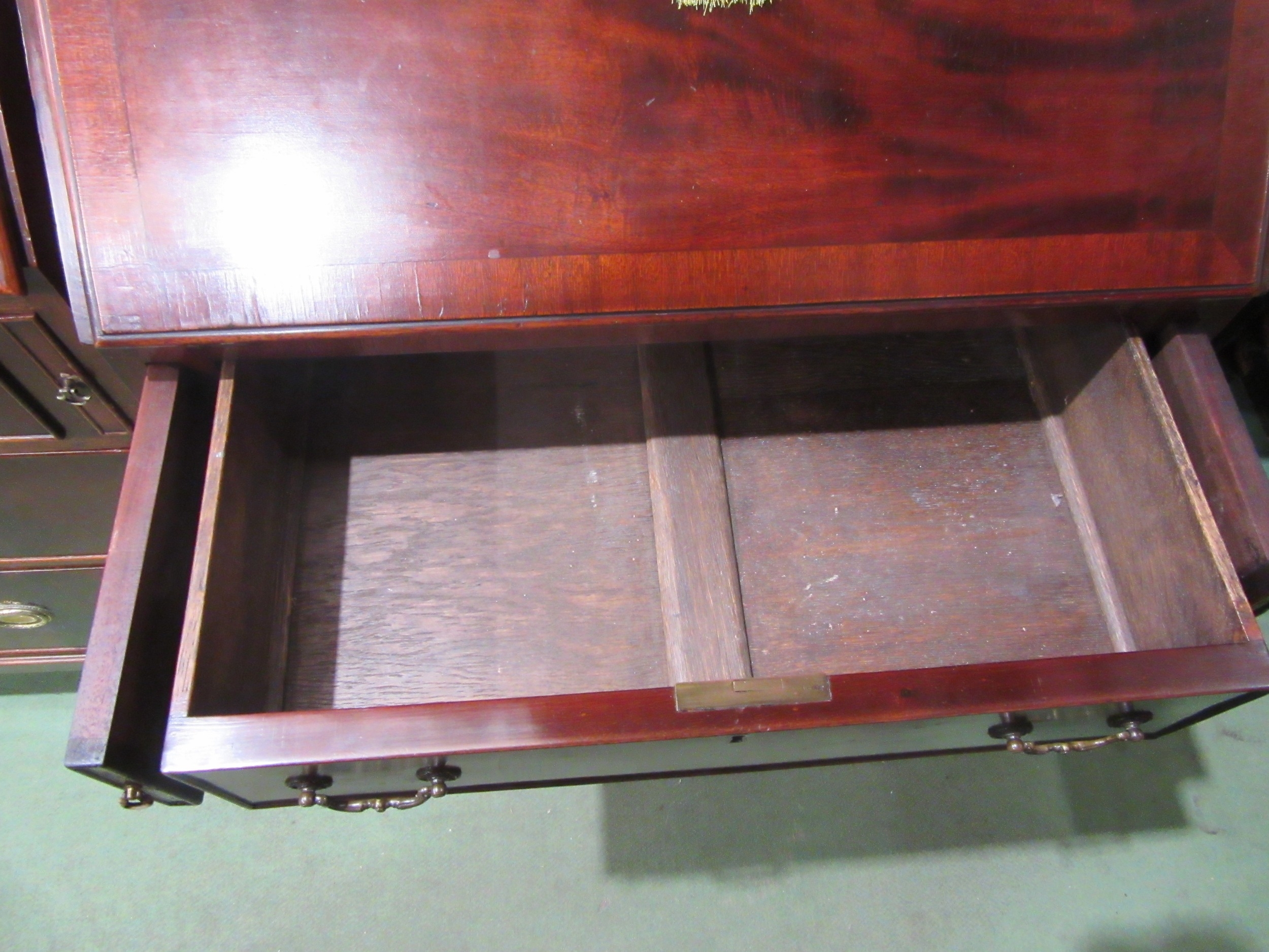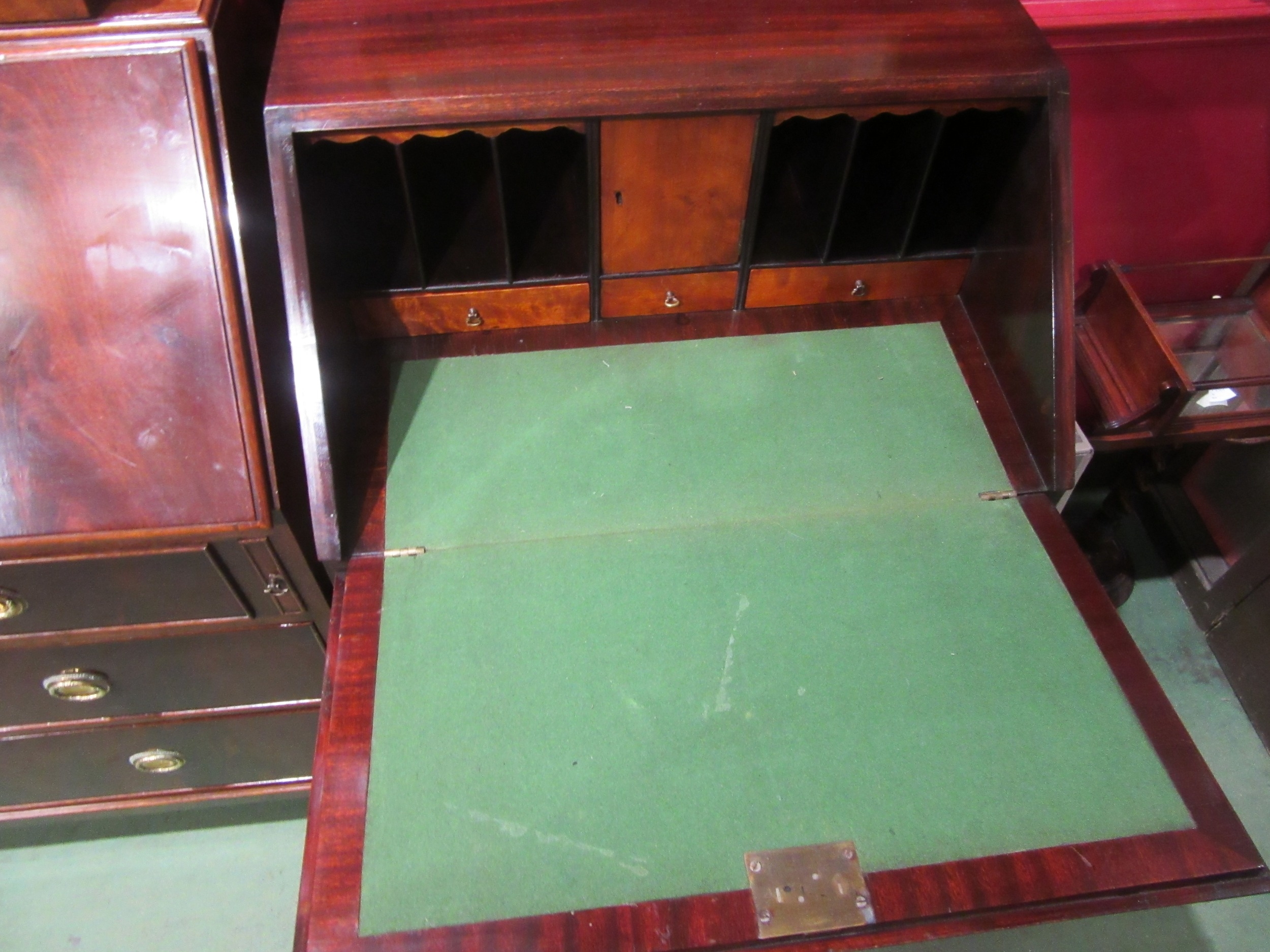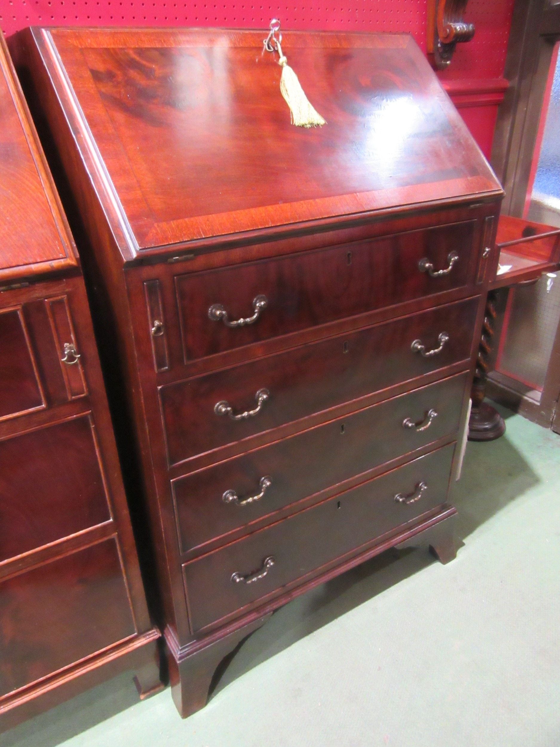 A George III style crossbanded flame mahogany bureau, the fitted interior over four drawers on outswept bracket feet (All locks working - 2 keys) 100cm tall x 65cm wide x 48cm deep