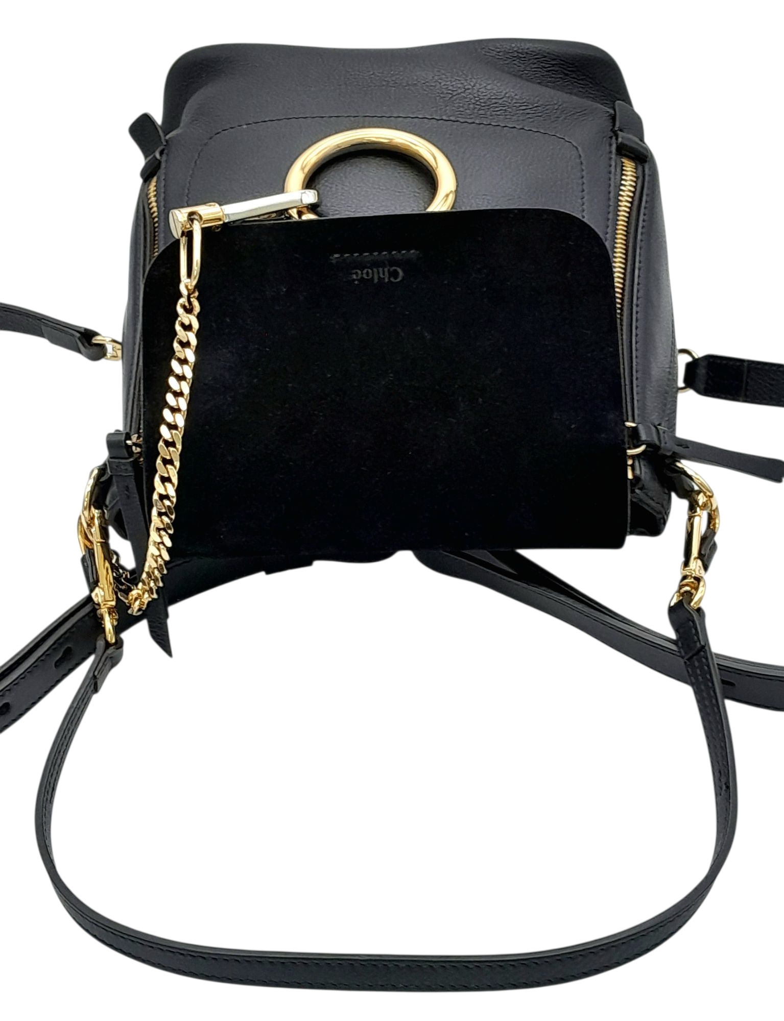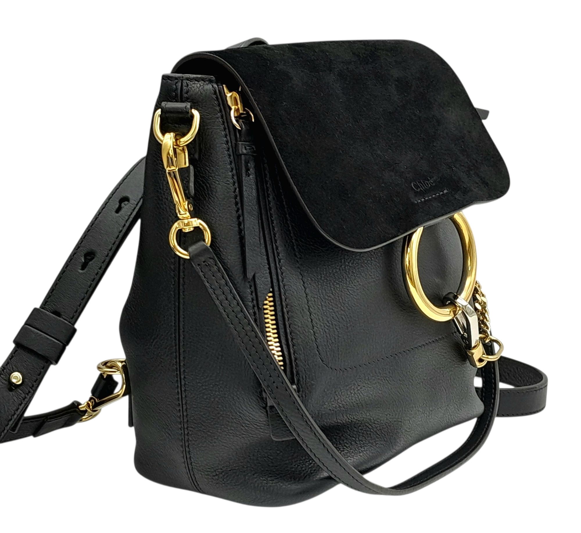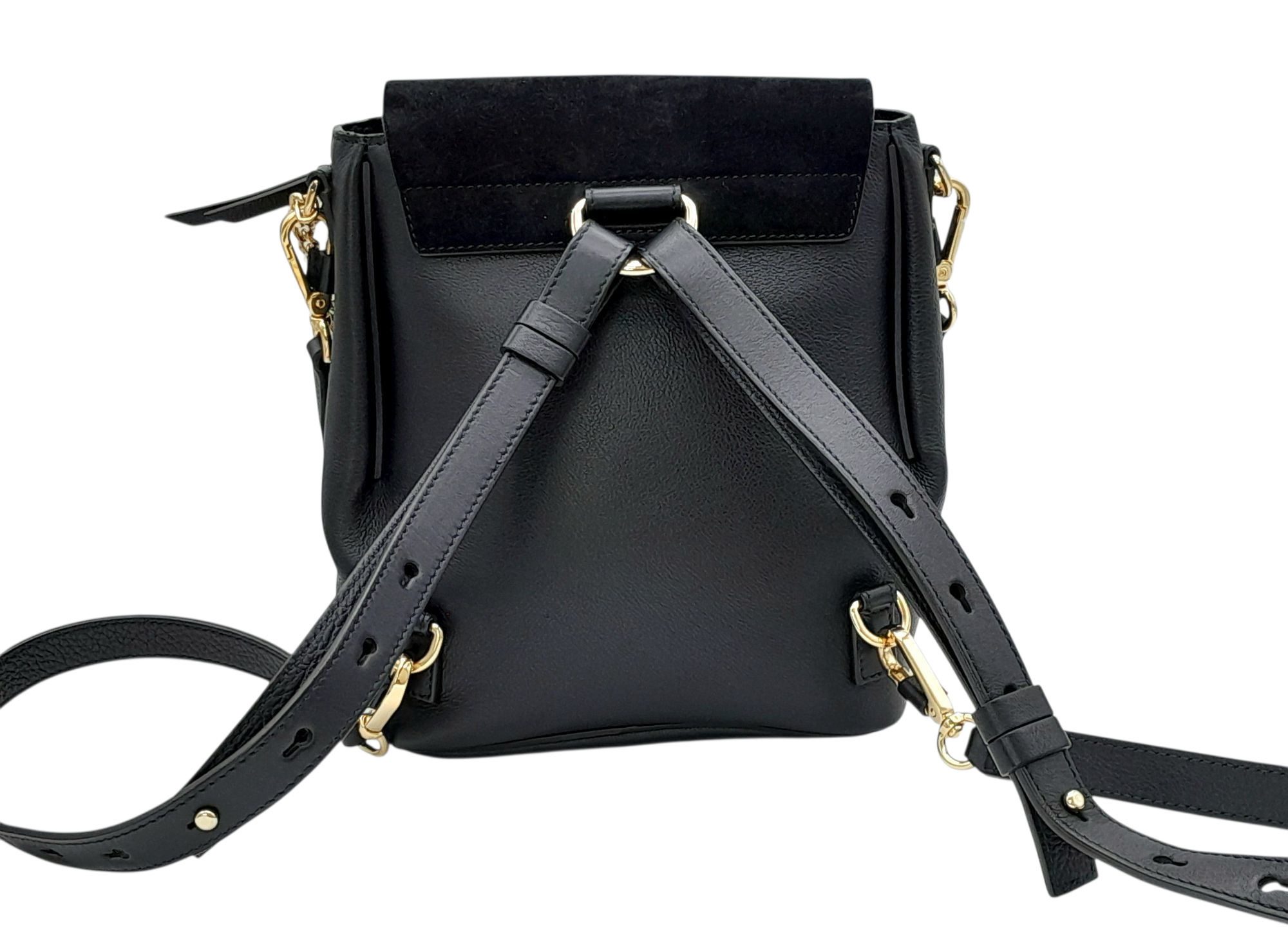 A Chloe Faye Medium Backpack in Black and Suede. Black leather and suede exterior with gold-toned hardware, adjustable leather shoulder straps, and magnetic snap closures. Beige textile interior with one main compartment, a zipped pocket and an open slip pocket. Some minor signs of wear exterior but in good condition overall. Approx 23cm height x 24cm width x 12cm depth. Comes with a care booklet and dust cover. Please see photos or request a condition report. Ref: STK022983