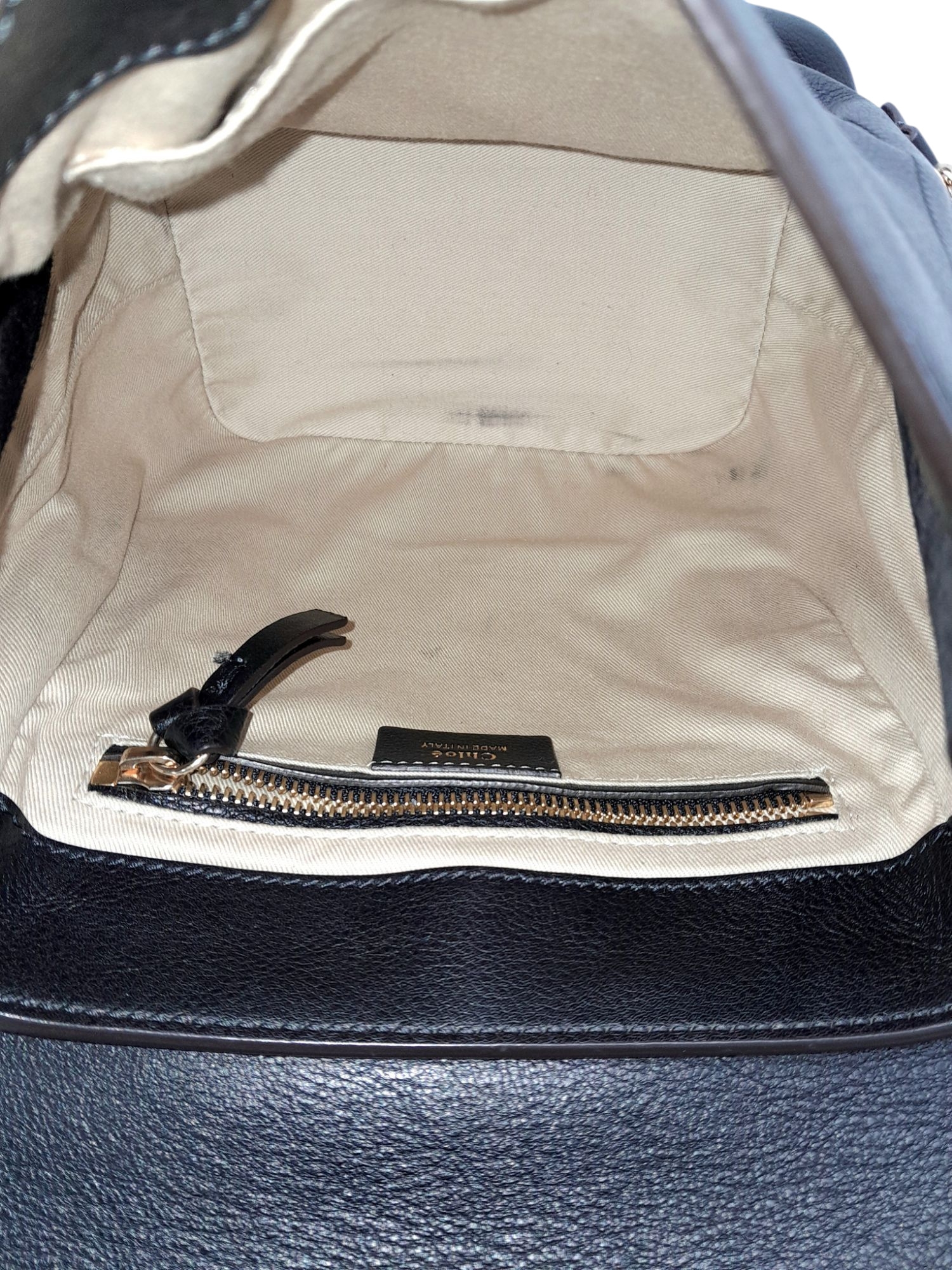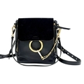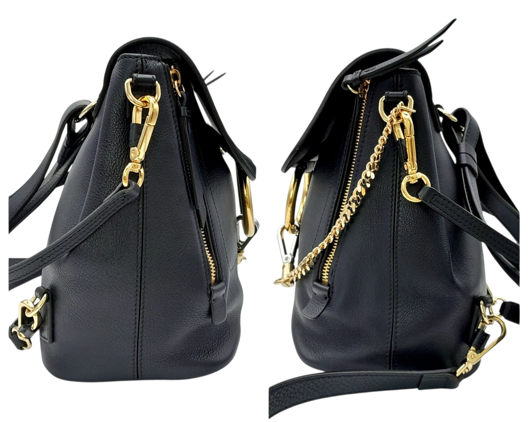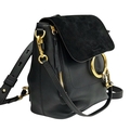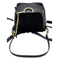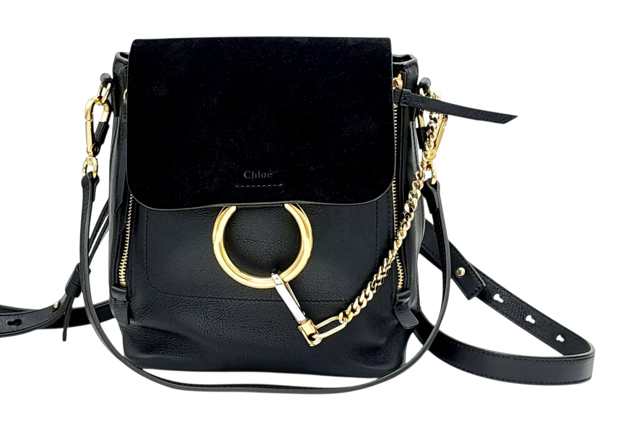 A Chloe Faye Medium Backpack in Black and Suede. Black leather and suede exterior with gold-toned hardware, adjustable leather shoulder straps, and magnetic snap closures. Beige textile interior with one main compartment, a zipped pocket and an open slip pocket. Some minor signs of wear exterior but in good condition overall. Approx 23cm height x 24cm width x 12cm depth. Comes with a care booklet and dust cover. Please see photos or request a condition report. Ref: STK022983