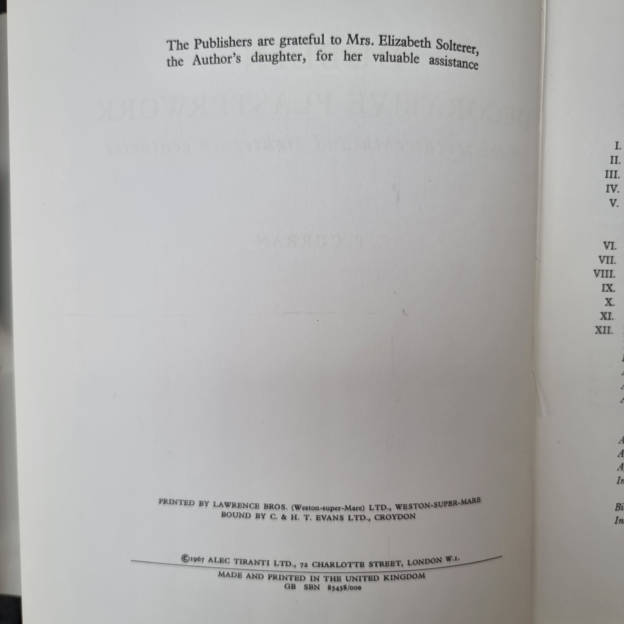 A hardback book entitled ''Dublin Decorative Plaster-work of the 17th and 18th Centuries'' by C.P. Curran, and published in 1967. With dustcover.