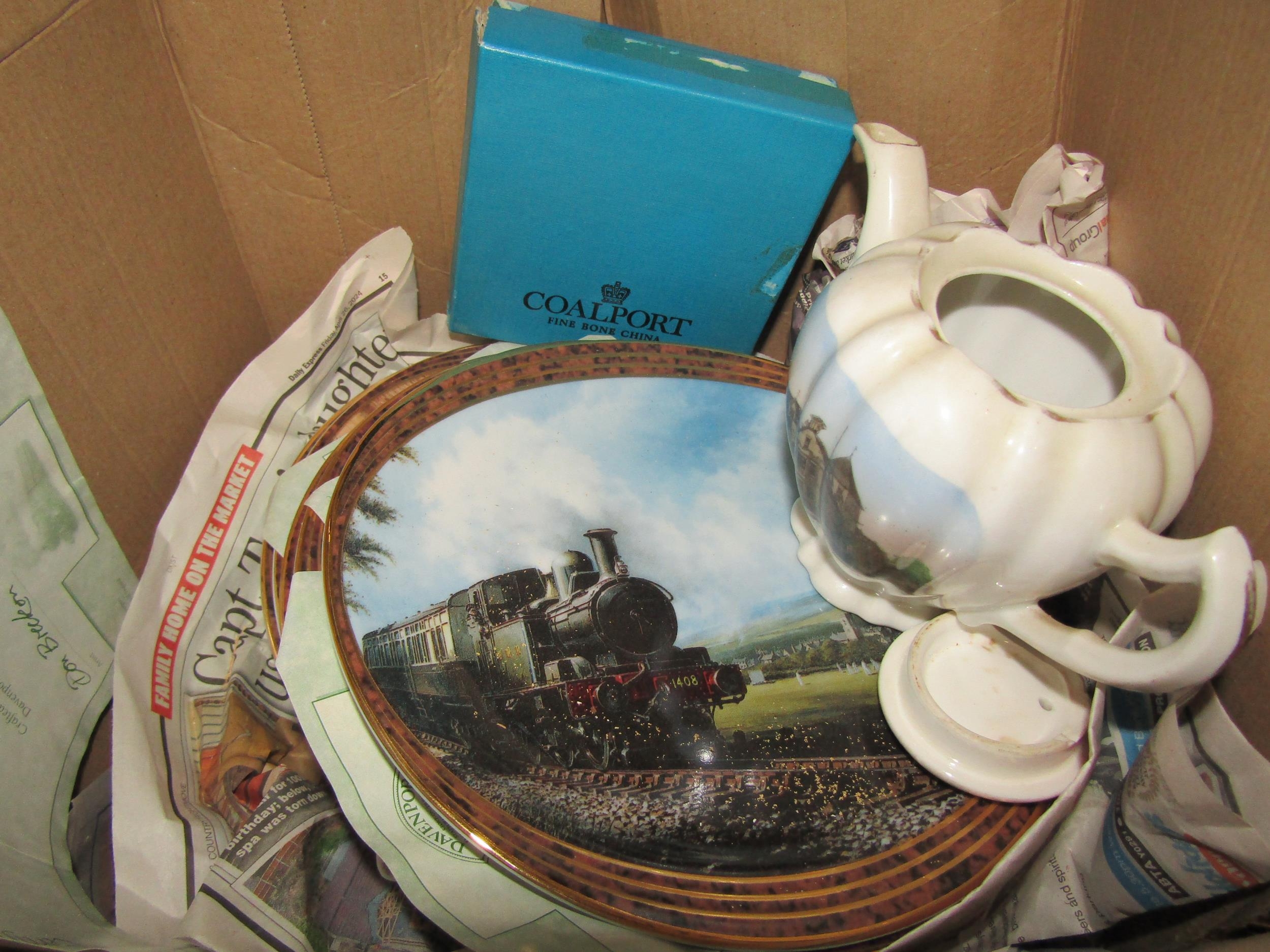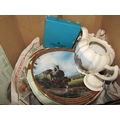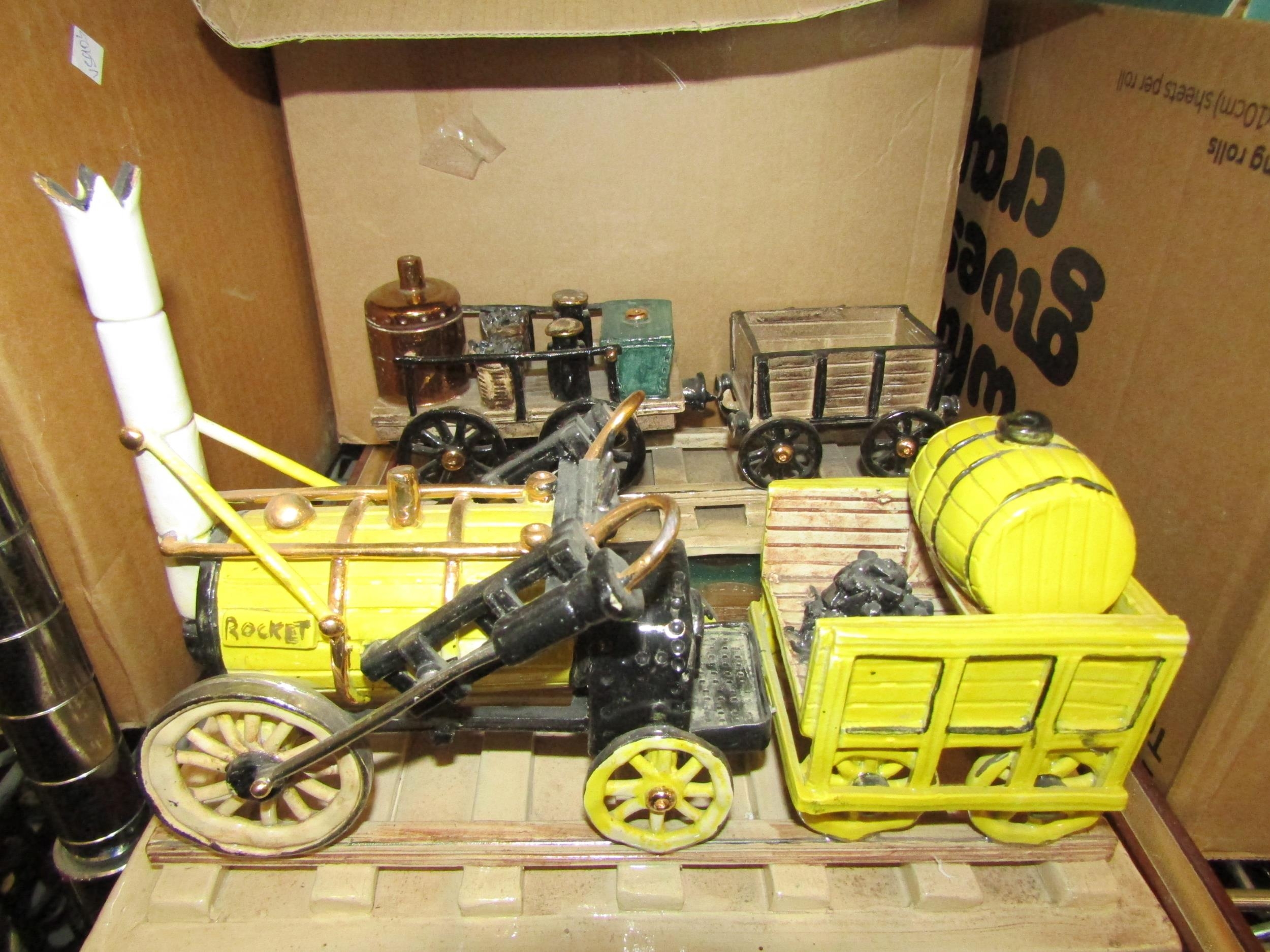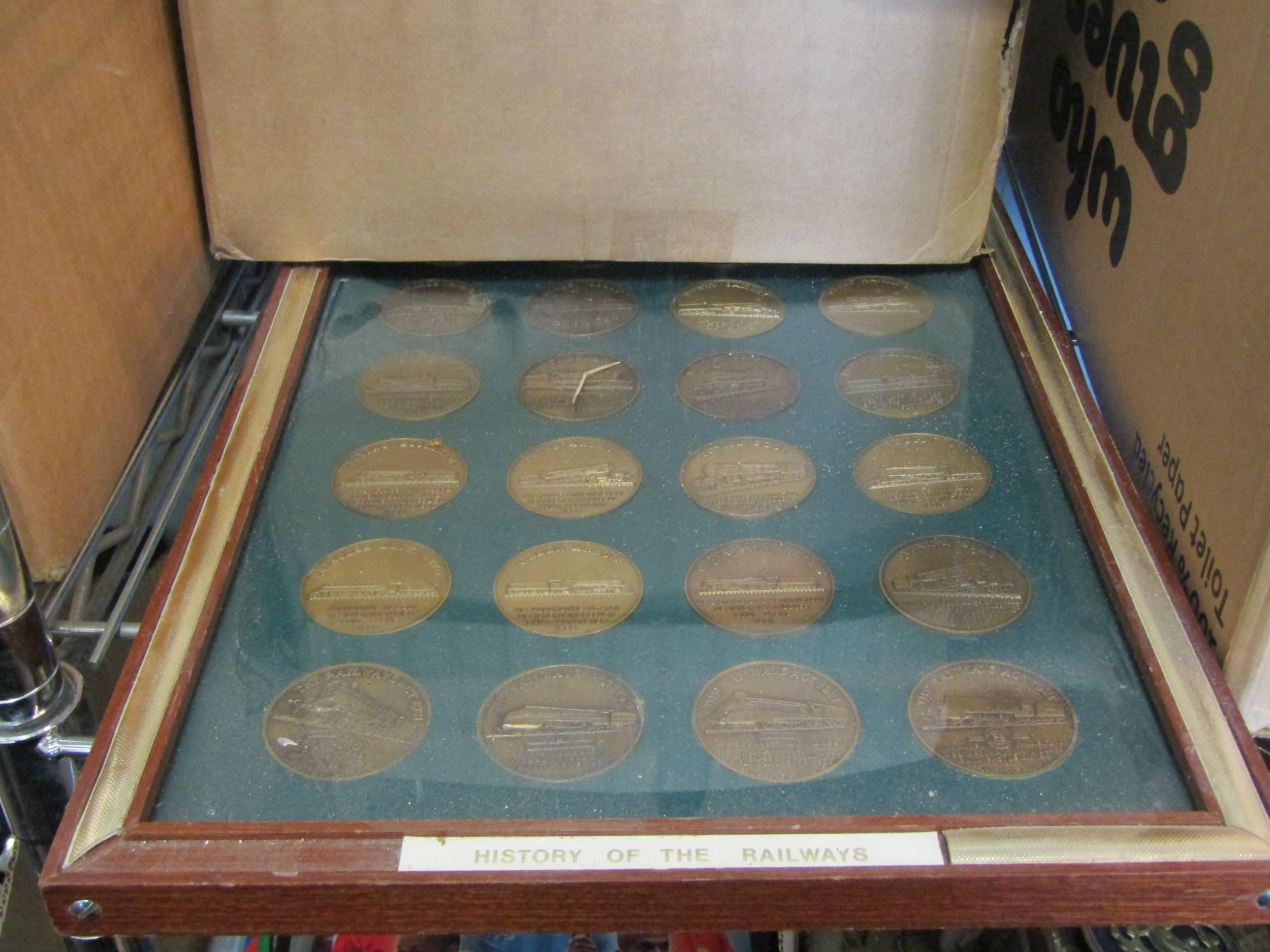 A collection of train related items including collectors plates, ceramic locomotive models and framed coins etc.