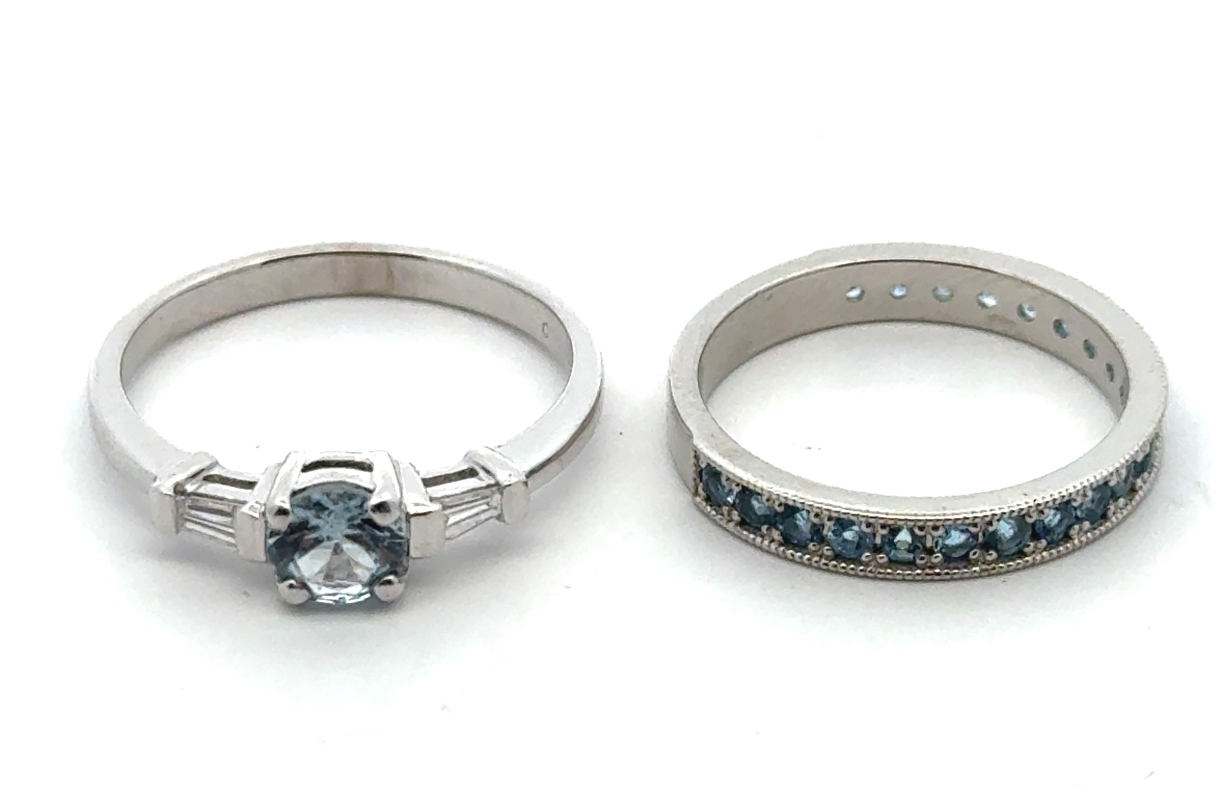 Two platinum and topaz rings. A three quarters eternity ring, set with 21 topazes. Size L, Birmingham hallmarks, sponsor SH. Gross weight 7.96g.