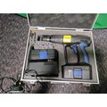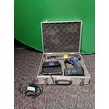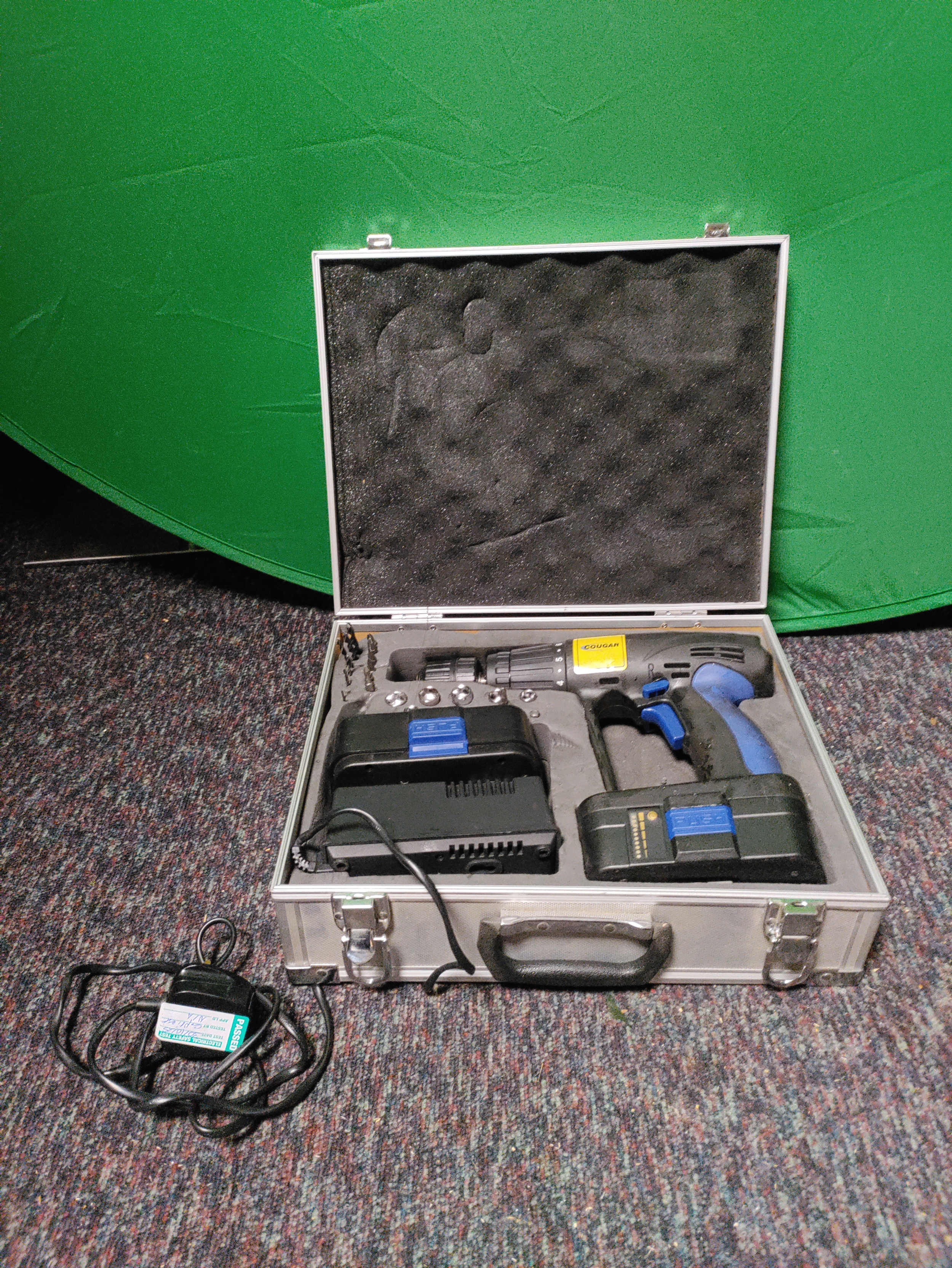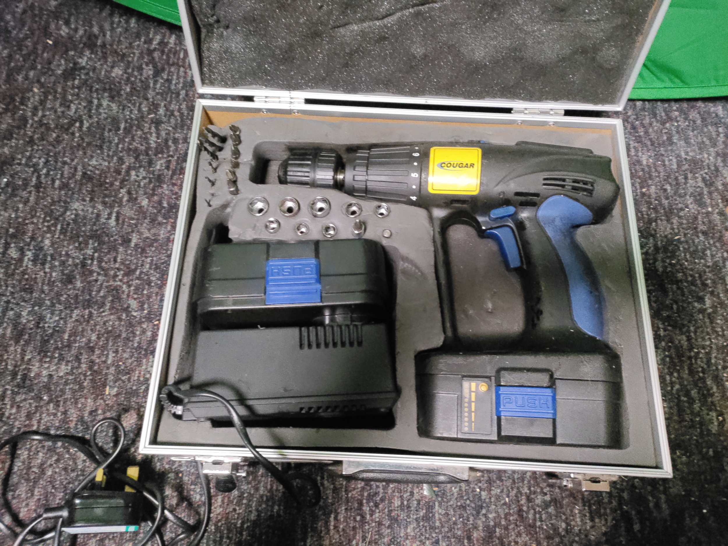 A cougar cordless drill in a metal carrying box.