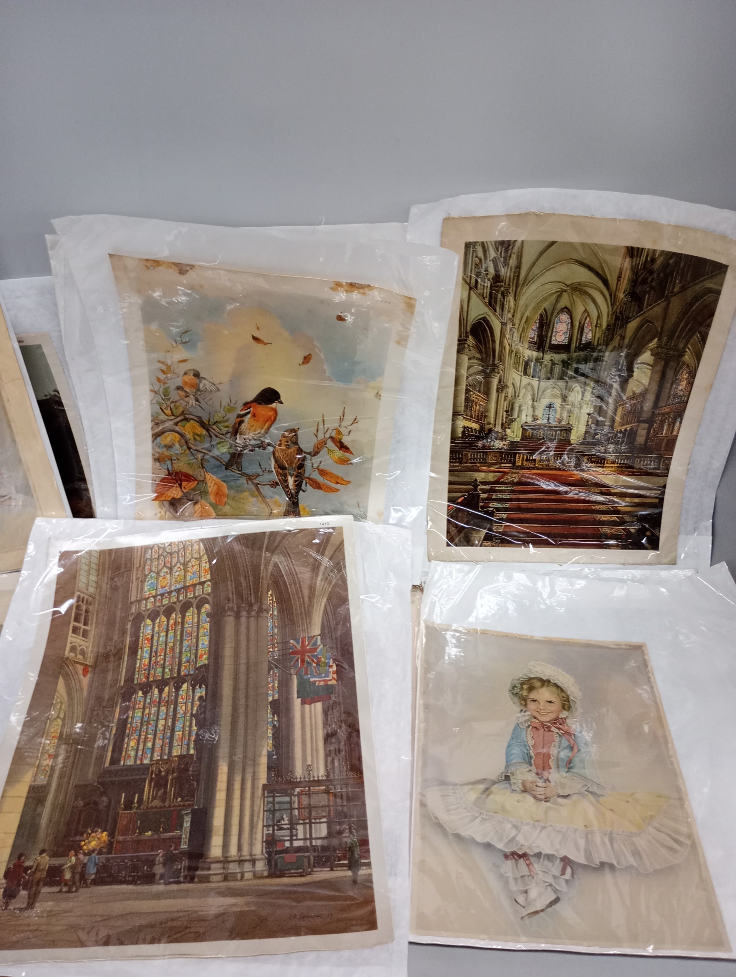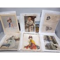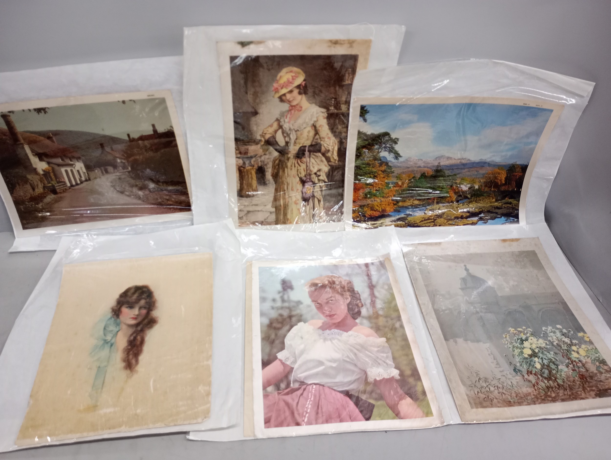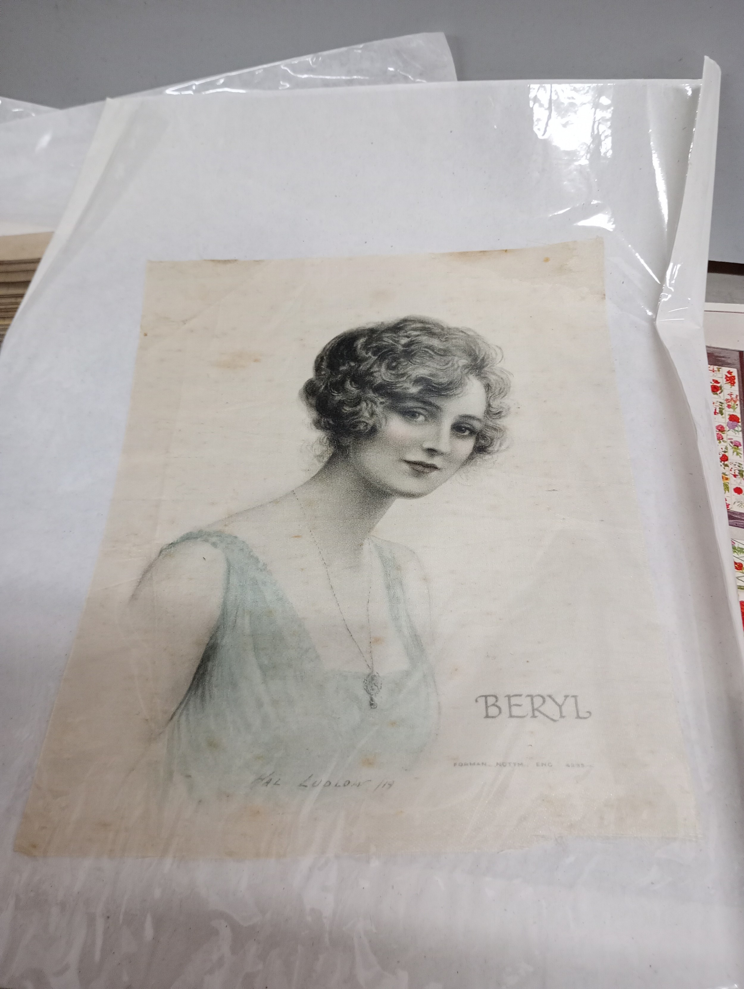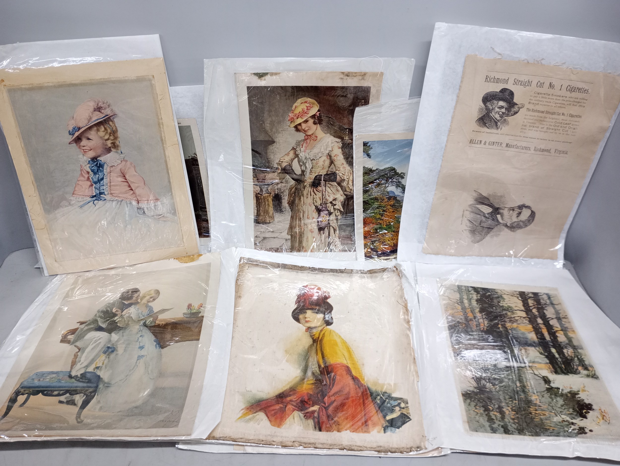 A collection of nineteen large silk pictures including a portrait marked Beryl, also marked Forman, Nottingham, one Allen & Ginter, Richmond Virginia, (cigarettes), other portraits of ladies, landscapes, cathedrals, flowers, birds, largest 24 x 31.5cm, also two John Players 'Suggestions' cards, a Singer bookmark, etc.