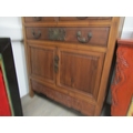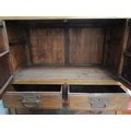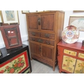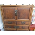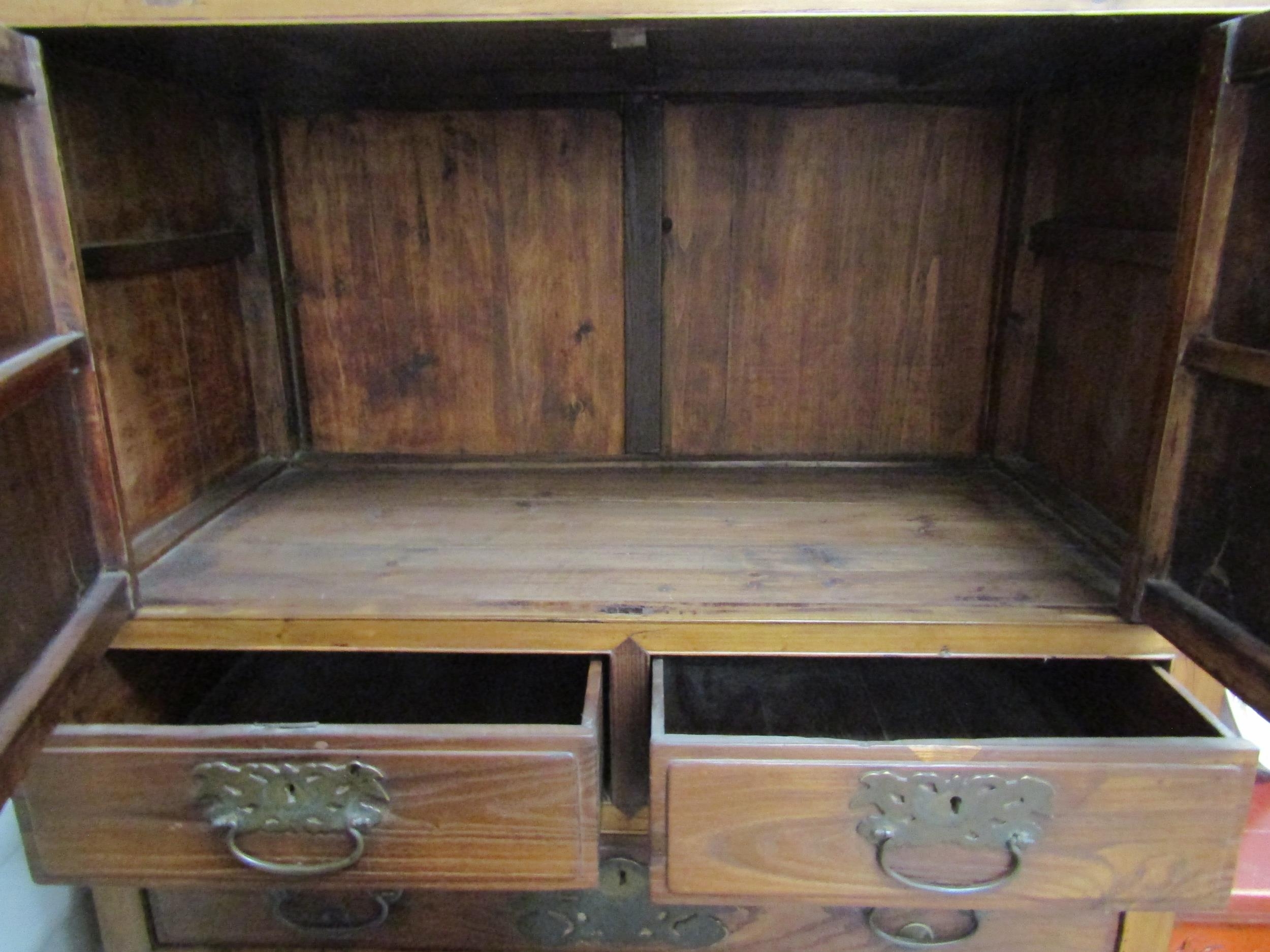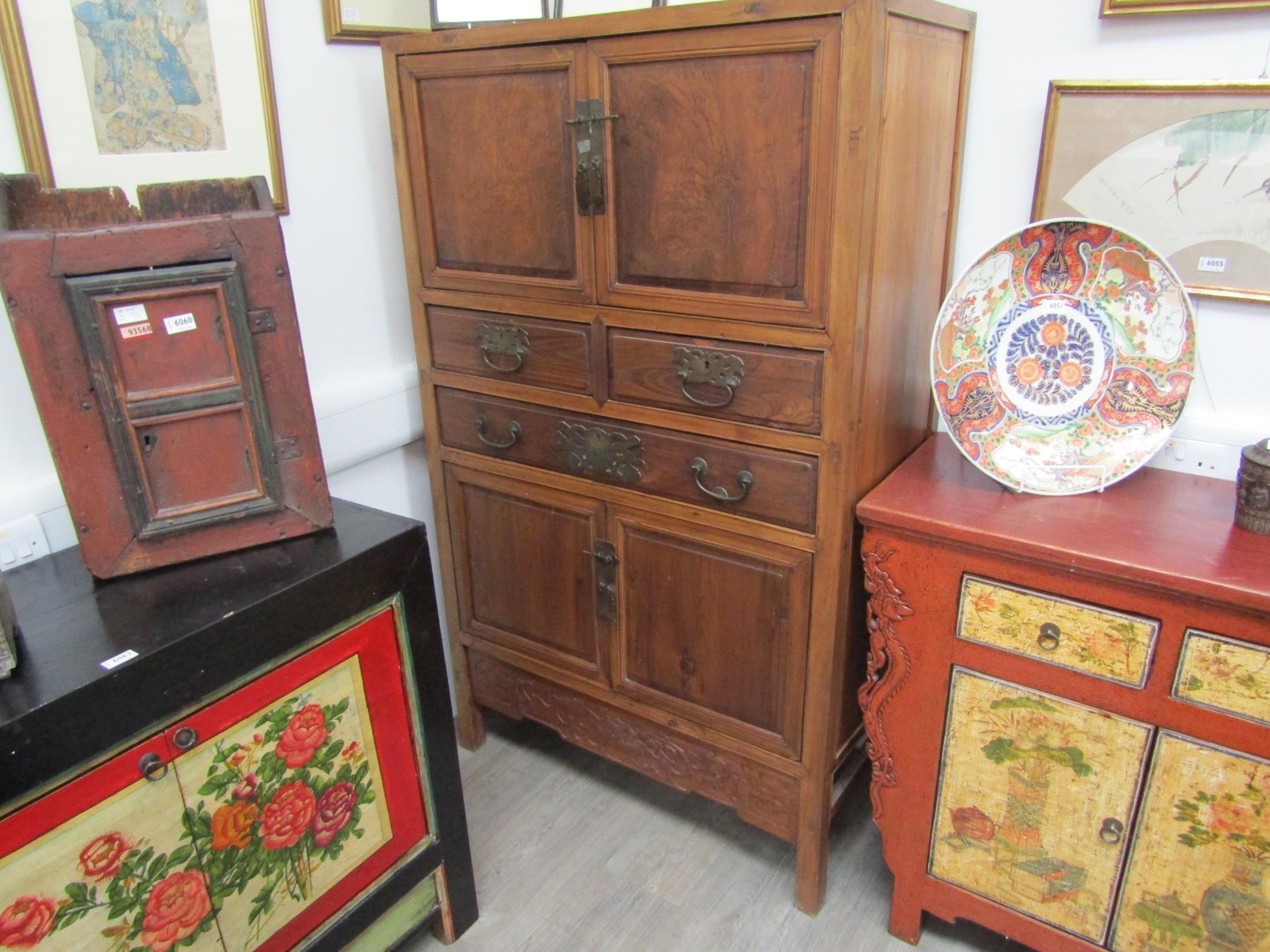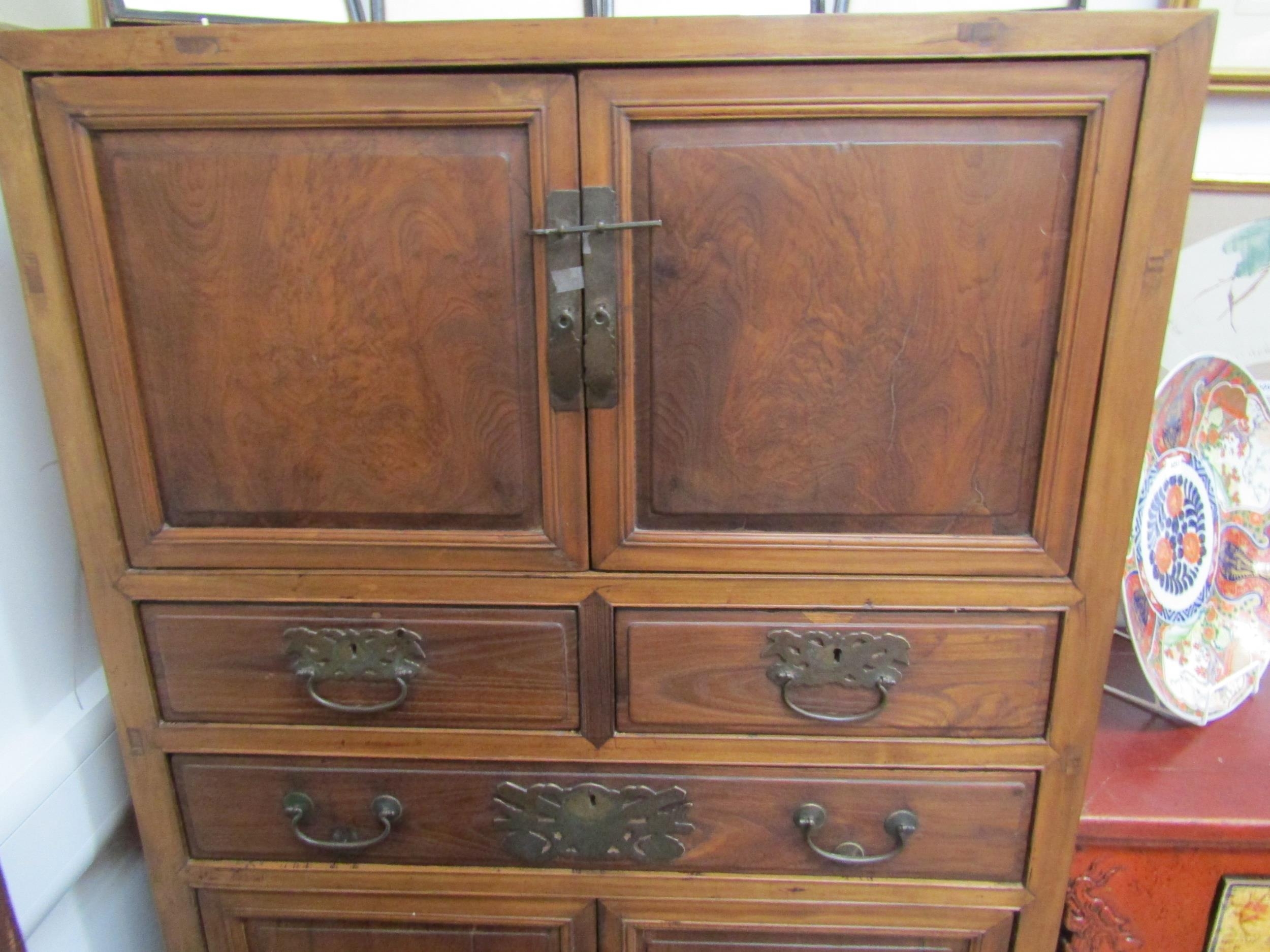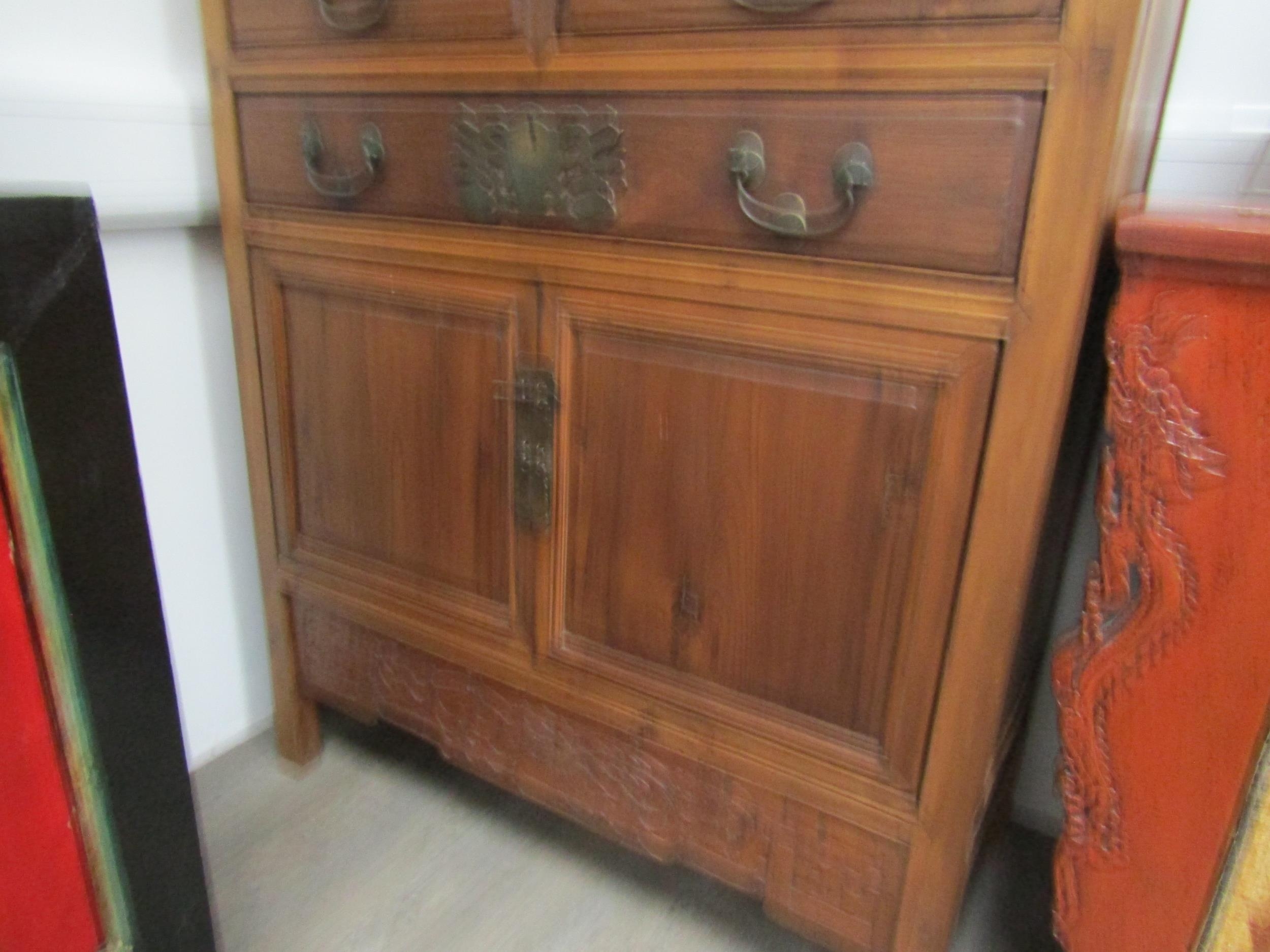 An antique Chinese cupboard with two doors above three drawers over two door base with carved frieze, 168cm x 99.5cm x 49cm (R) £180