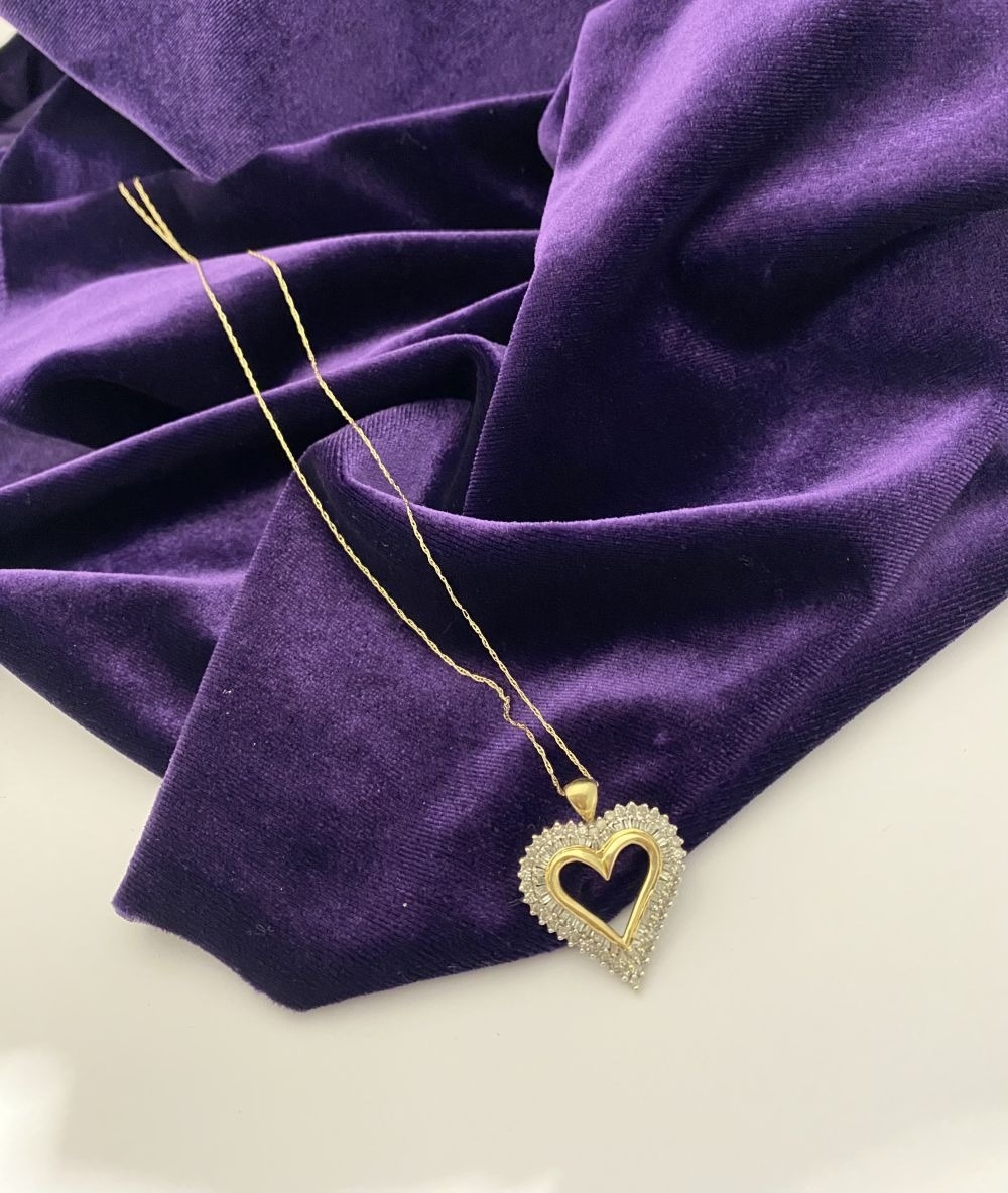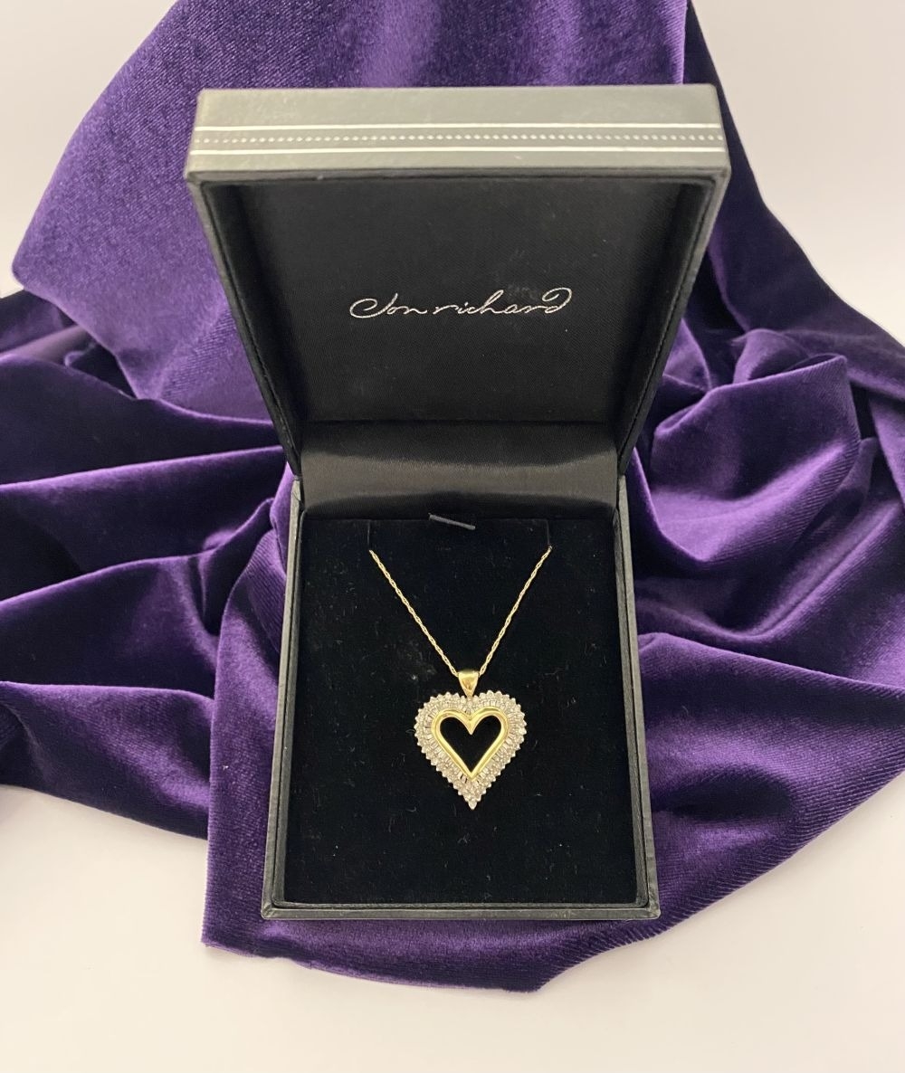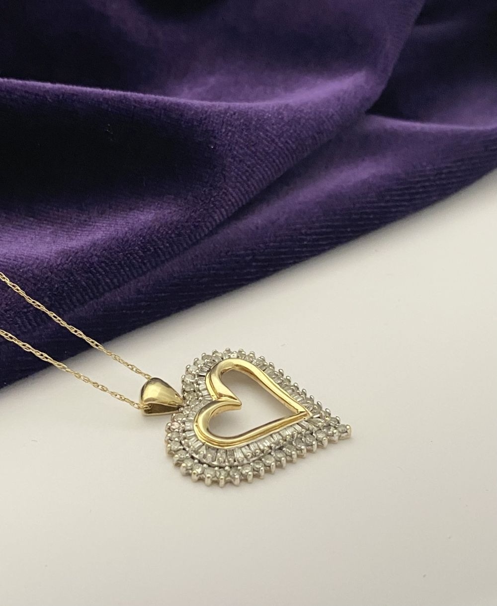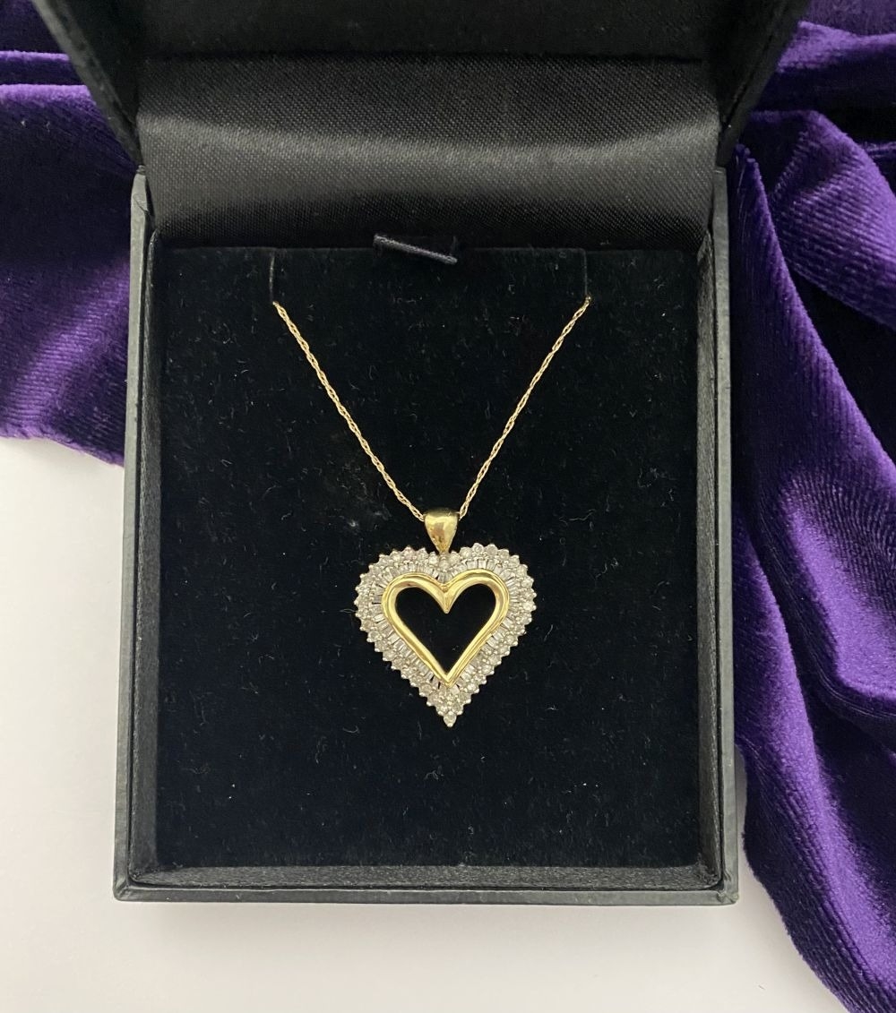 A STUNNING 10CT YELLOW GOLD WHITE SAPPHIRE HEART PENDANT NECKLACE, the heart shaped pendant set with row of baguette cut then row of round cut white sapphires in claw setting, hallmarked 10K with Makers mark to reverse bale. On delicate chain link necklace, hallmarked 10K with Makers mark M in circle to bale. 417 to clasp. Dimensions: chain length: 55.5cm long; pendant: 3cm long x 2.3cm wide approx.