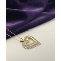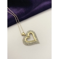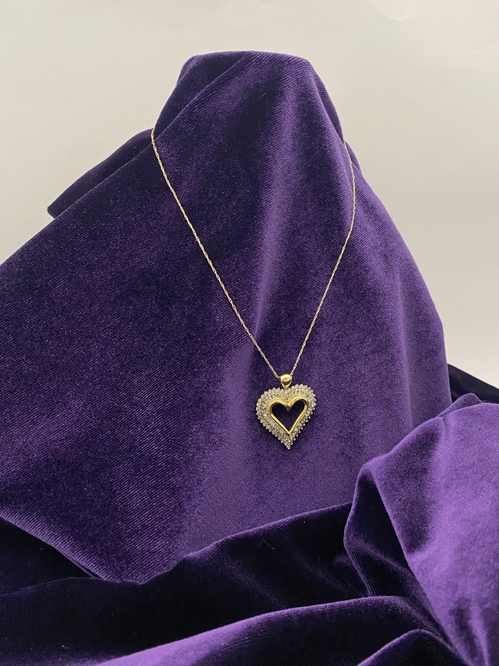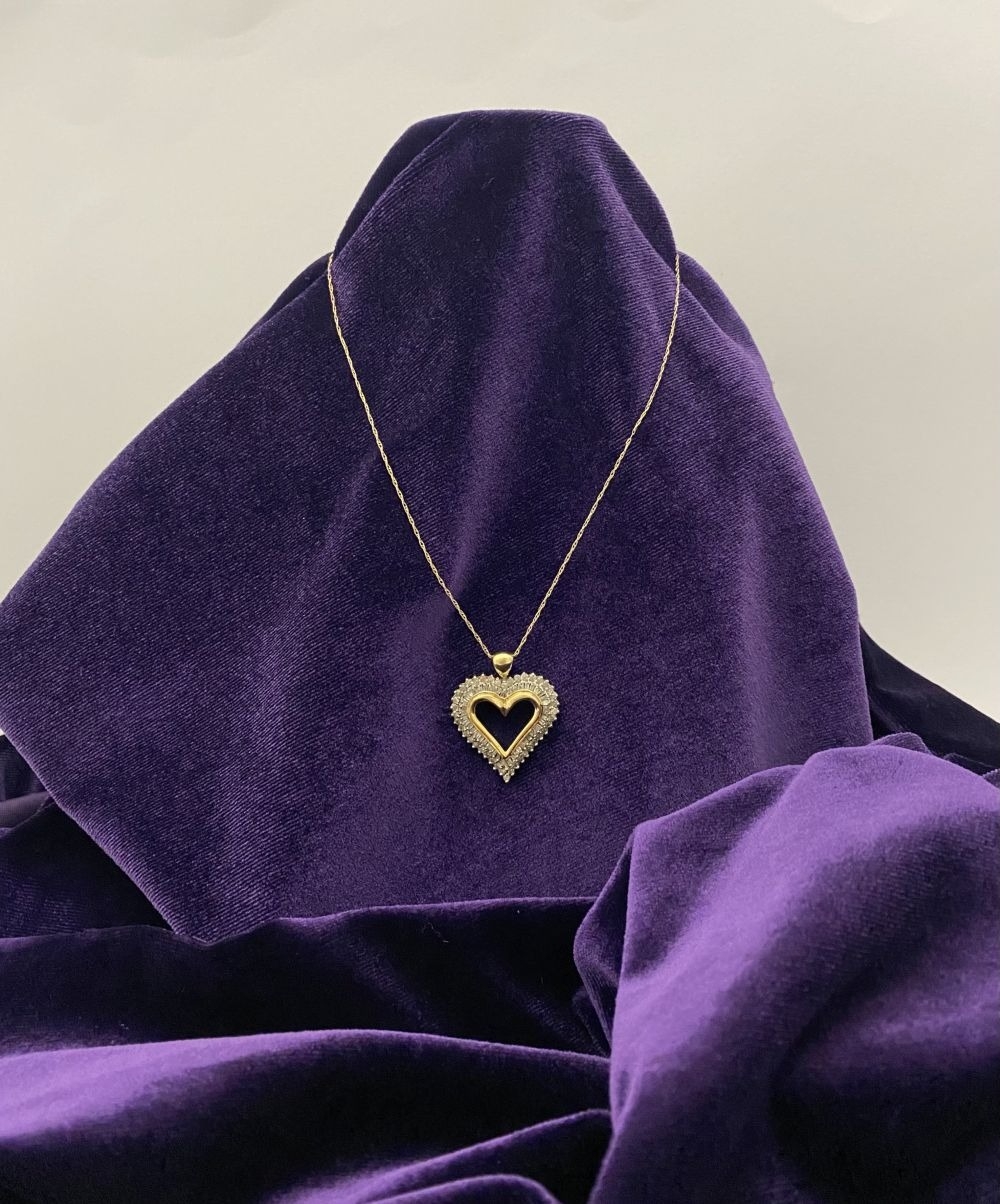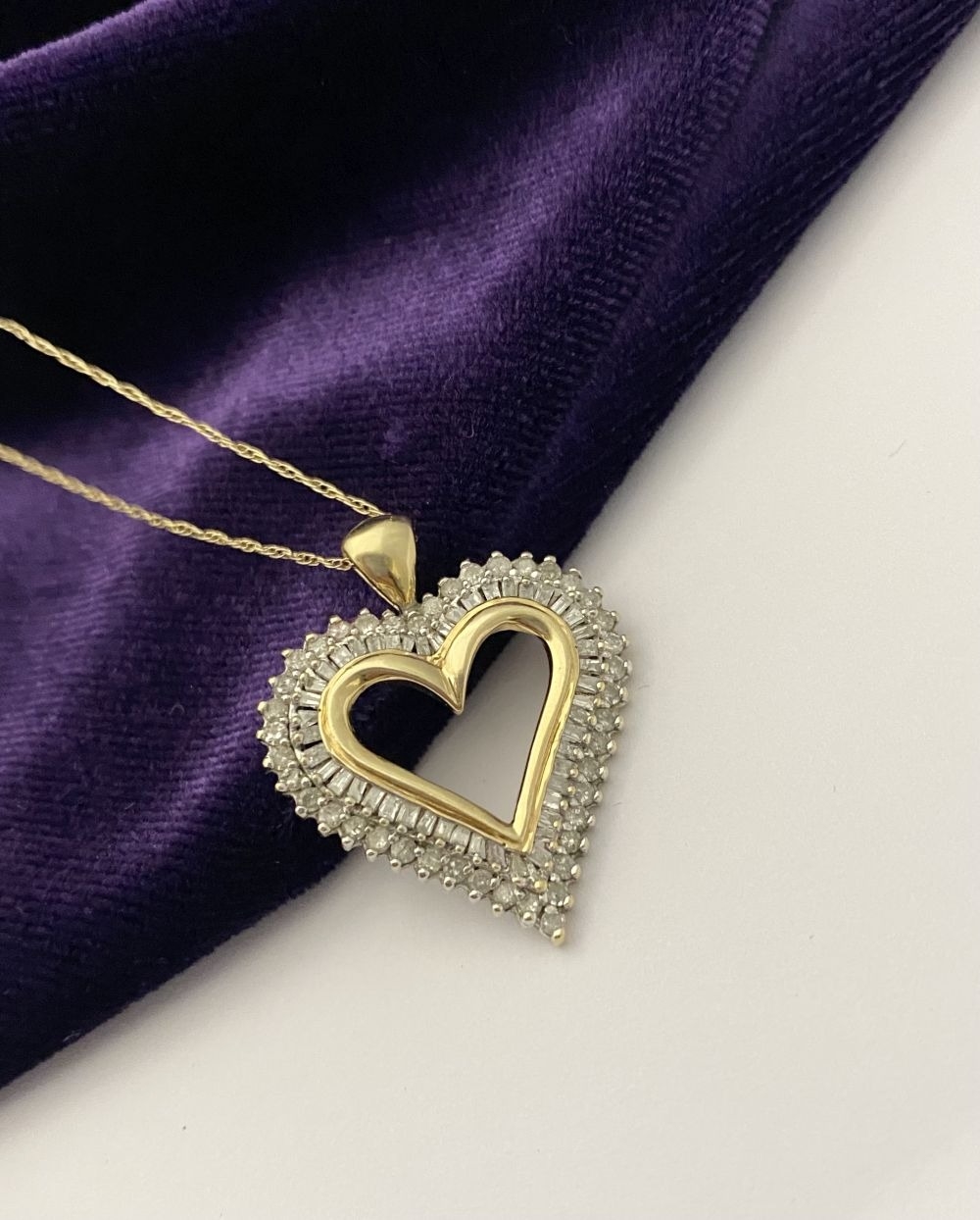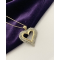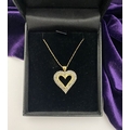 A STUNNING 10CT YELLOW GOLD WHITE SAPPHIRE HEART PENDANT NECKLACE, the heart shaped pendant set with row of baguette cut then row of round cut white sapphires in claw setting, hallmarked 10K with Makers mark to reverse bale. On delicate chain link necklace, hallmarked 10K with Makers mark M in circle to bale. 417 to clasp. Dimensions: chain length: 55.5cm long; pendant: 3cm long x 2.3cm wide approx.