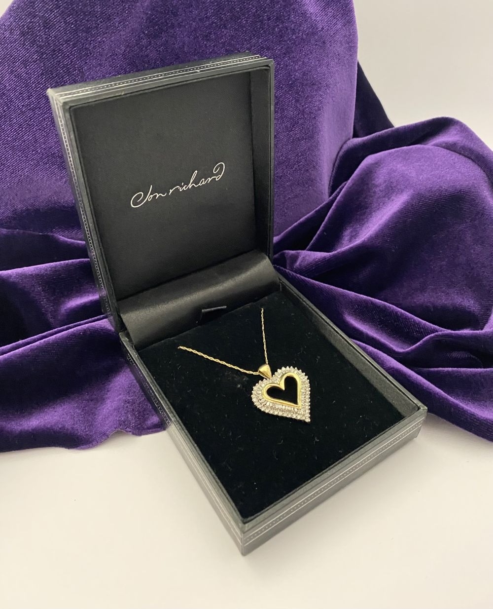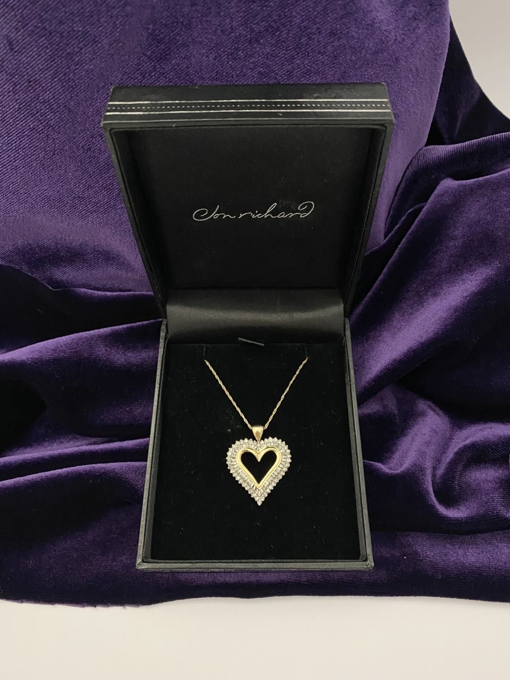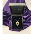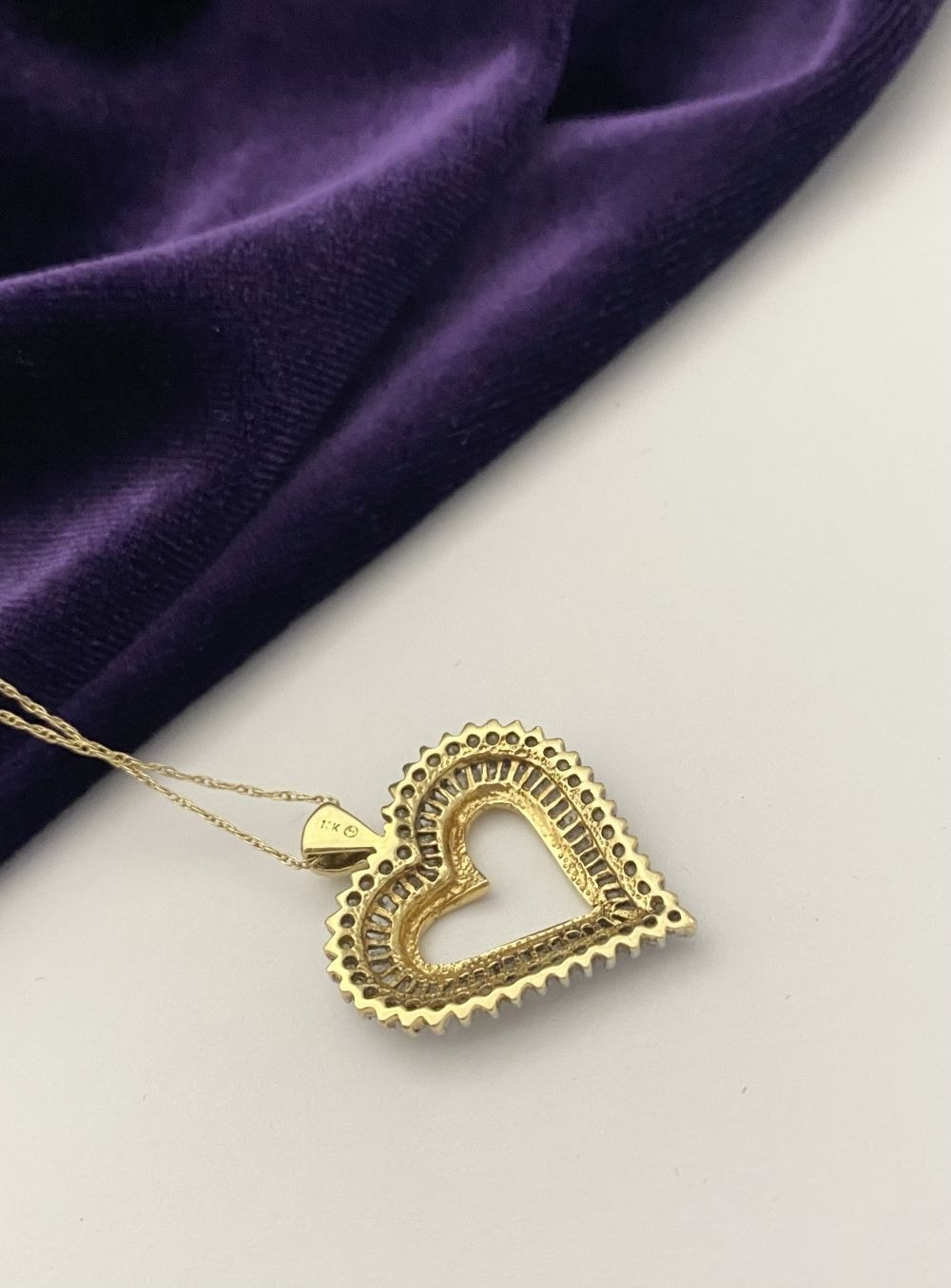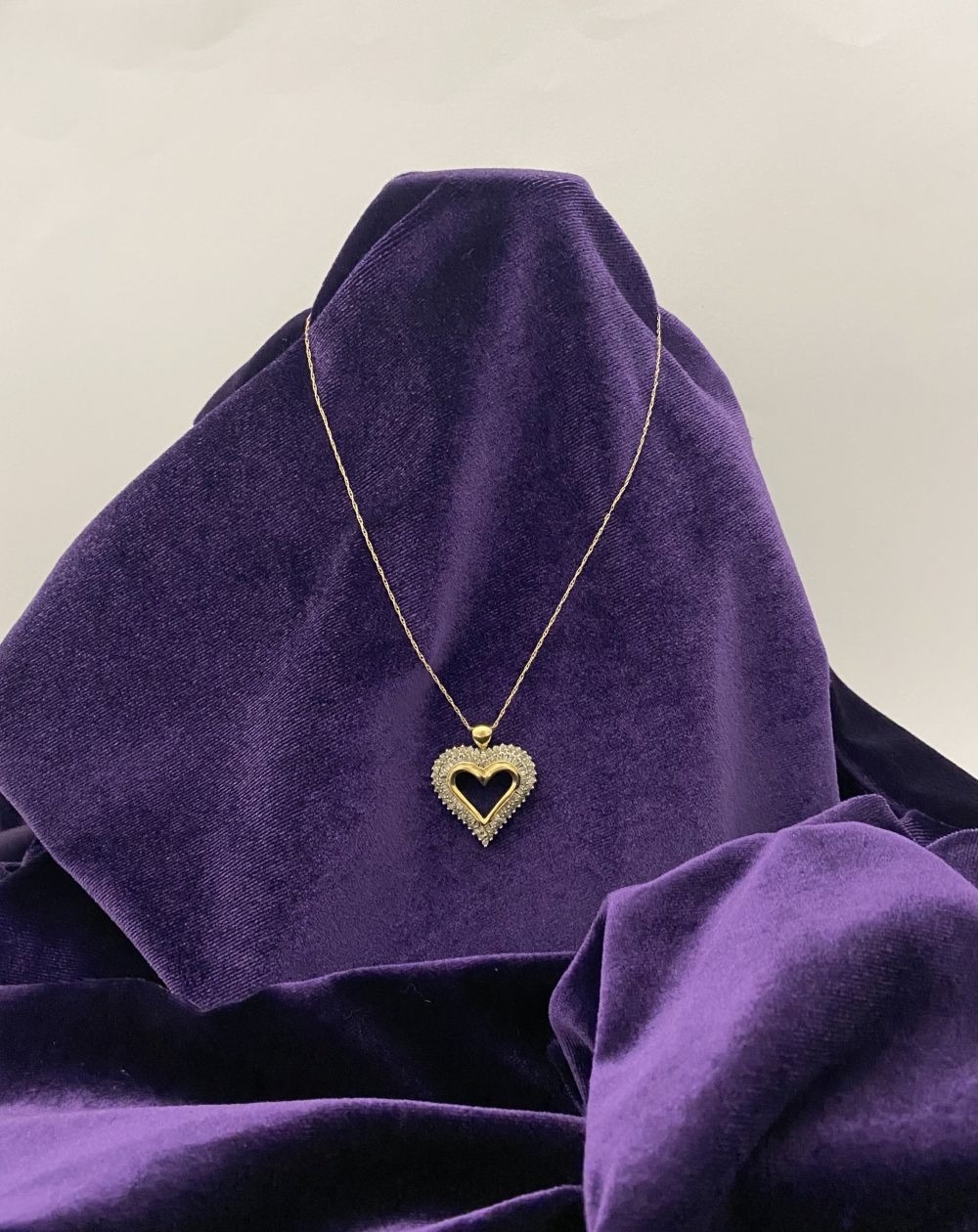 A STUNNING 10CT YELLOW GOLD WHITE SAPPHIRE HEART PENDANT NECKLACE, the heart shaped pendant set with row of baguette cut then row of round cut white sapphires in claw setting, hallmarked 10K with Makers mark to reverse bale. On delicate chain link necklace, hallmarked 10K with Makers mark M in circle to bale. 417 to clasp. Dimensions: chain length: 55.5cm long; pendant: 3cm long x 2.3cm wide approx.