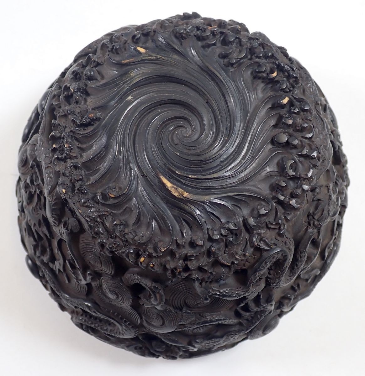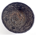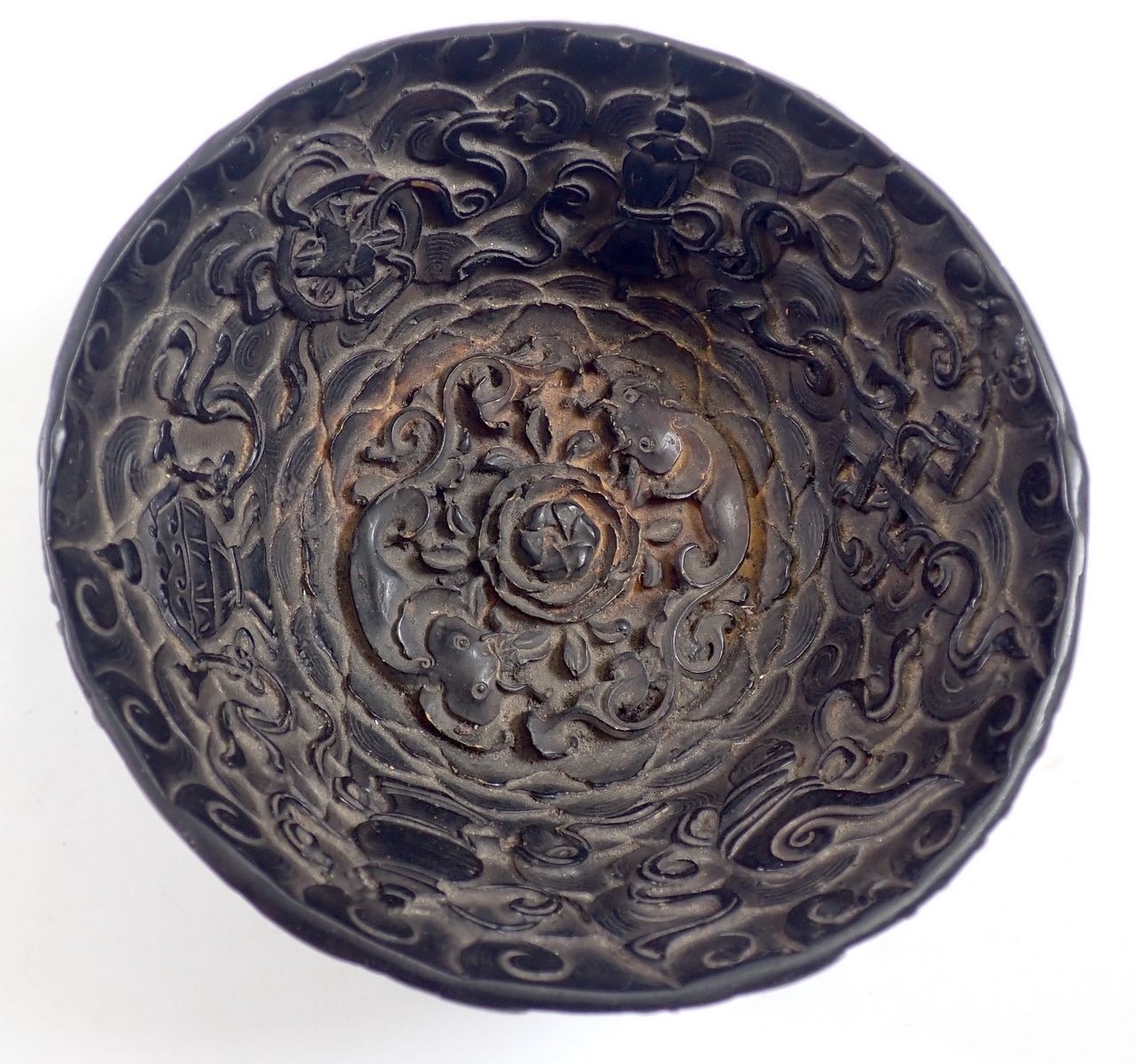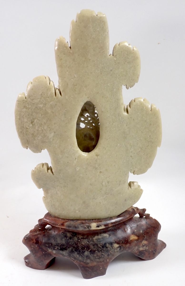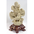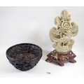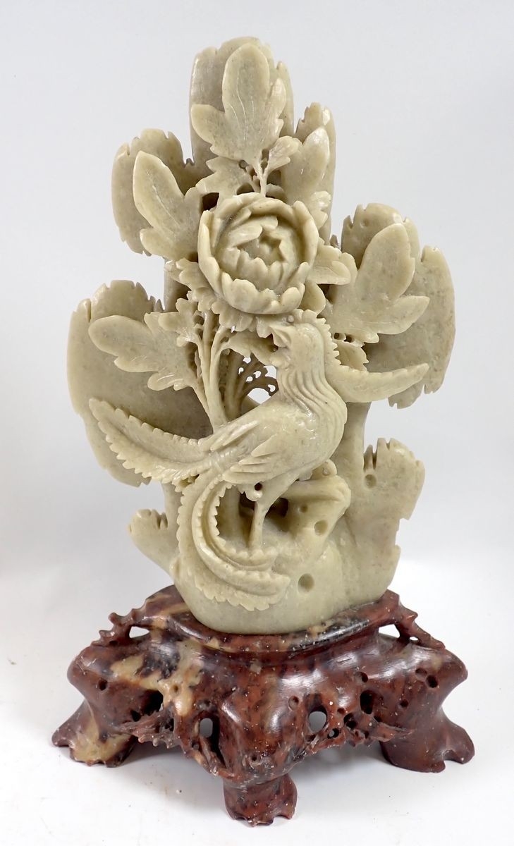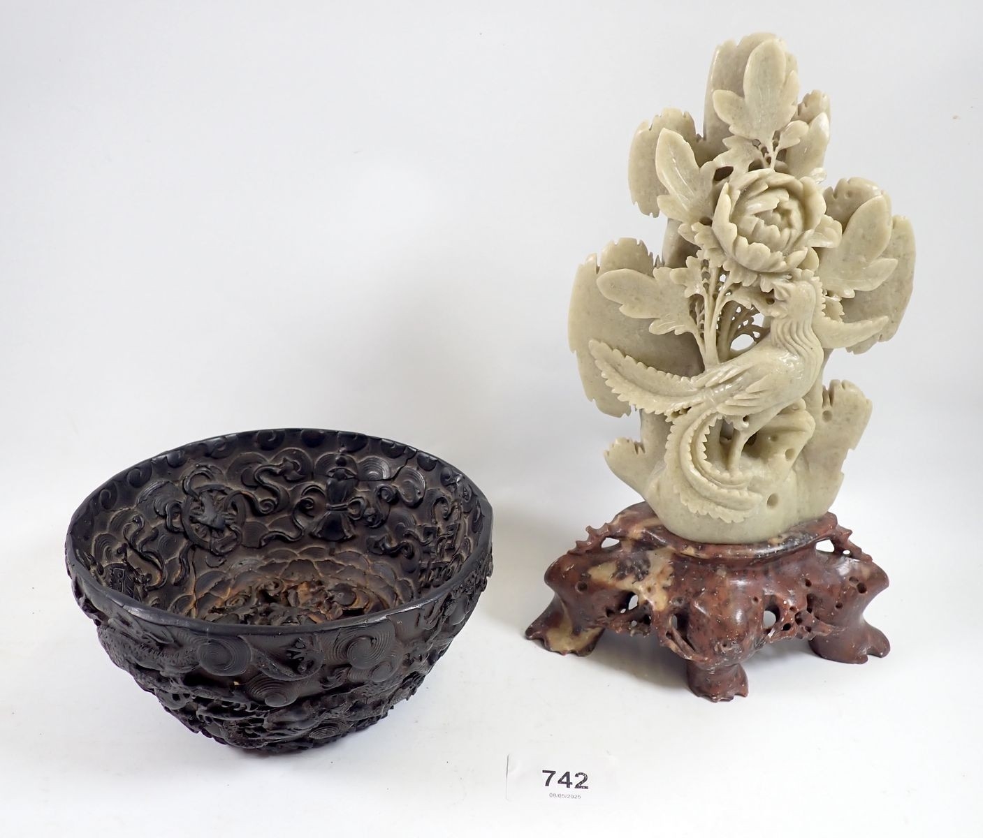 A Chinese soapstone bird and floral group plus a resin dragon and koi bowl, 14cm diameter