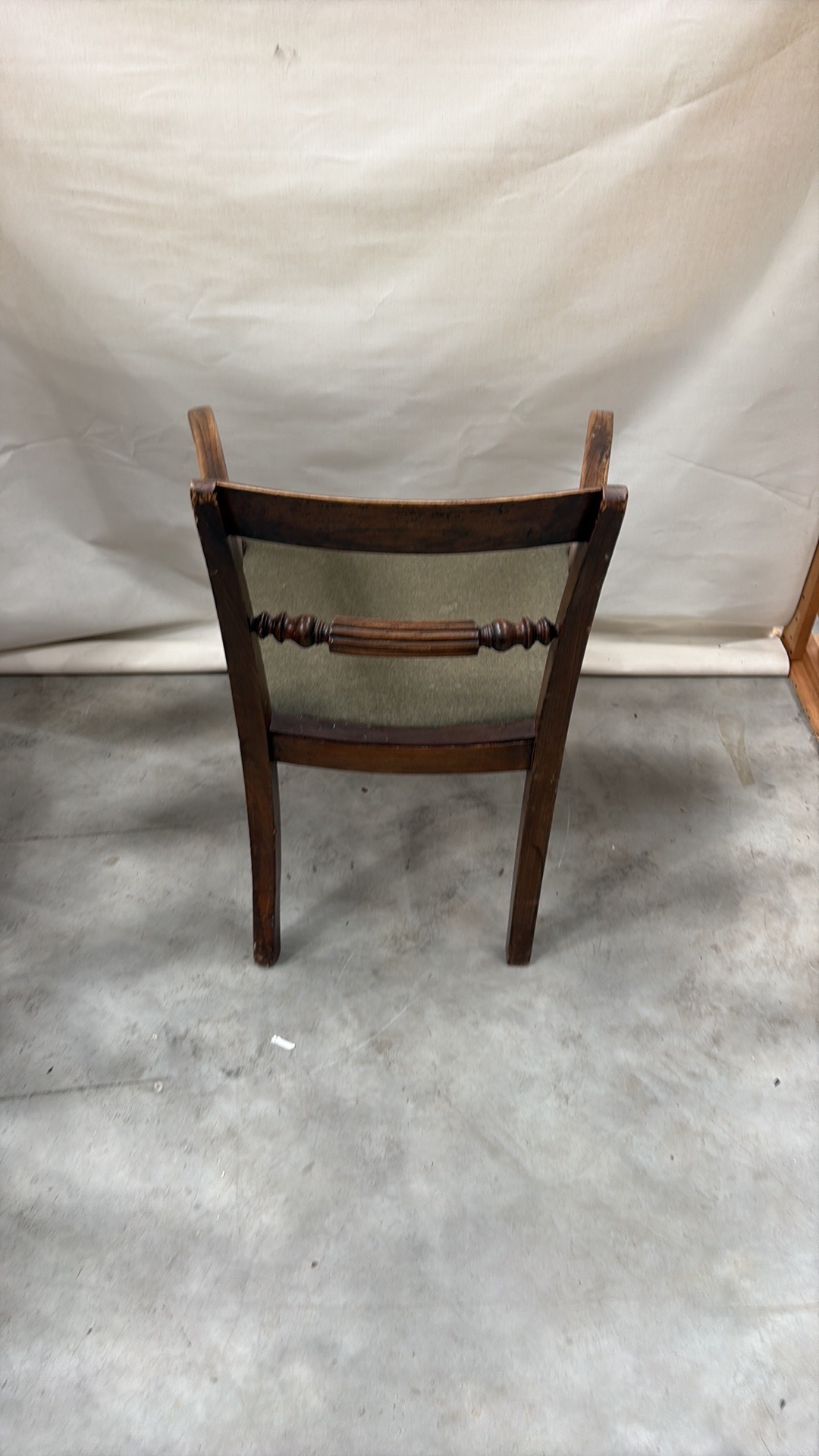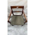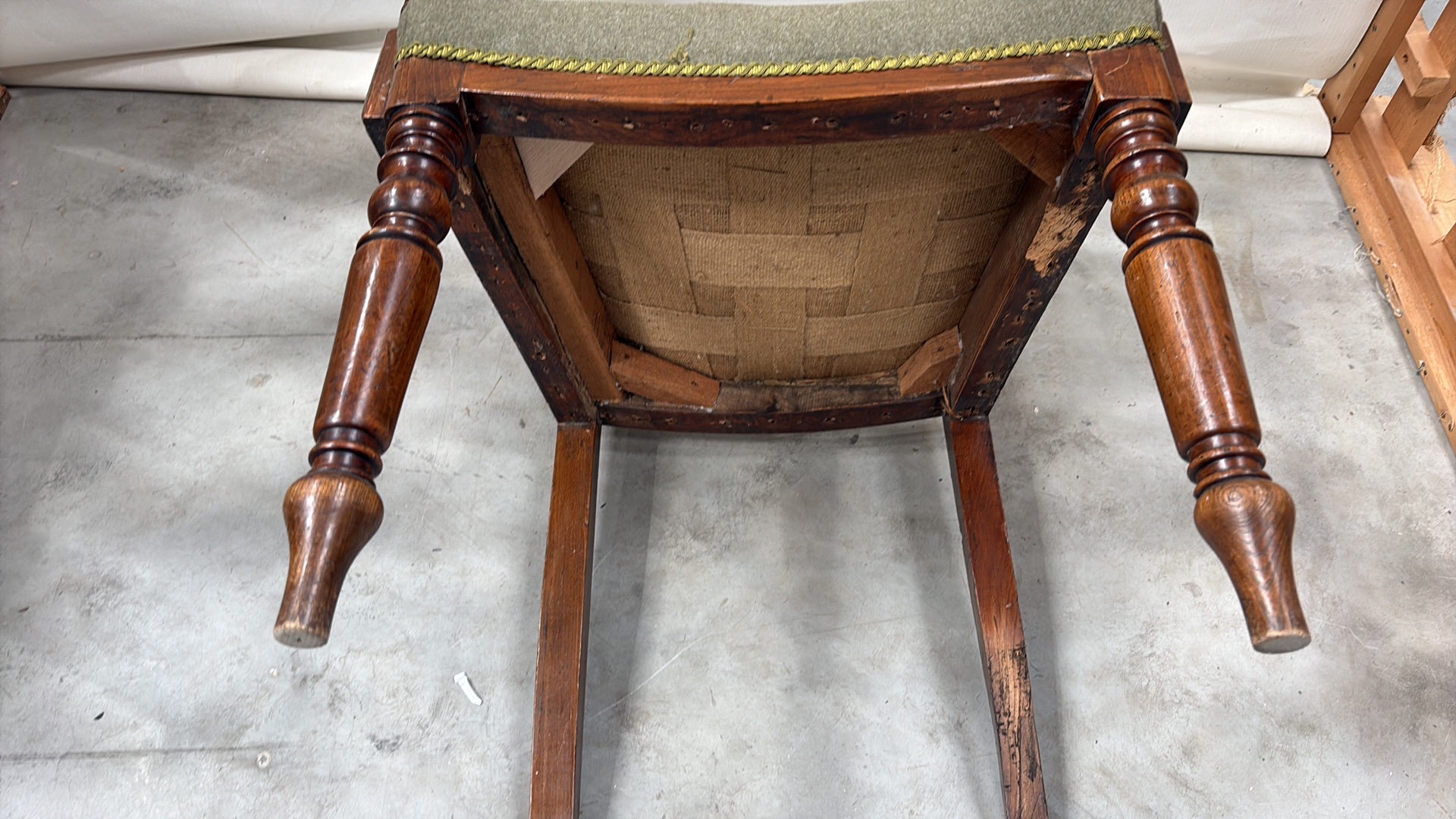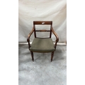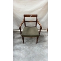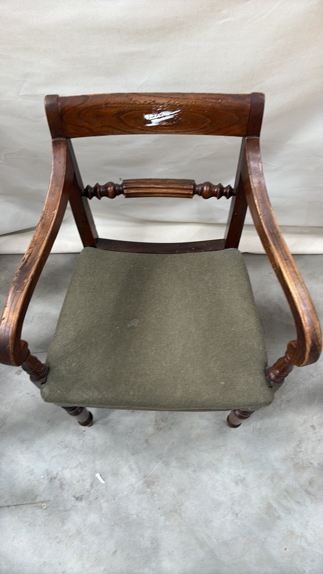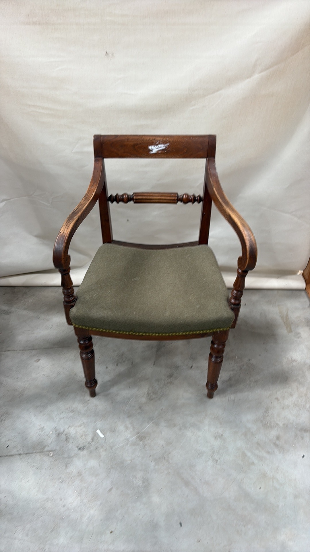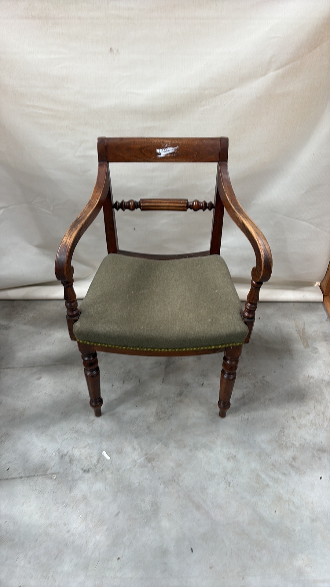Victorian mahogany open armchair with scroll arms, turned spindle back rail, upholstered seat and reeded front legs.