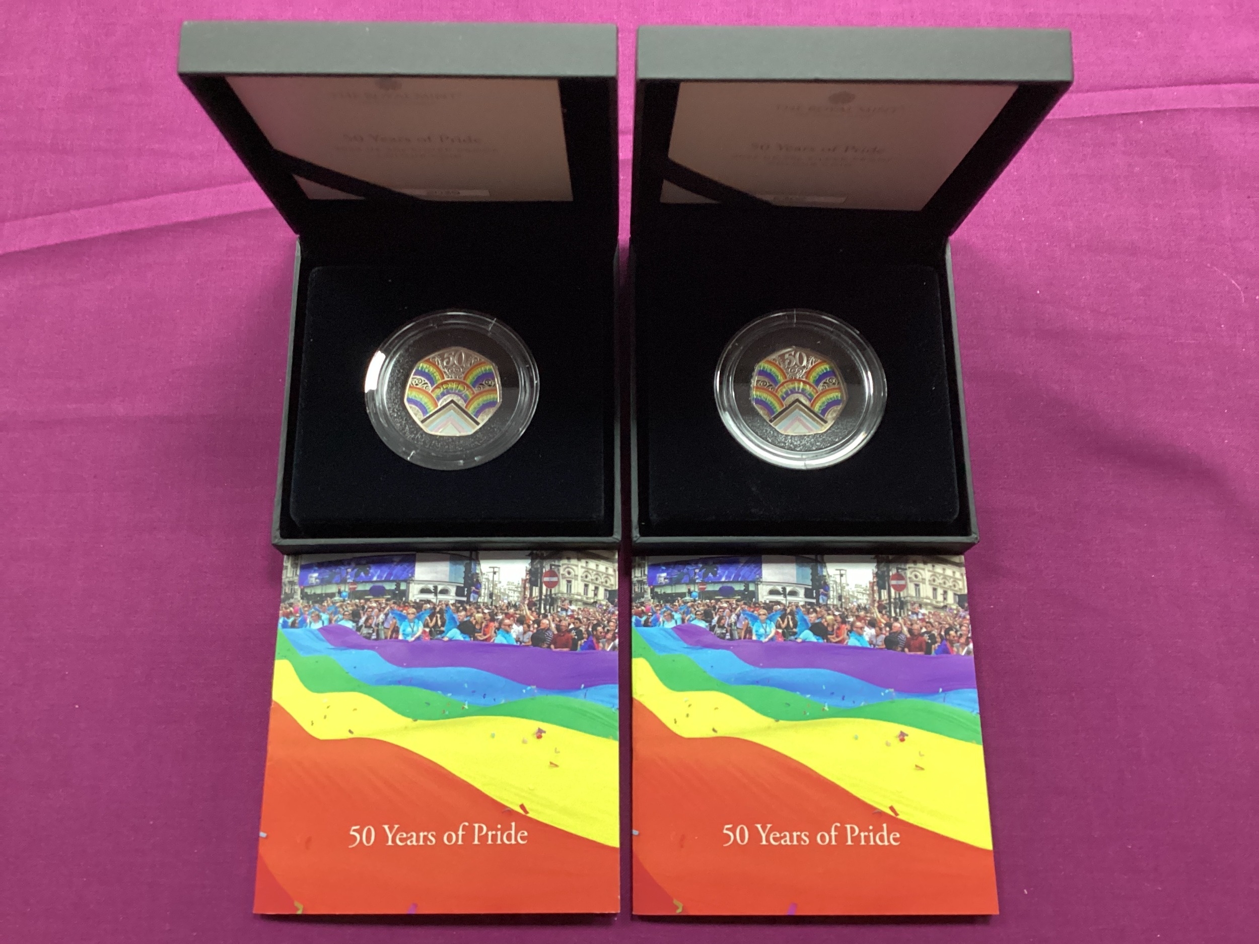 Two Royal Mint 2022 '50 Years Of Pride' Silver Proof 50p Colour Coins, both cased with certificates of authenticity.