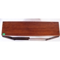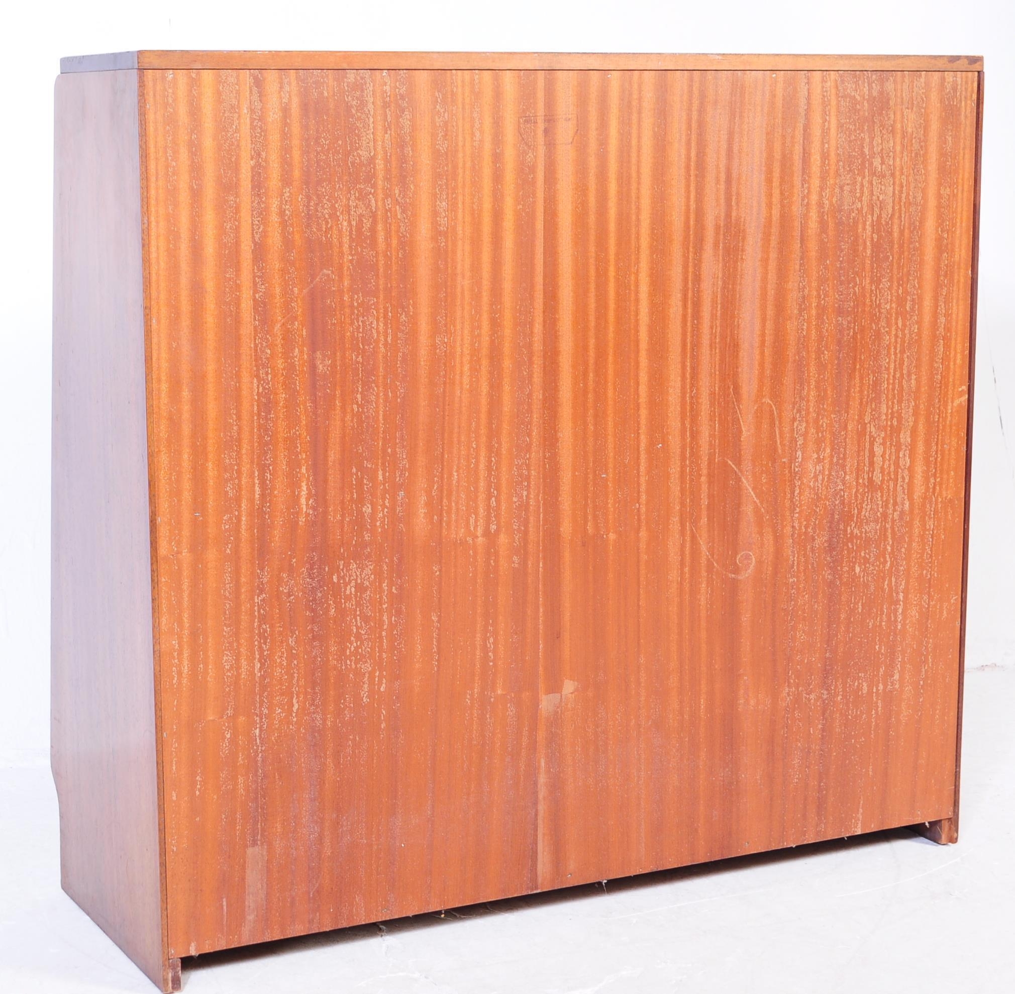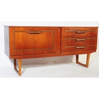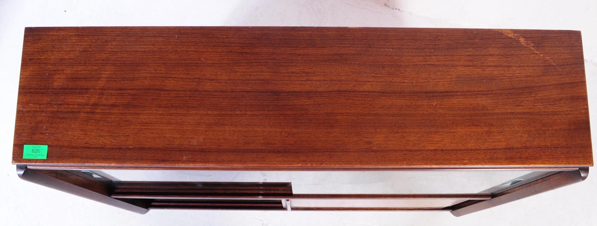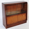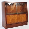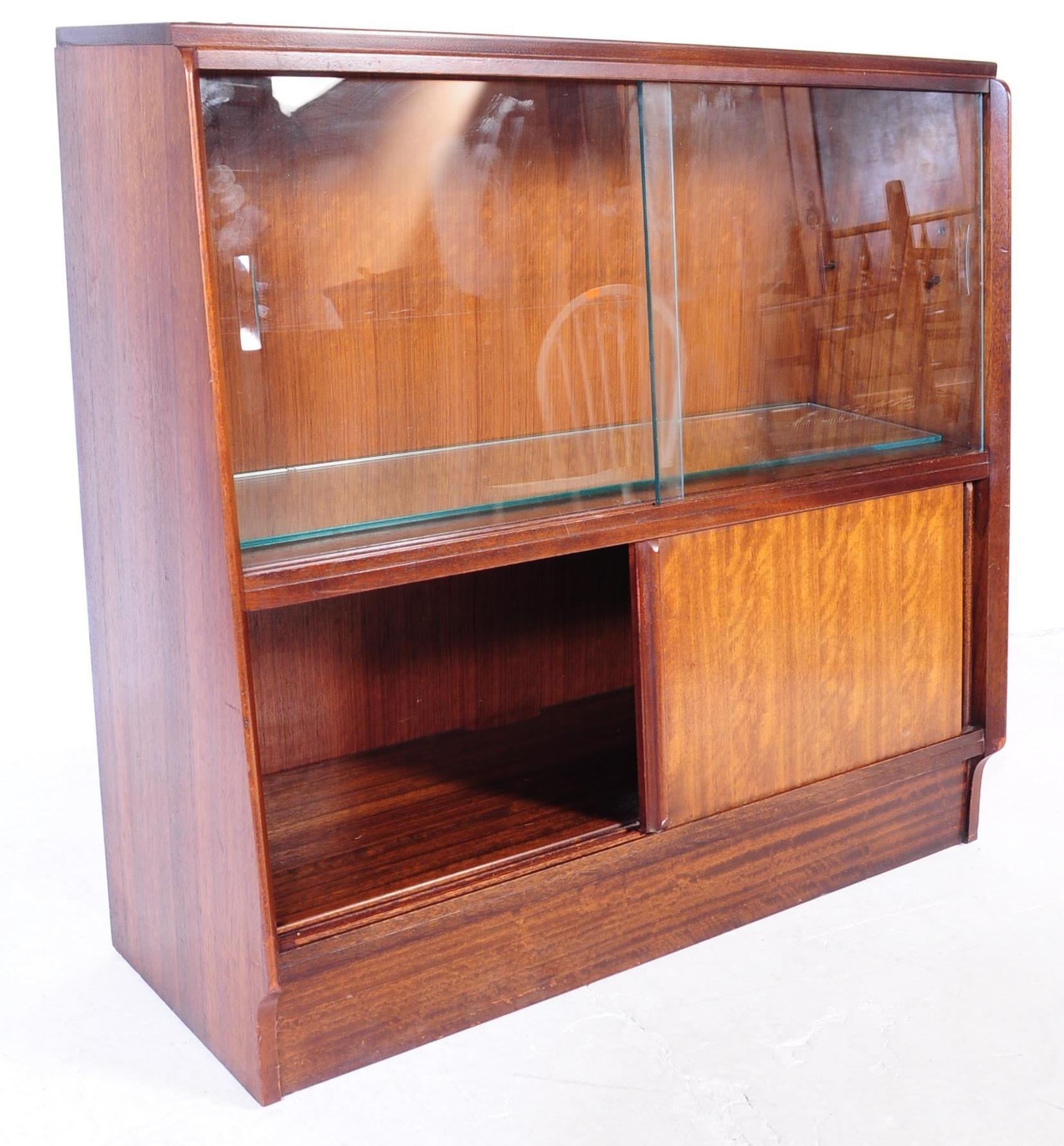 G Plan - Brandon Range - A mid 20th century circa 1950s teak G-Plan Brandon range waterfall display cabinet bookcase. The display cabinet having twin glazed sliding doors to top over a cabinet beneath, raised over plinth base. Measures approx. 85x91x22cm