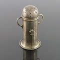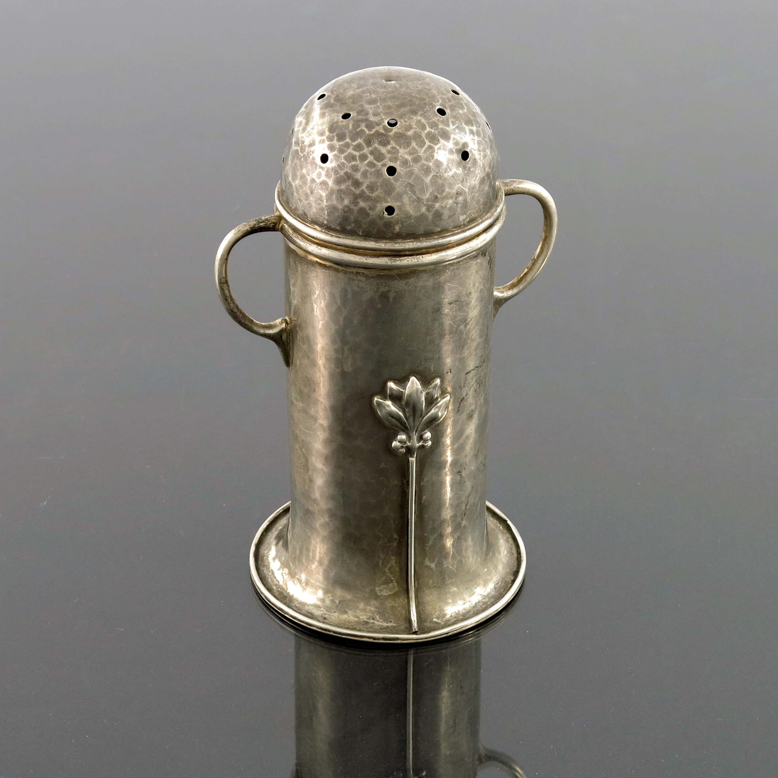 A E Jones, an Arts and Crafts silver shaker, Birmingham 1912, planished domed cylindrical form on played base, applied with stylised tree stalks, twin loop handles, 12cm high, 3.06ozt