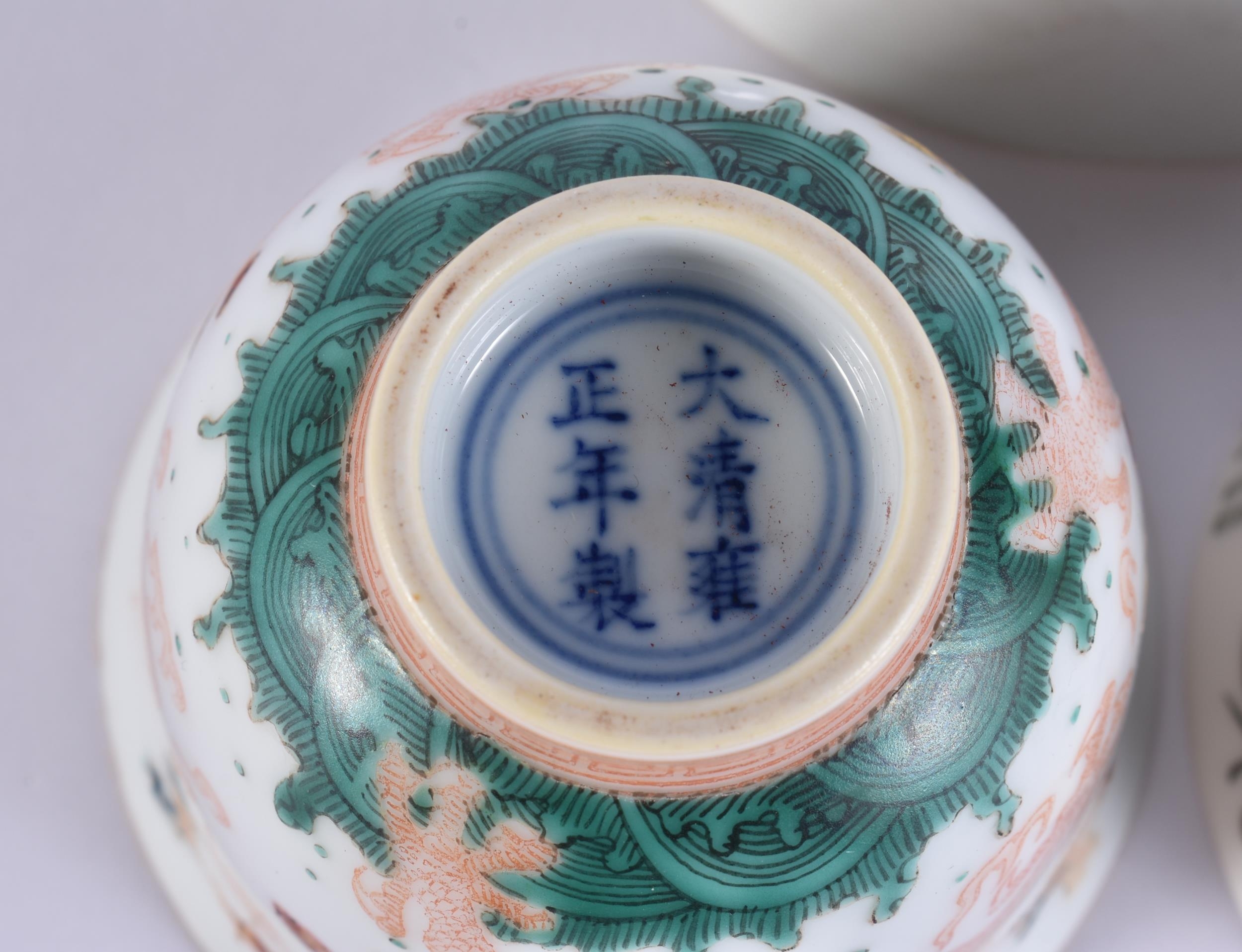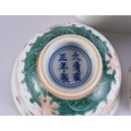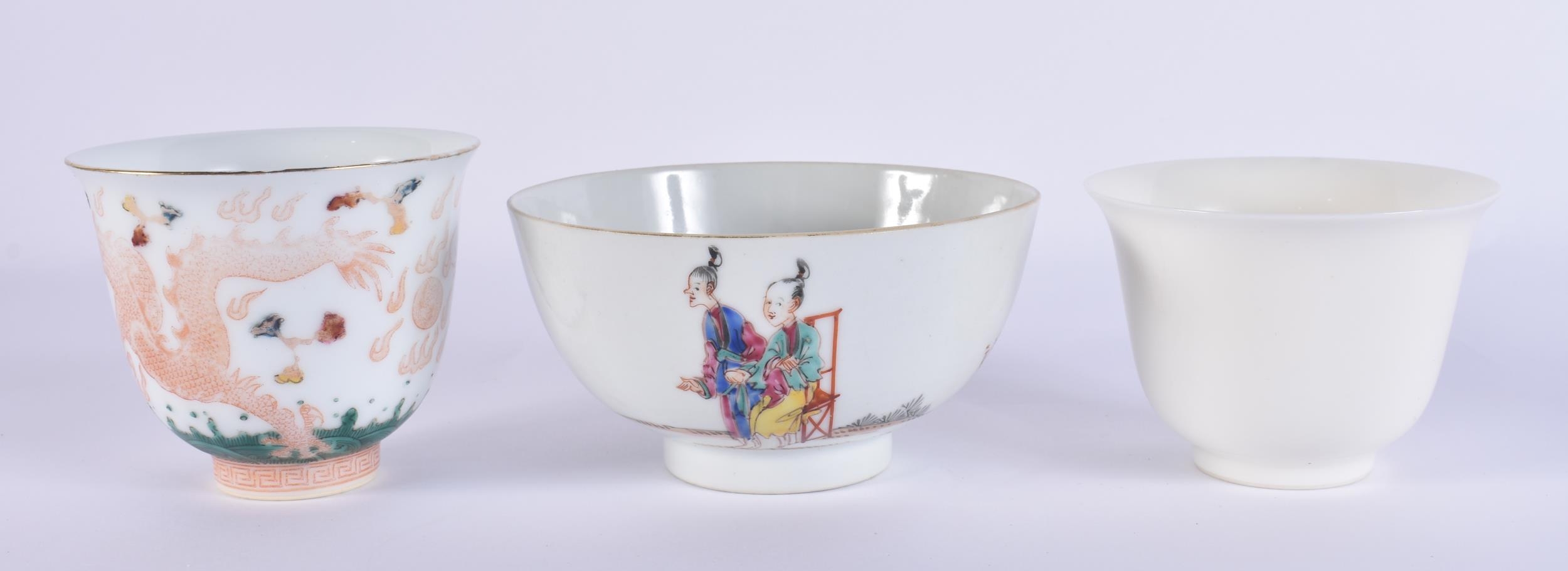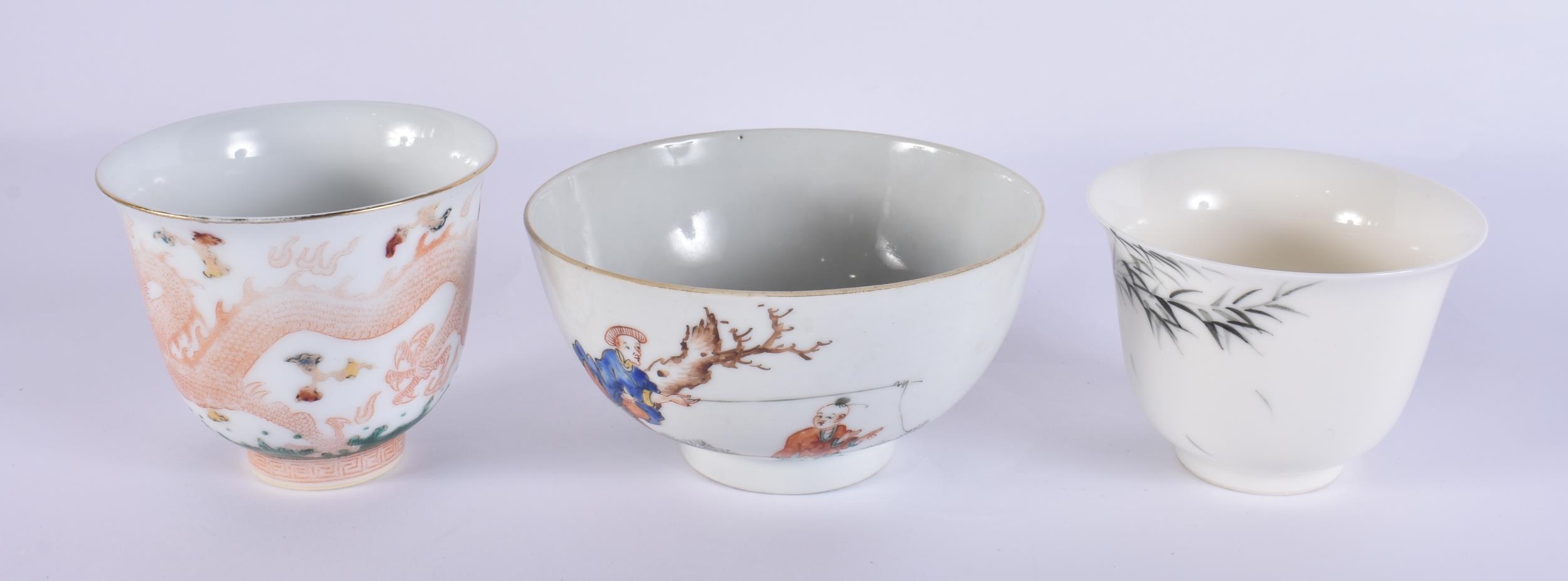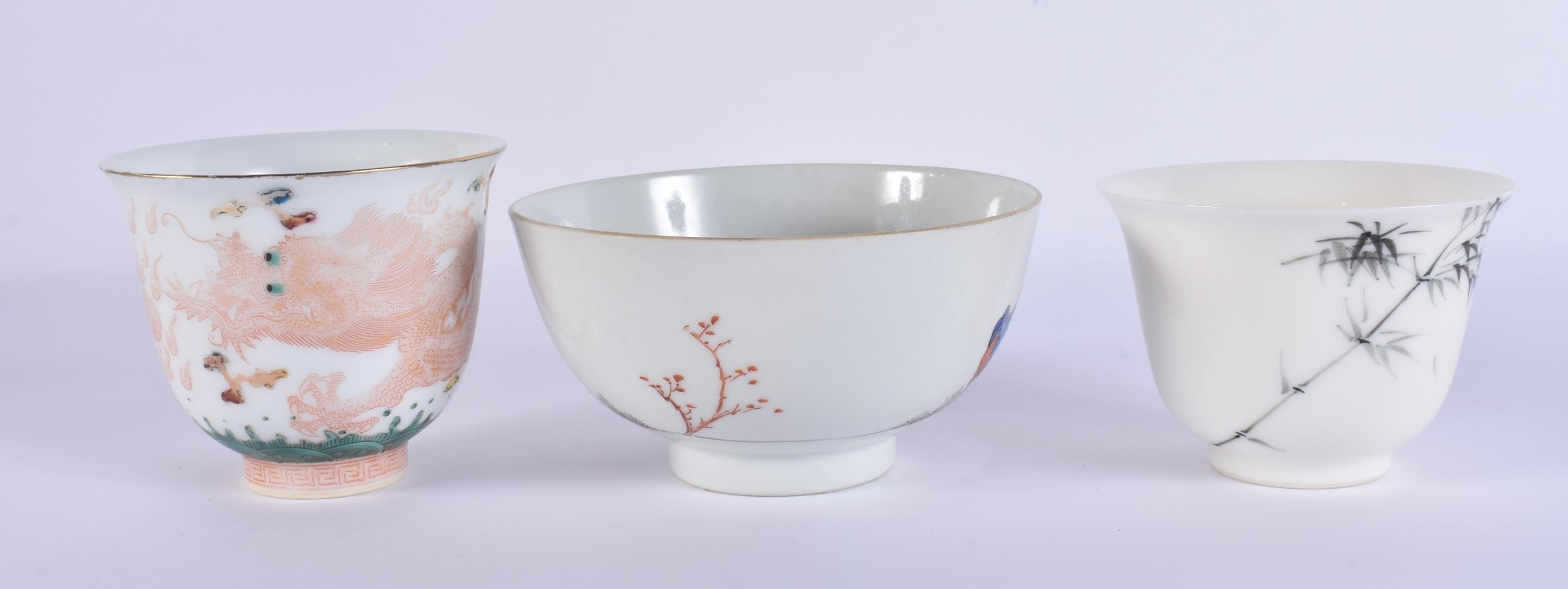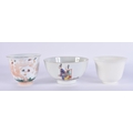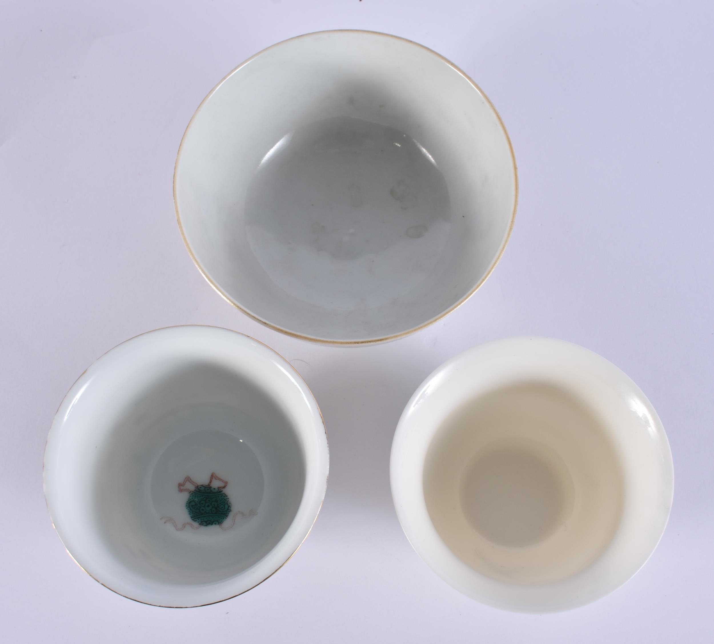 AN 18TH CENTURY CHINESE EXPORT FAMILLE ROSE PORCELAIN BOWL Qianlong, together with two teabowls. Largest 11 cm diameter. (3)