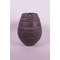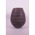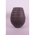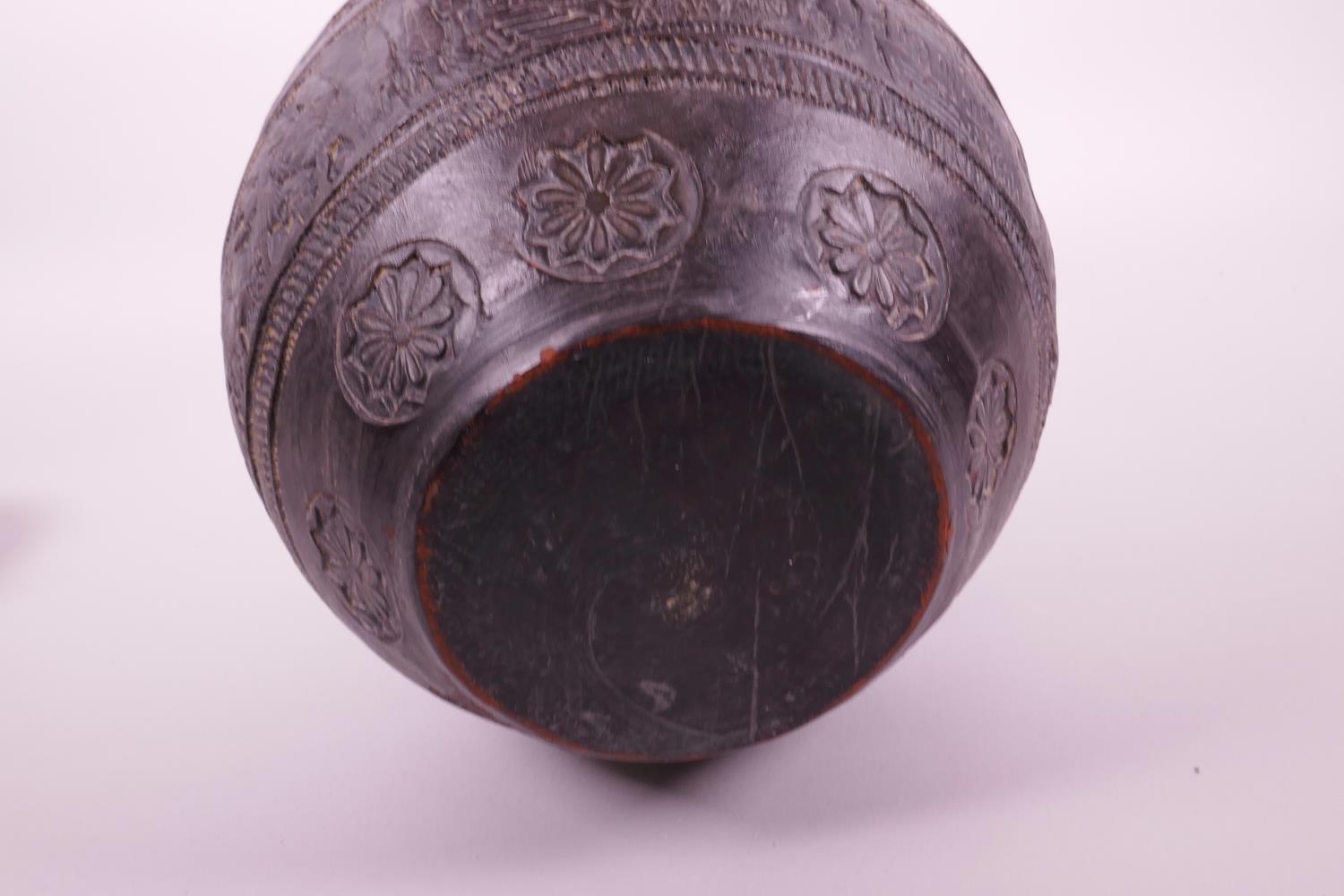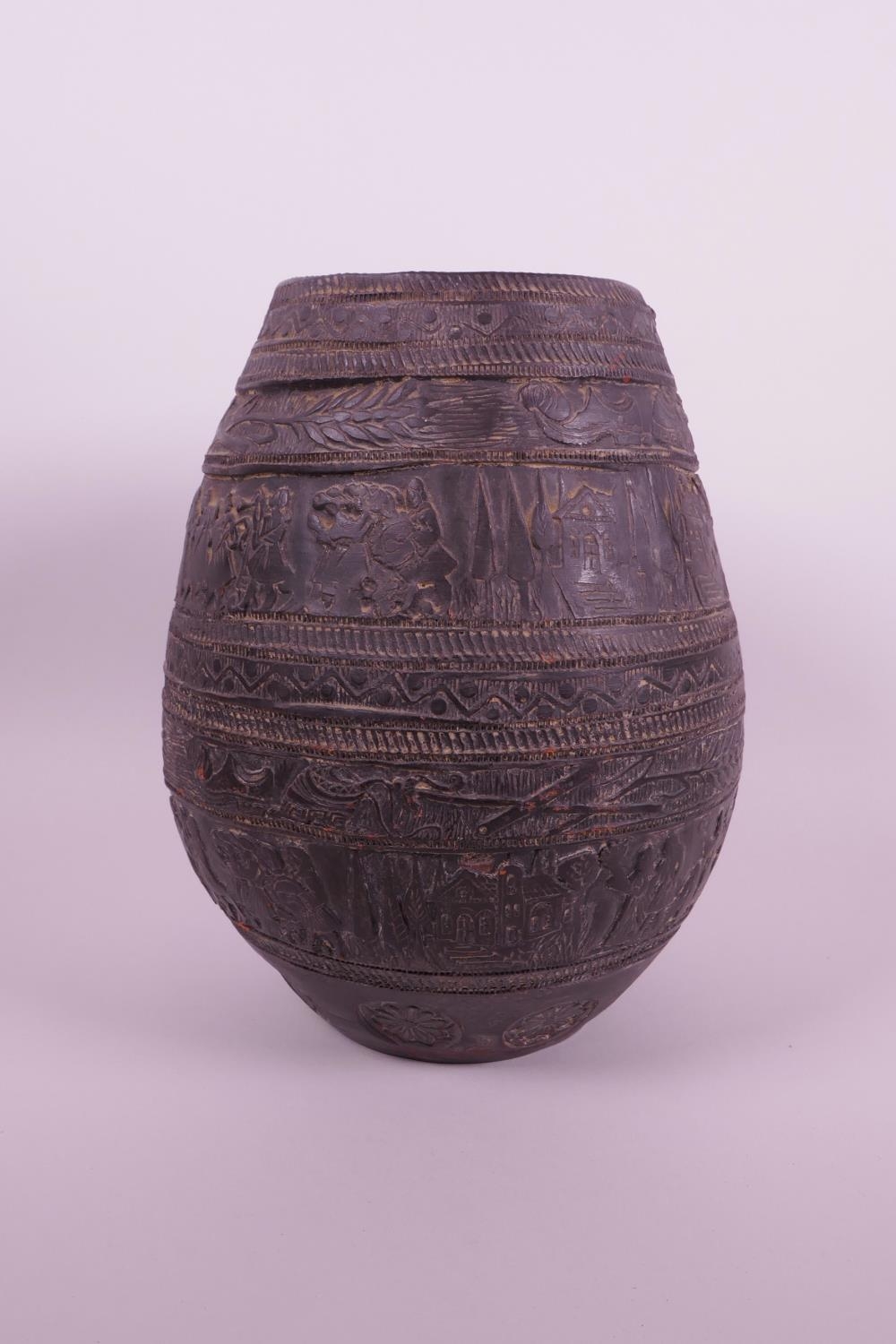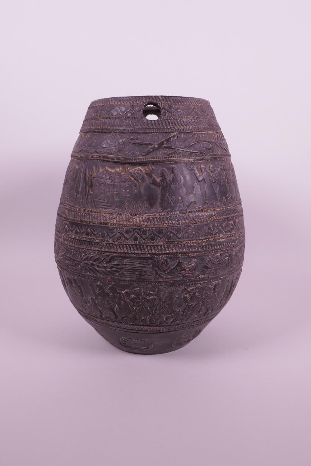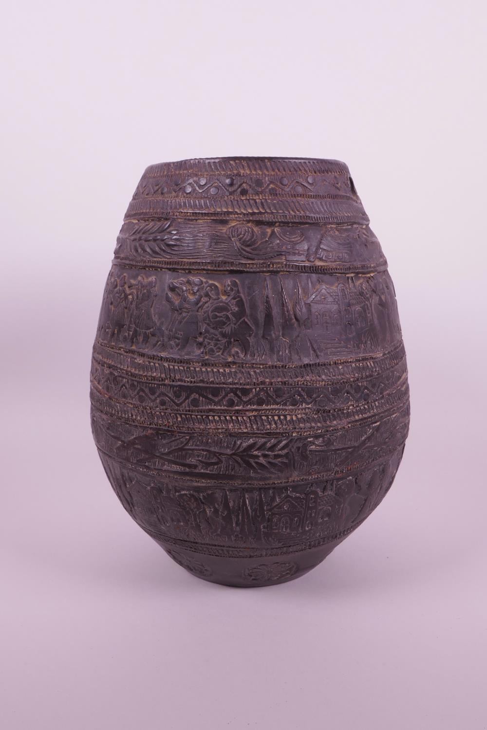 A Continental black glazed terracotta jar with raised decoration of a wedding procession, 8½" high
