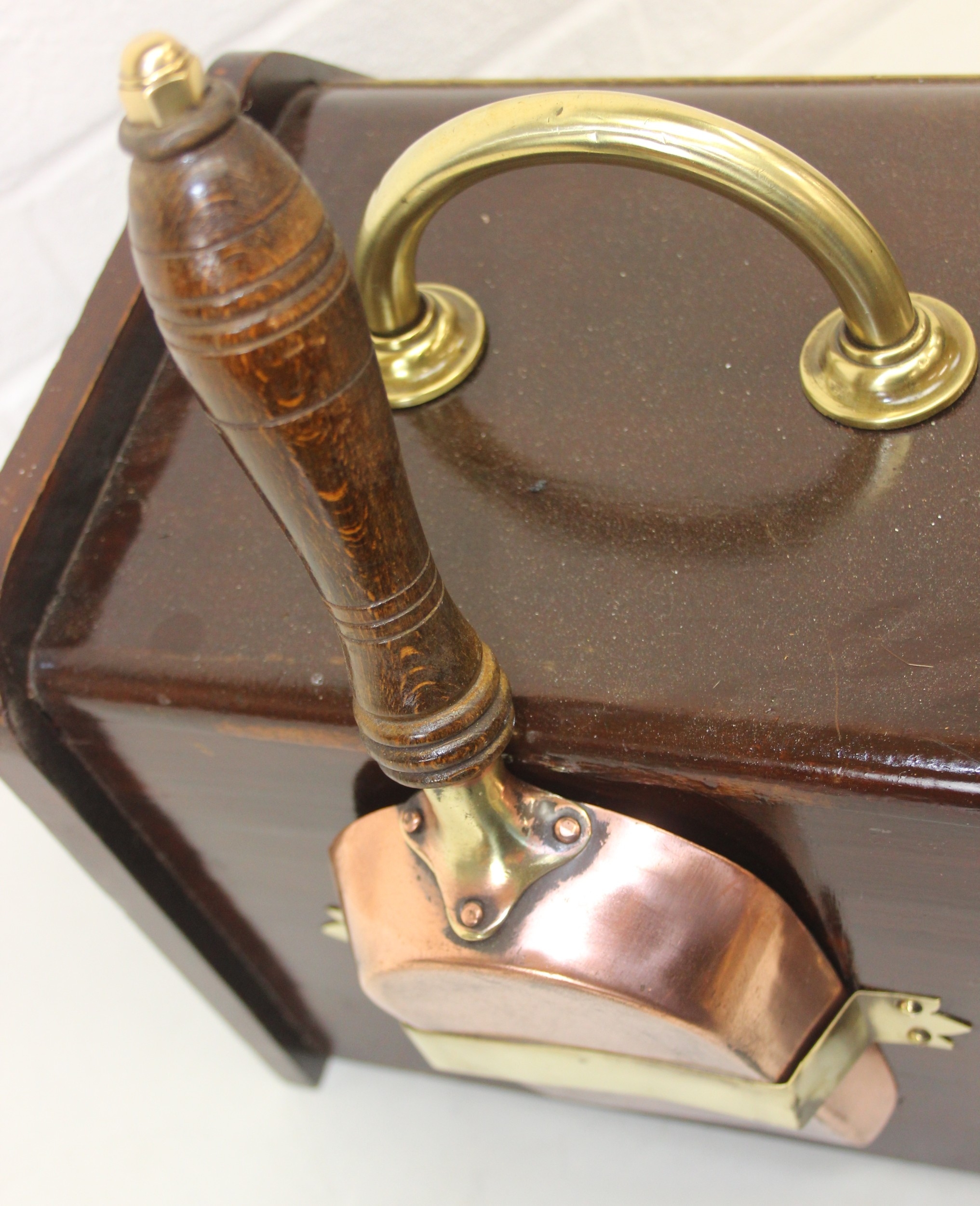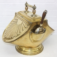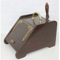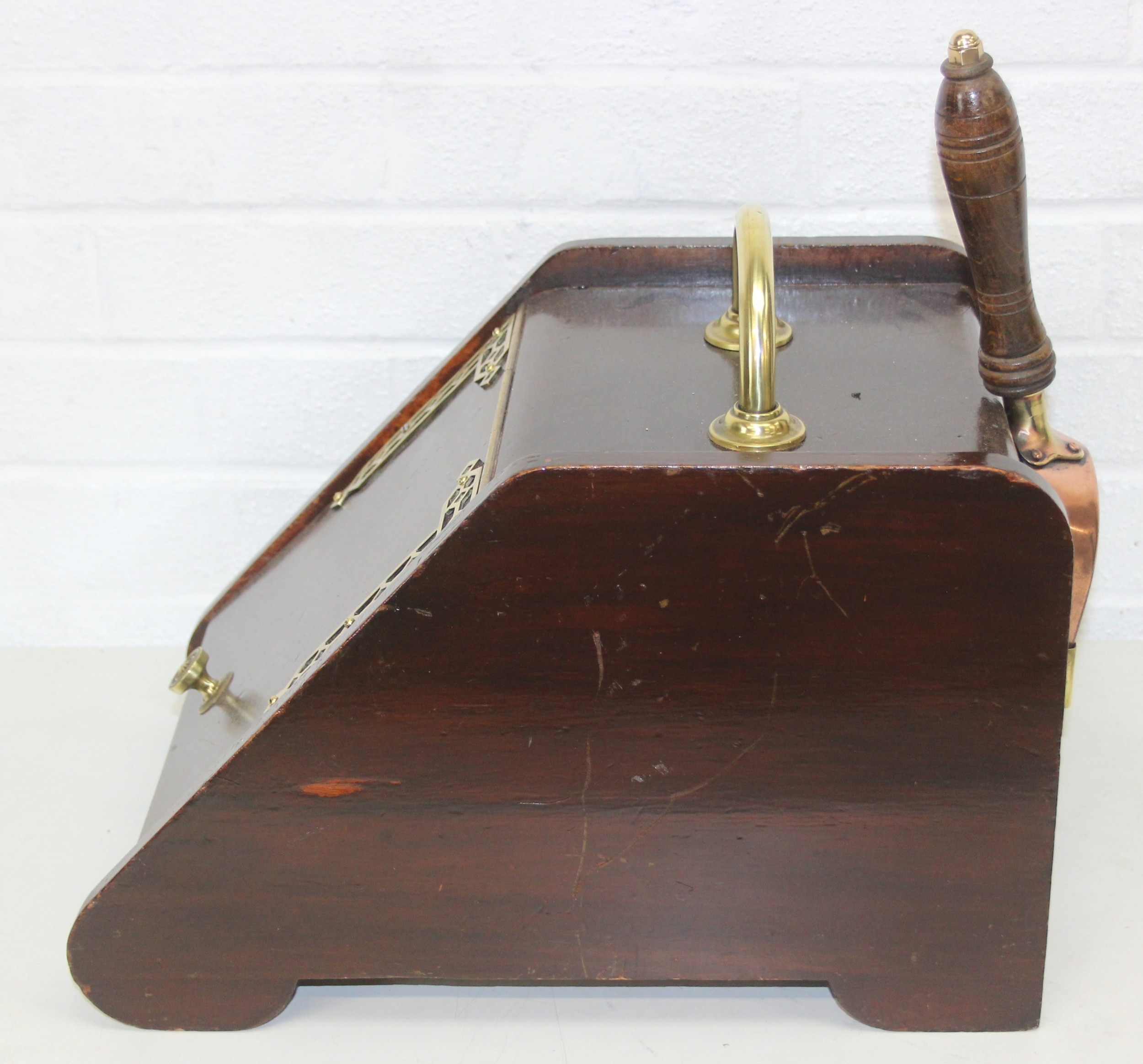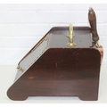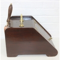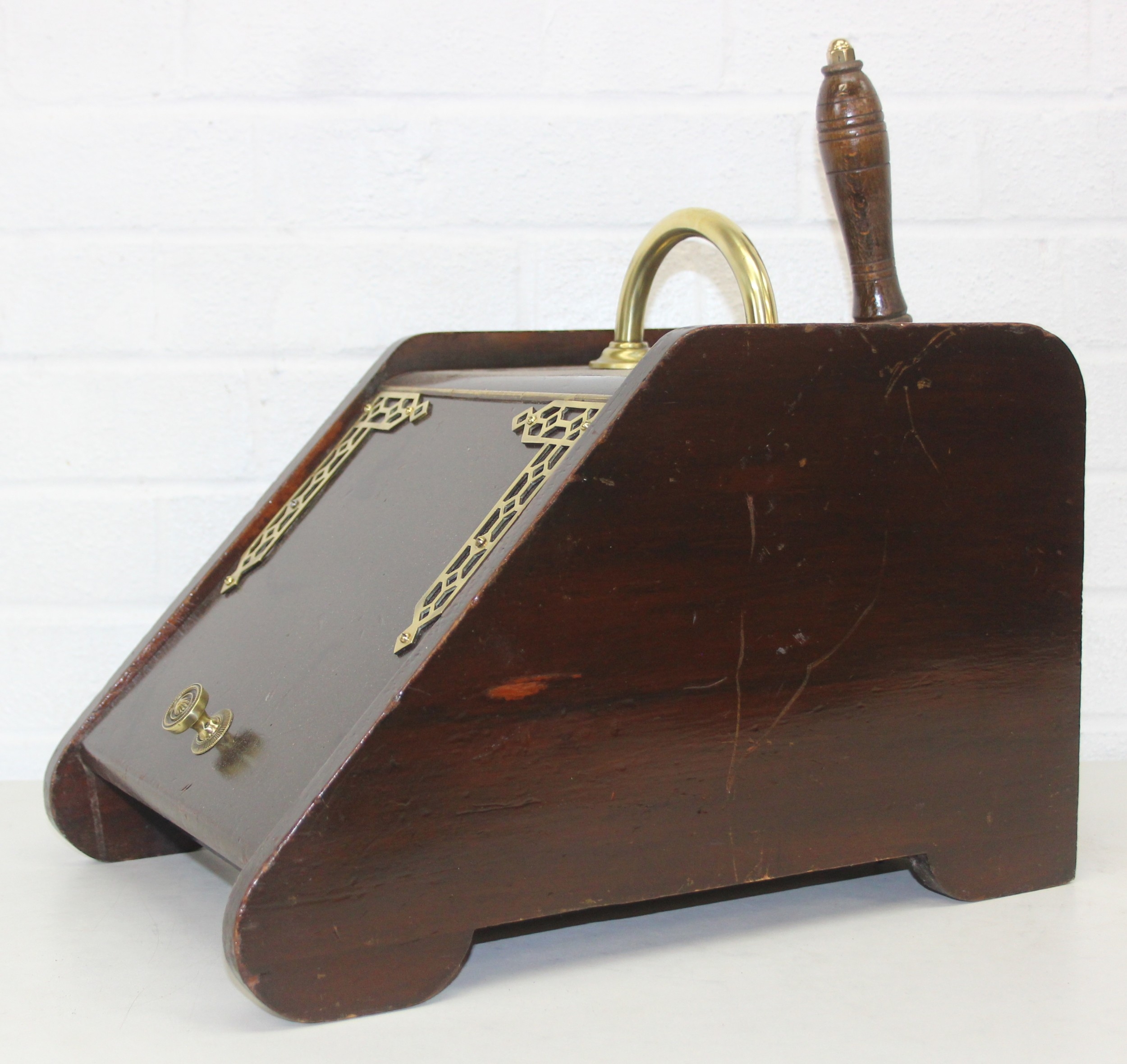 An antique mahogany coal scuttle with polished brass fittings and shovel, 30cm wide x 44cm deep