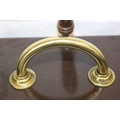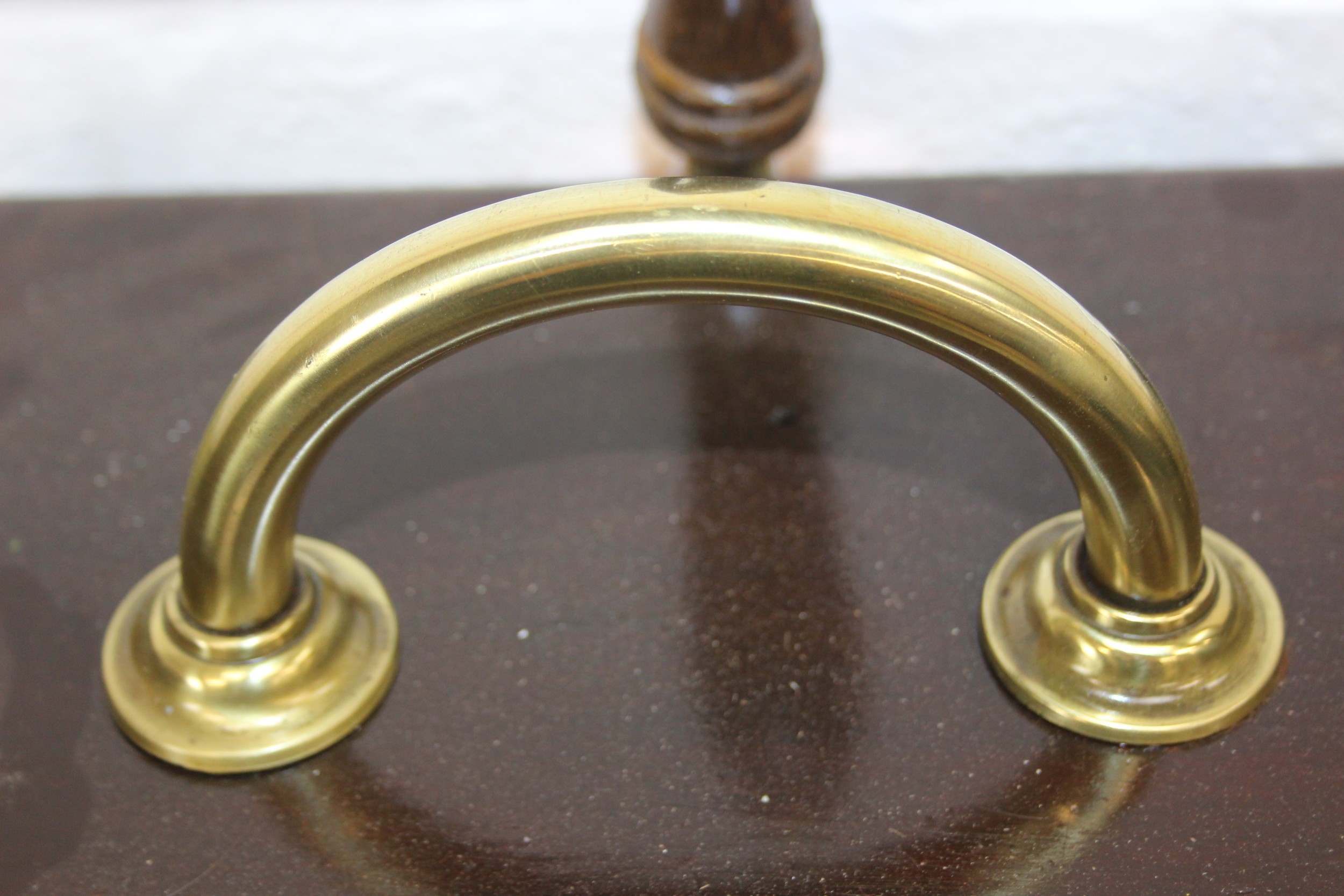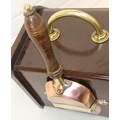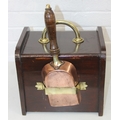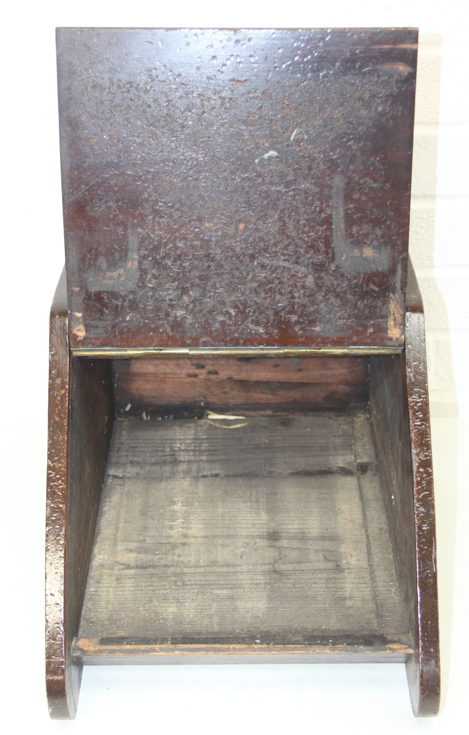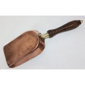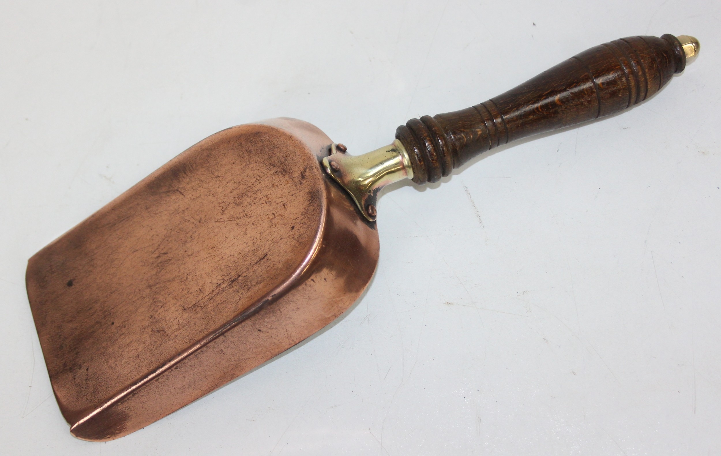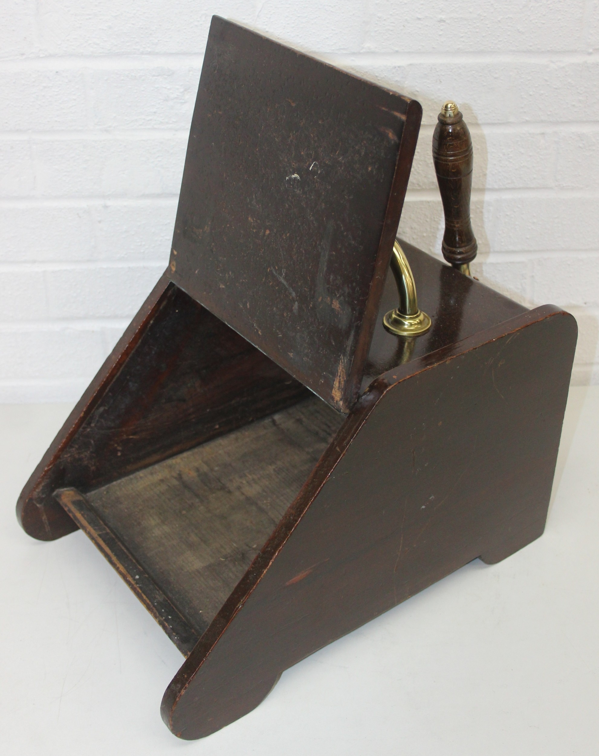 An antique mahogany coal scuttle with polished brass fittings and shovel, 30cm wide x 44cm deep